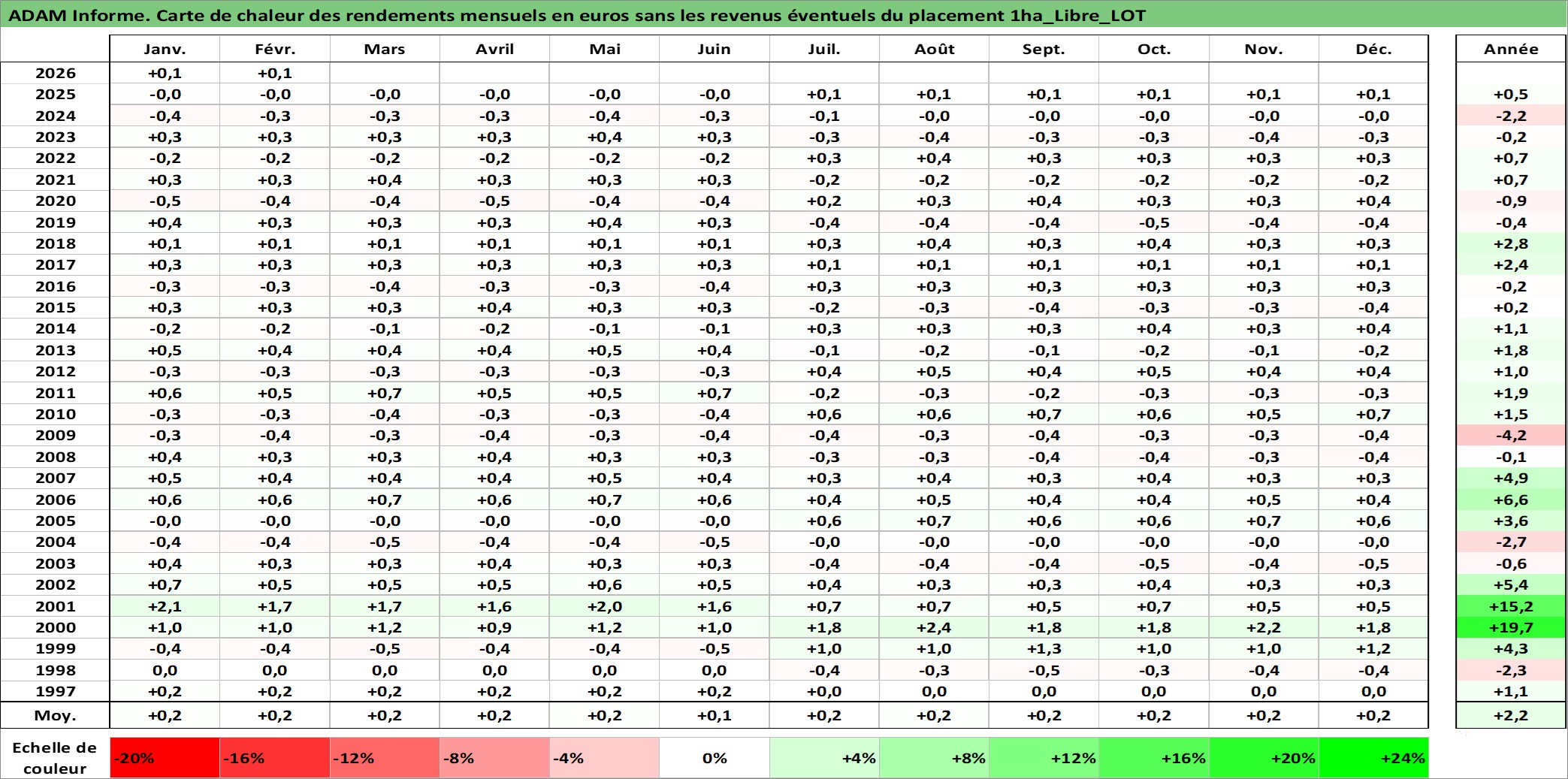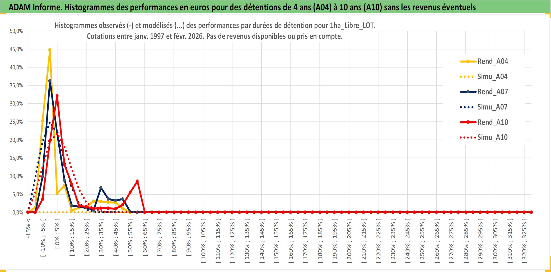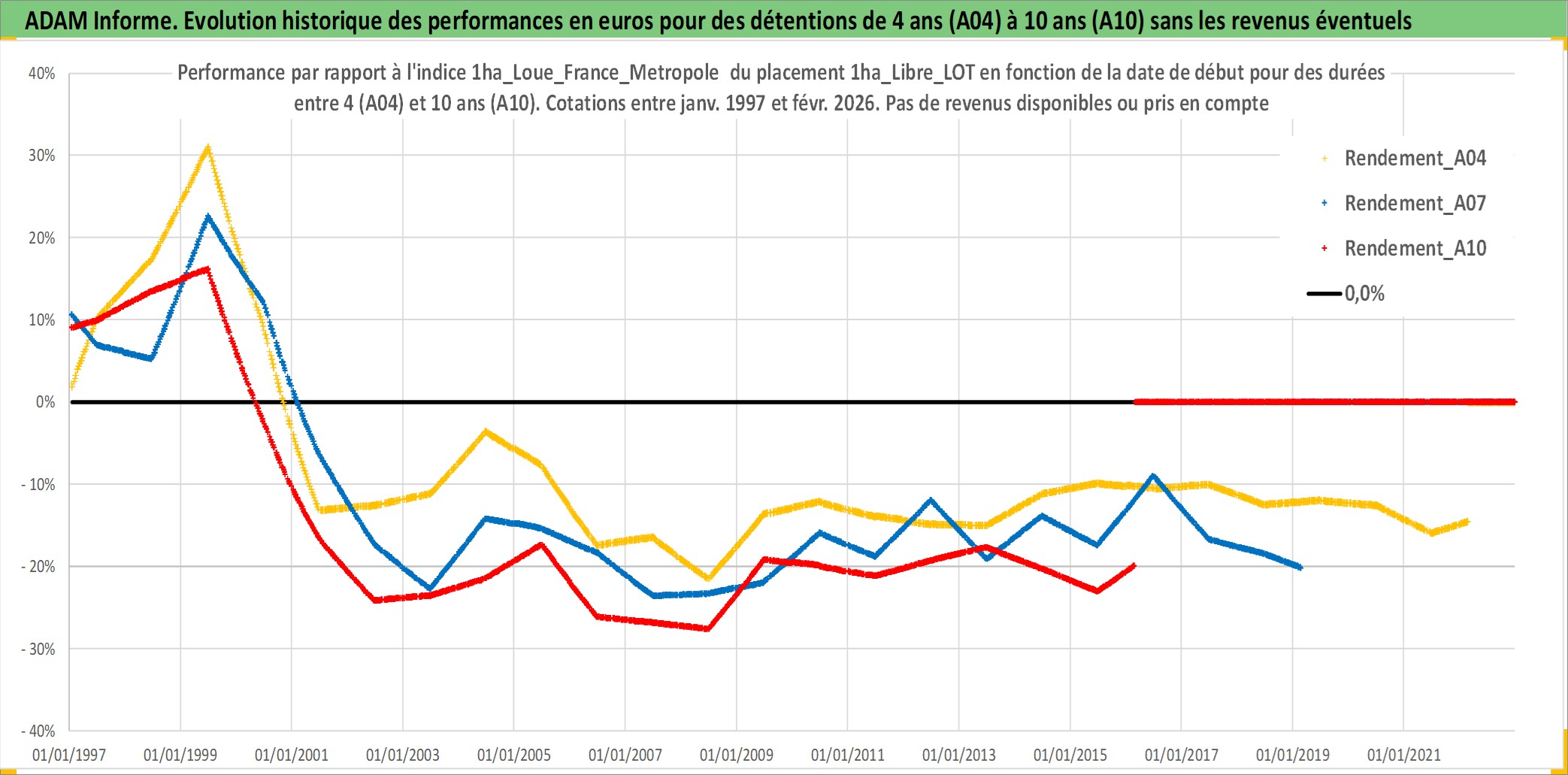 Site dédié aux investisseursPage dédiée sur site financeAnalyse des valorisations hebdomadaires de l'actif 1ha_Libre_LOT. Cet actif est cote en EUR. Les valorisations couvrent les semaines 1997W01 a 2026W09. Les fermages de ce bien foncier sont pris egaux a 2,5% annuels de la valeur venale du bien.
