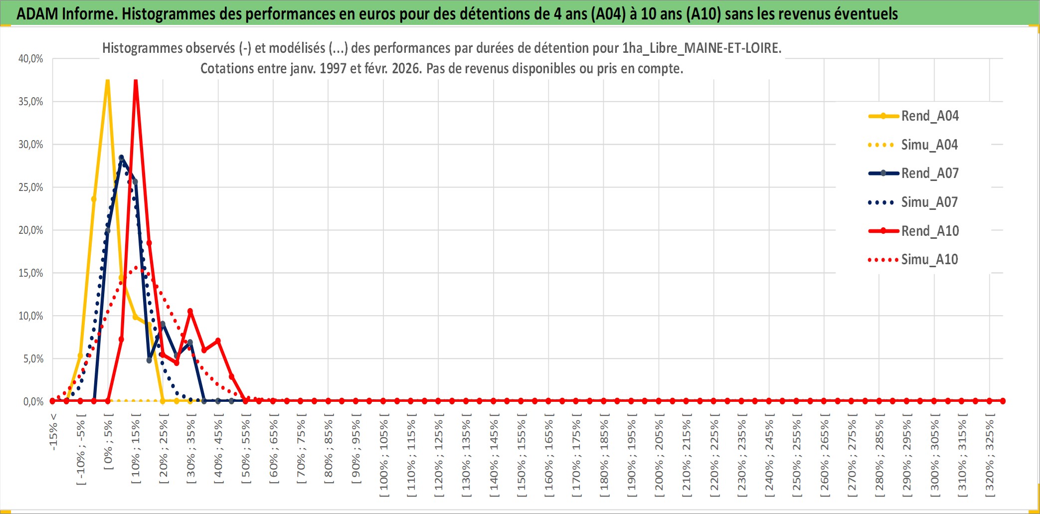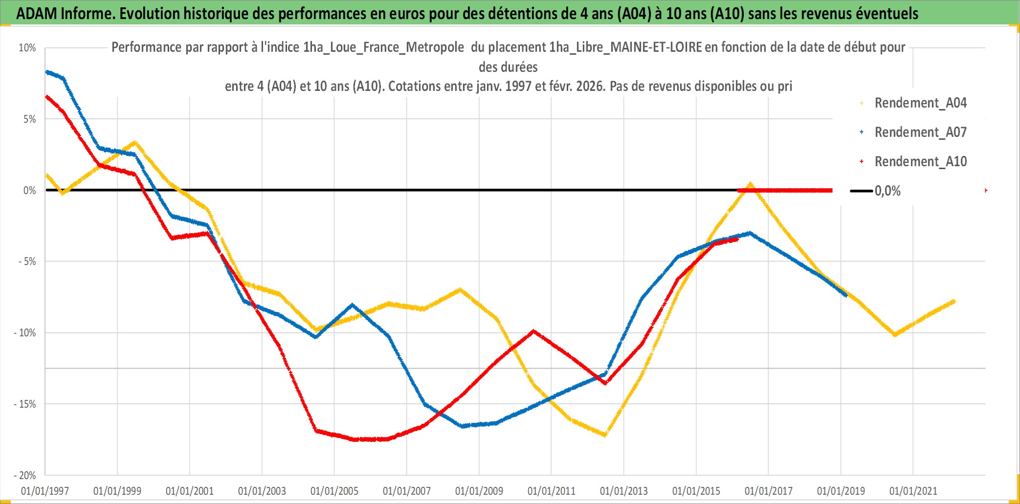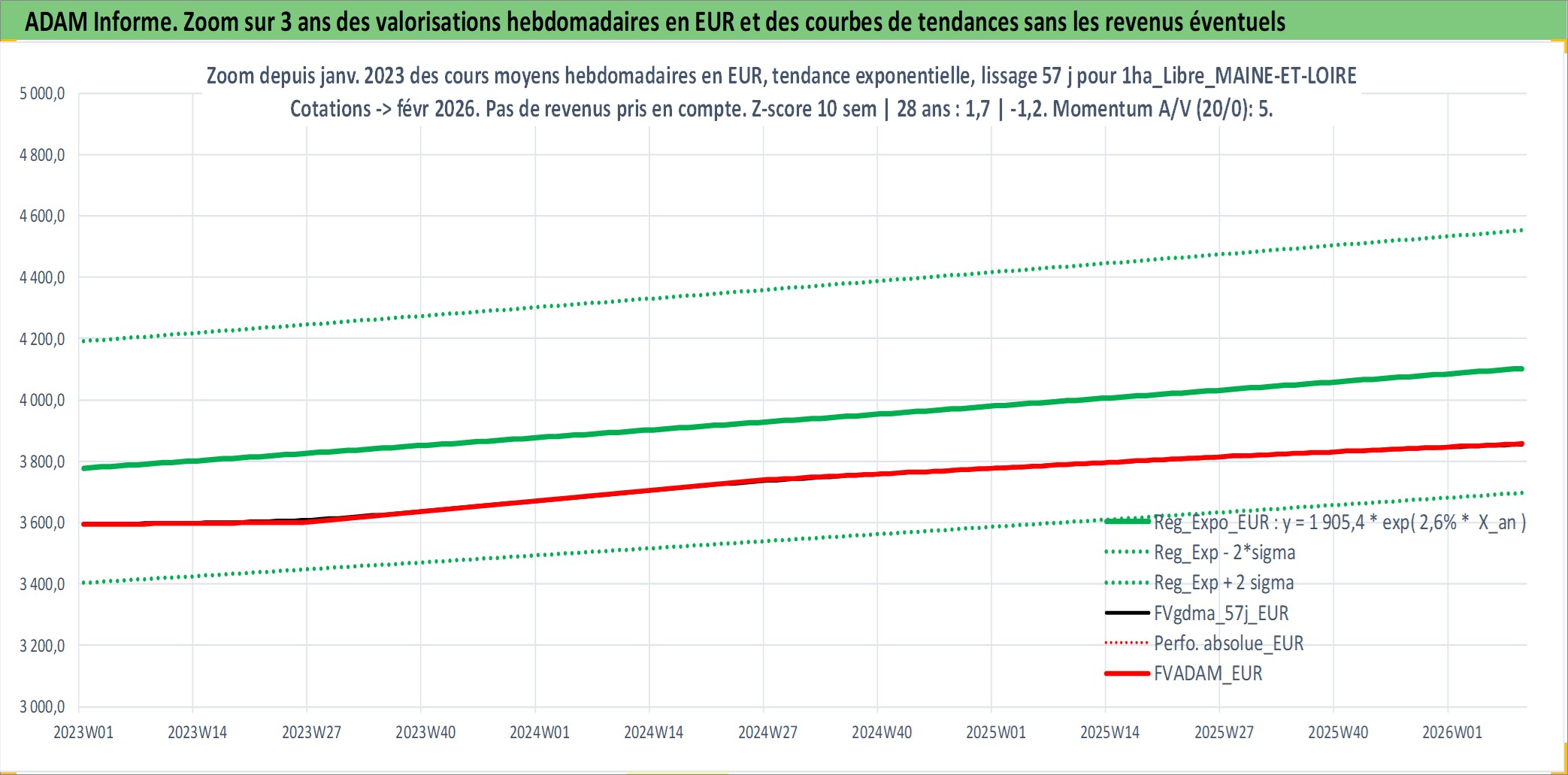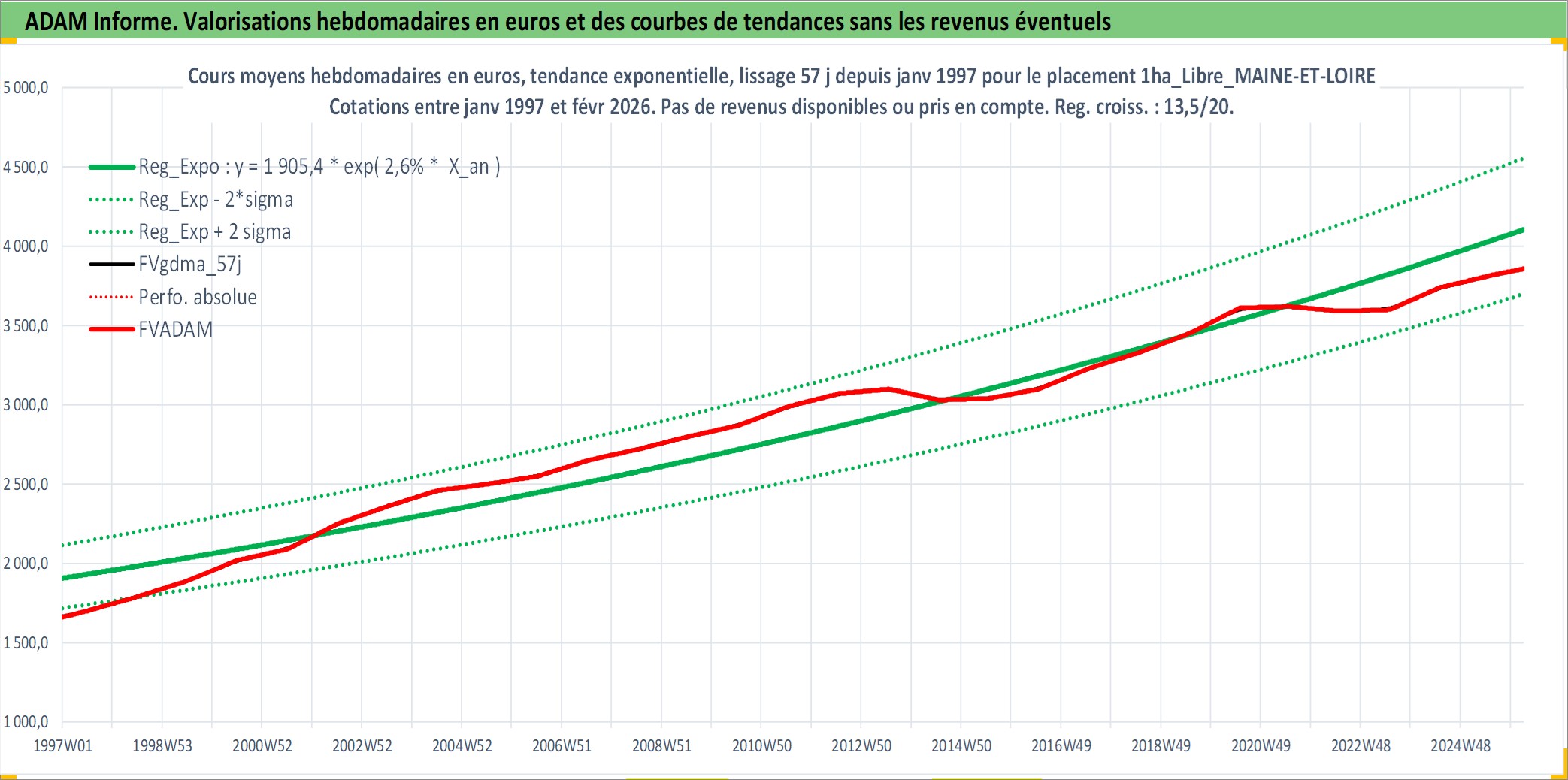 Site dédié aux investisseursPage dédiée sur site financeAnalyse des valorisations hebdomadaires de l'actif 1ha_Libre_MAINE-ET-LOIRE. Cet actif est cote en EUR. Les valorisations couvrent les semaines 1997W01 a 2026W09. Les fermages de ce bien foncier sont pris egaux a 2,5% annuels de la valeur venale du bien.