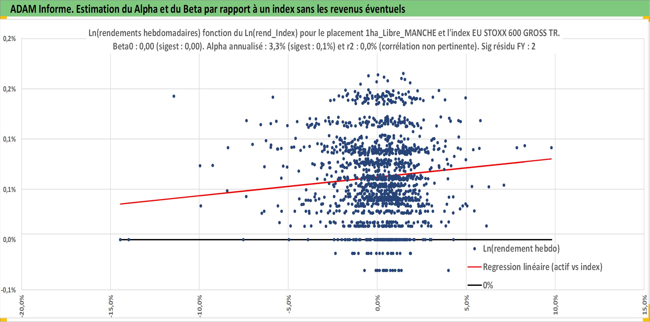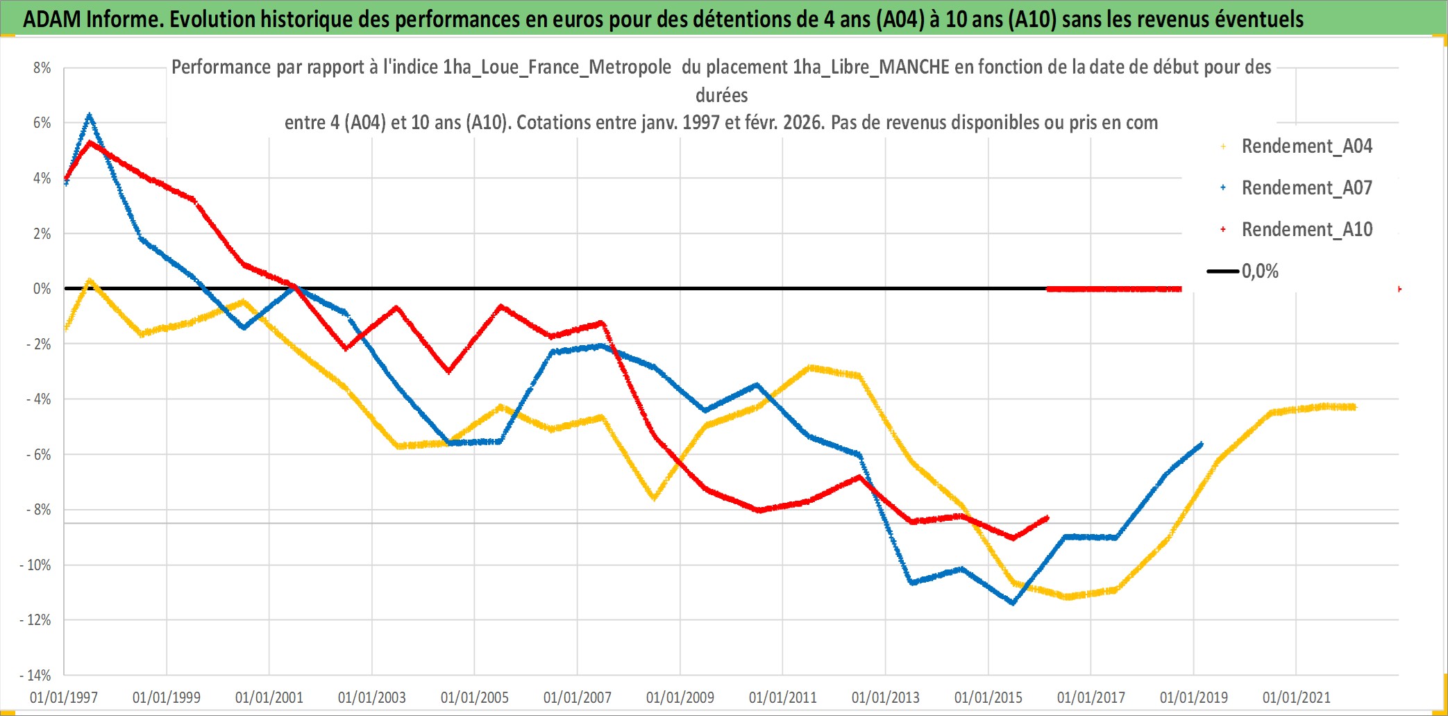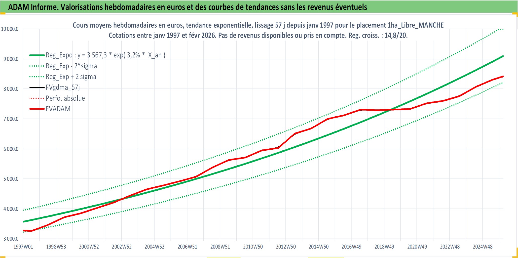Site dédié aux investisseursPage dédiée sur site financeAnalyse des valorisations hebdomadaires de l'actif 1ha_Libre_MANCHE. Cet actif est cote en EUR. Les valorisations couvrent les semaines 1997W01 a 2026W09. Les fermages de ce bien foncier sont pris egaux a 2,5% annuels de la valeur venale du bien.