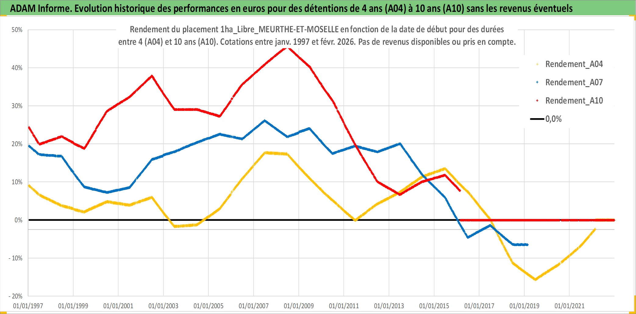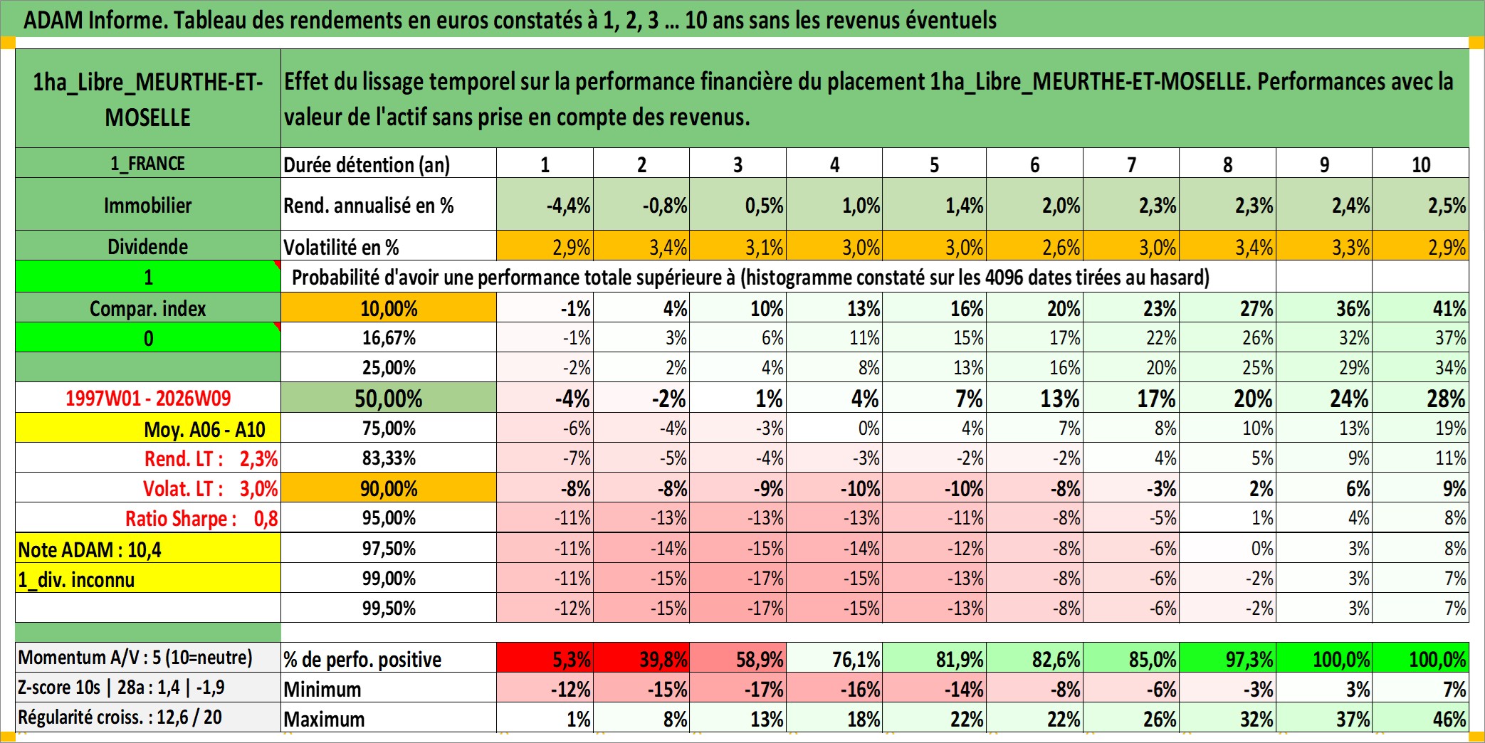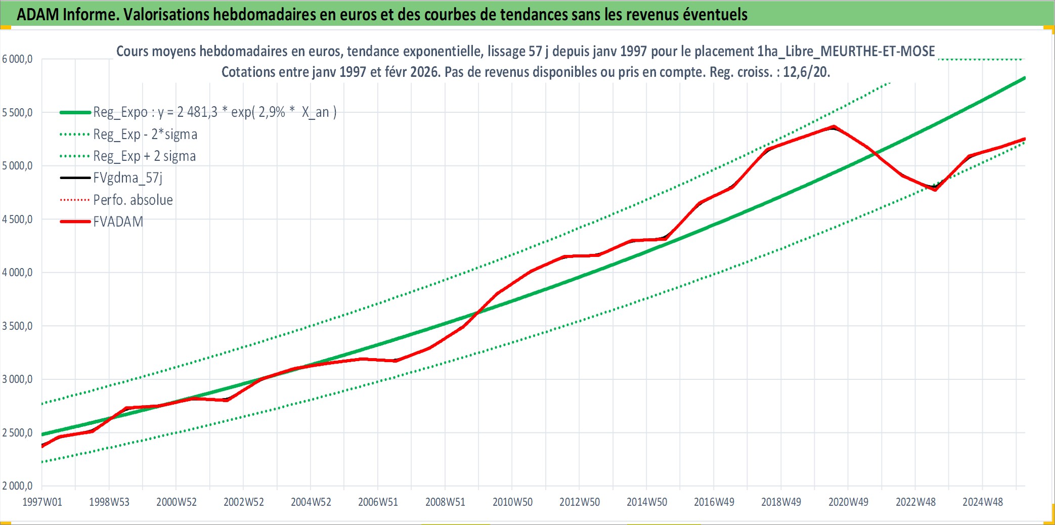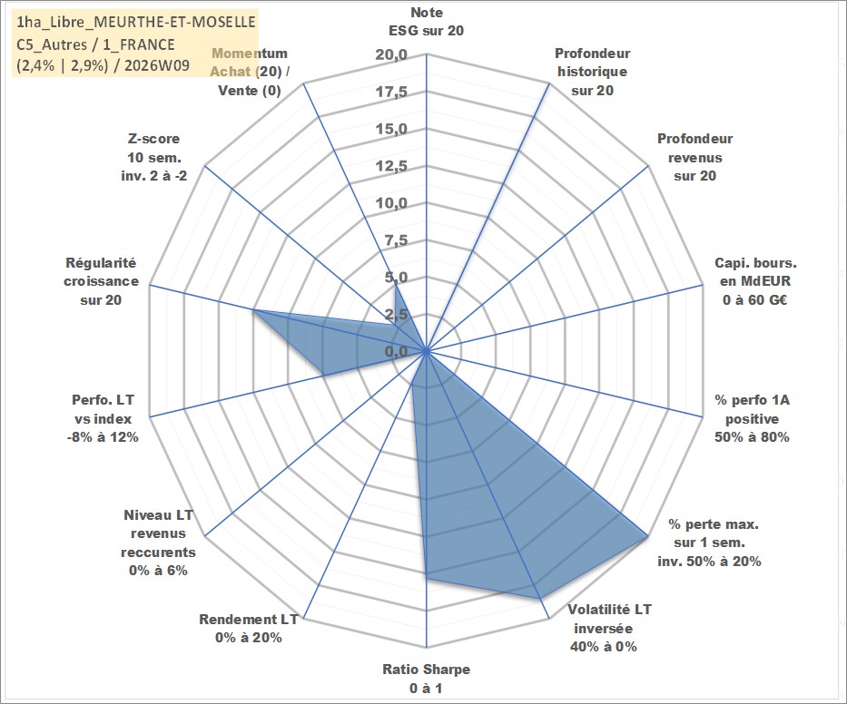 Site dédié aux investisseursPage dédiée sur site financeAnalyse des valorisations hebdomadaires de l'actif 1ha_Libre_MEURTHE-ET-MOSELLE. Cet actif est cote en EUR. Les valorisations couvrent les semaines 1997W01 a 2026W09. Les fermages de ce bien foncier sont pris egaux a 2,5% annuels de la valeur venale du bien.