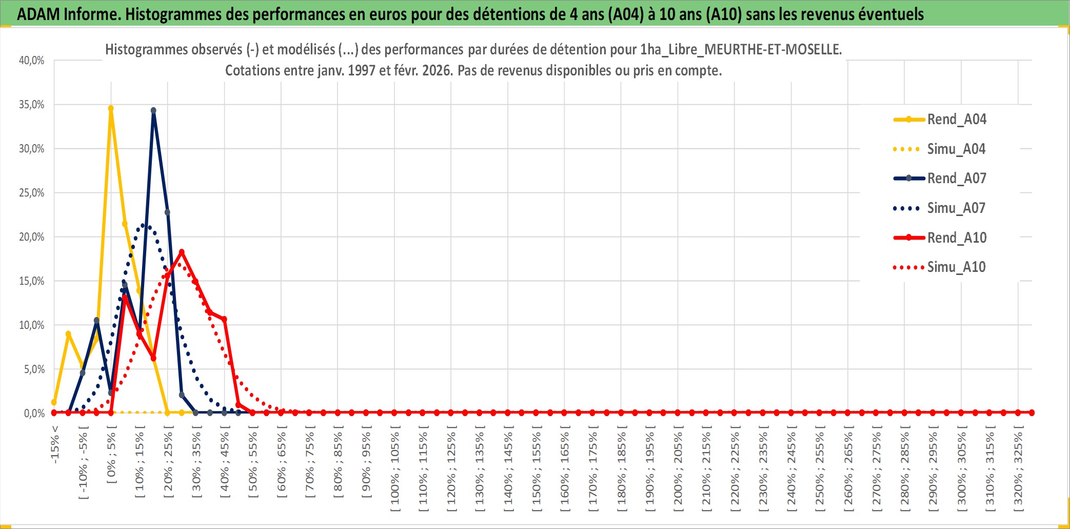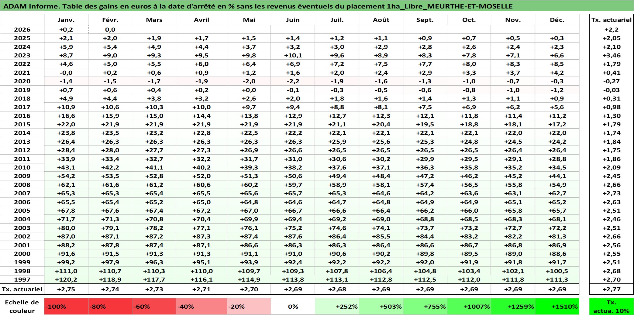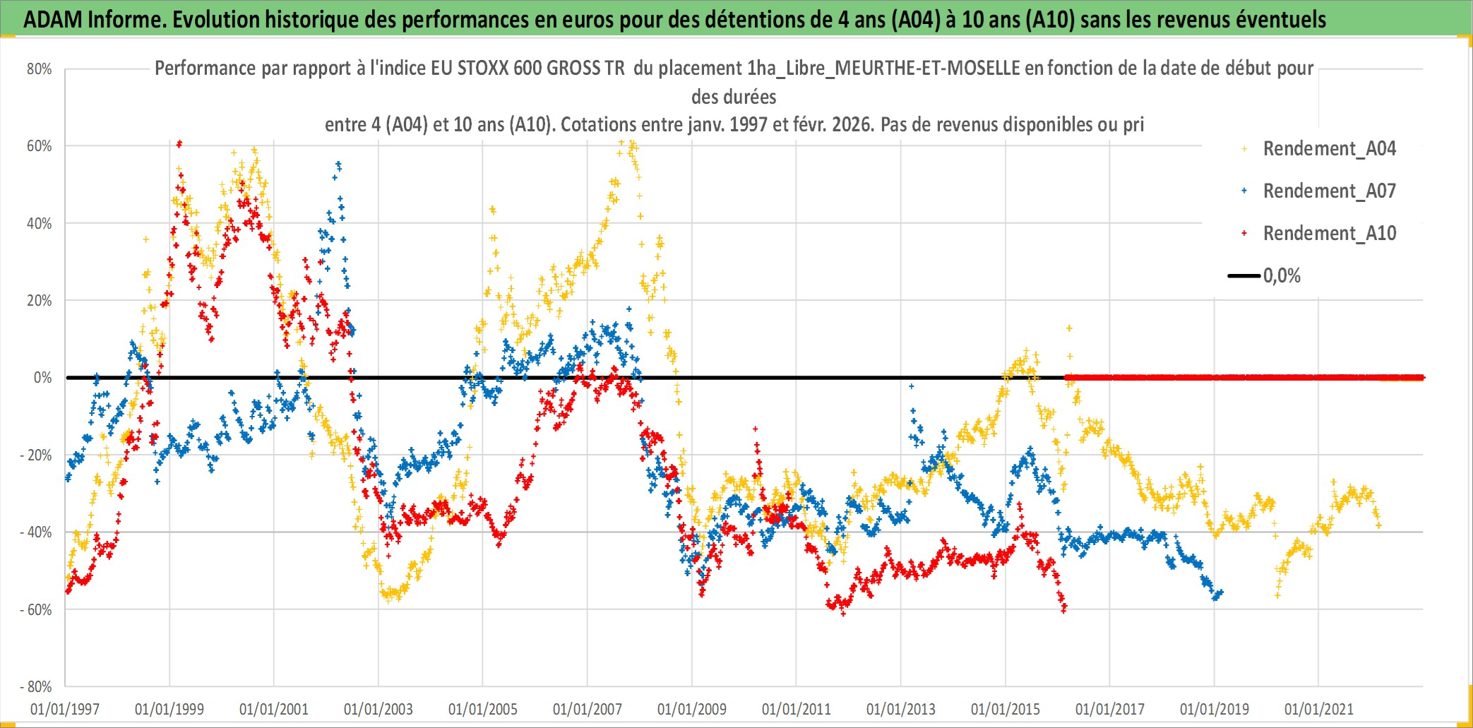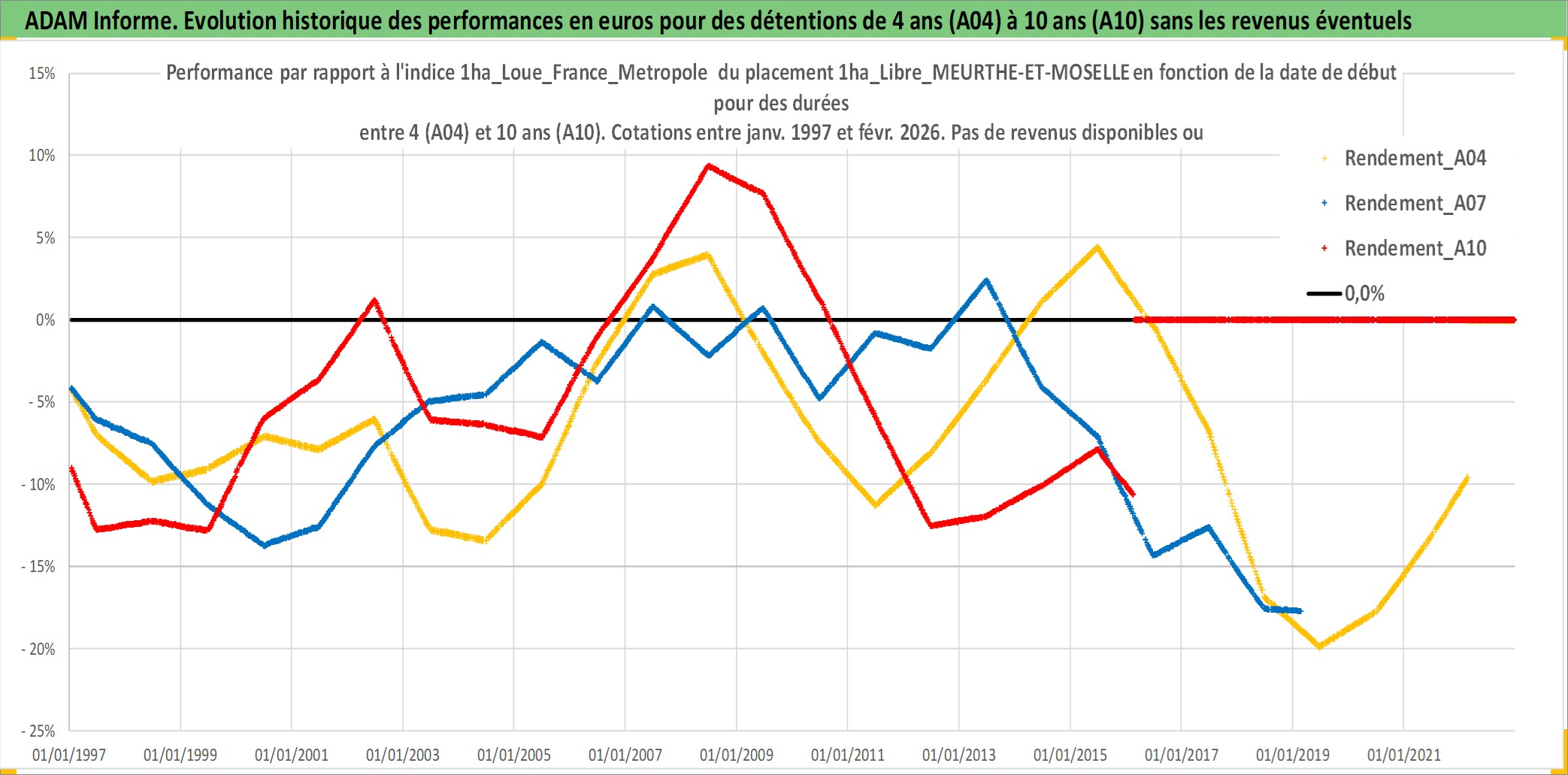 Site dédié aux investisseursPage dédiée sur site financeAnalyse des valorisations hebdomadaires de l'actif 1ha_Libre_MEURTHE-ET-MOSELLE. Cet actif est cote en EUR. Les valorisations couvrent les semaines 1997W01 a 2026W09. Les fermages de ce bien foncier sont pris egaux a 2,5% annuels de la valeur venale du bien.
