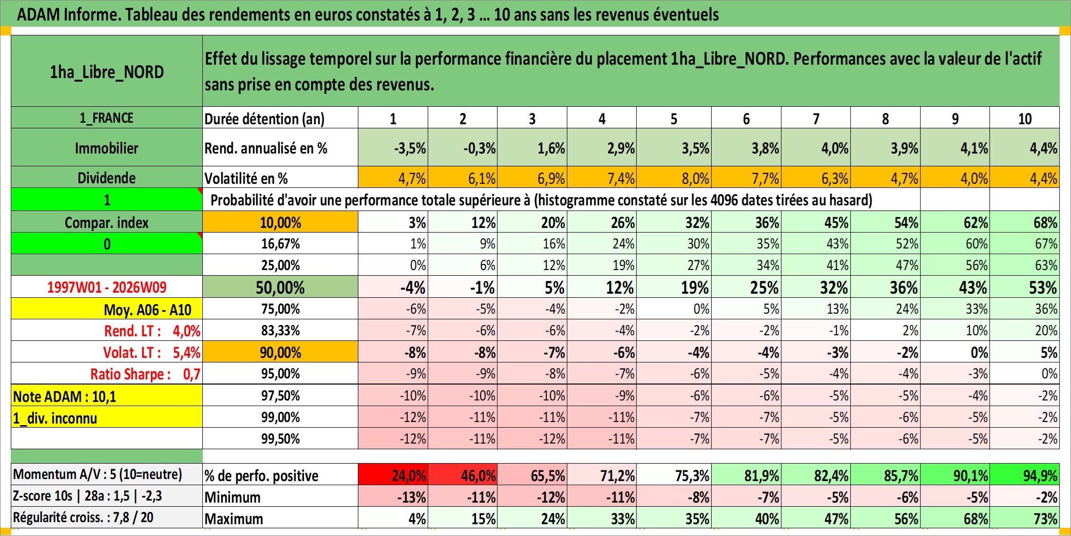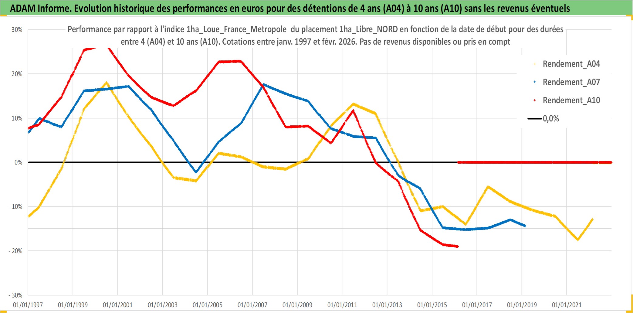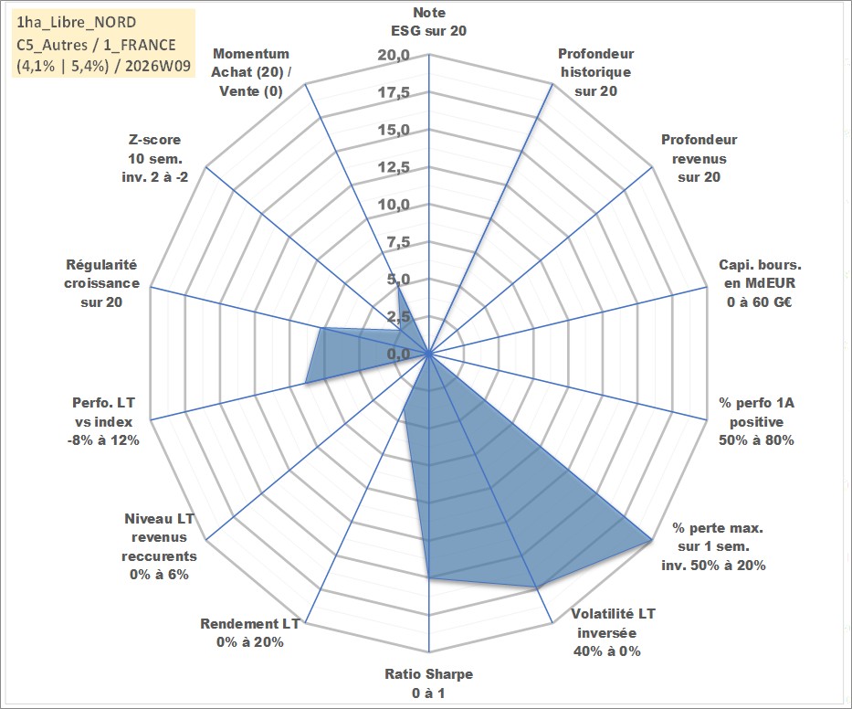 Site dédié aux investisseursPage dédiée sur site financeAnalyse des valorisations hebdomadaires de l'actif 1ha_Libre_NORD. Cet actif est cote en EUR. Les valorisations couvrent les semaines 1997W01 a 2026W09. Les fermages de ce bien foncier sont pris egaux a 2,5% annuels de la valeur venale du bien.