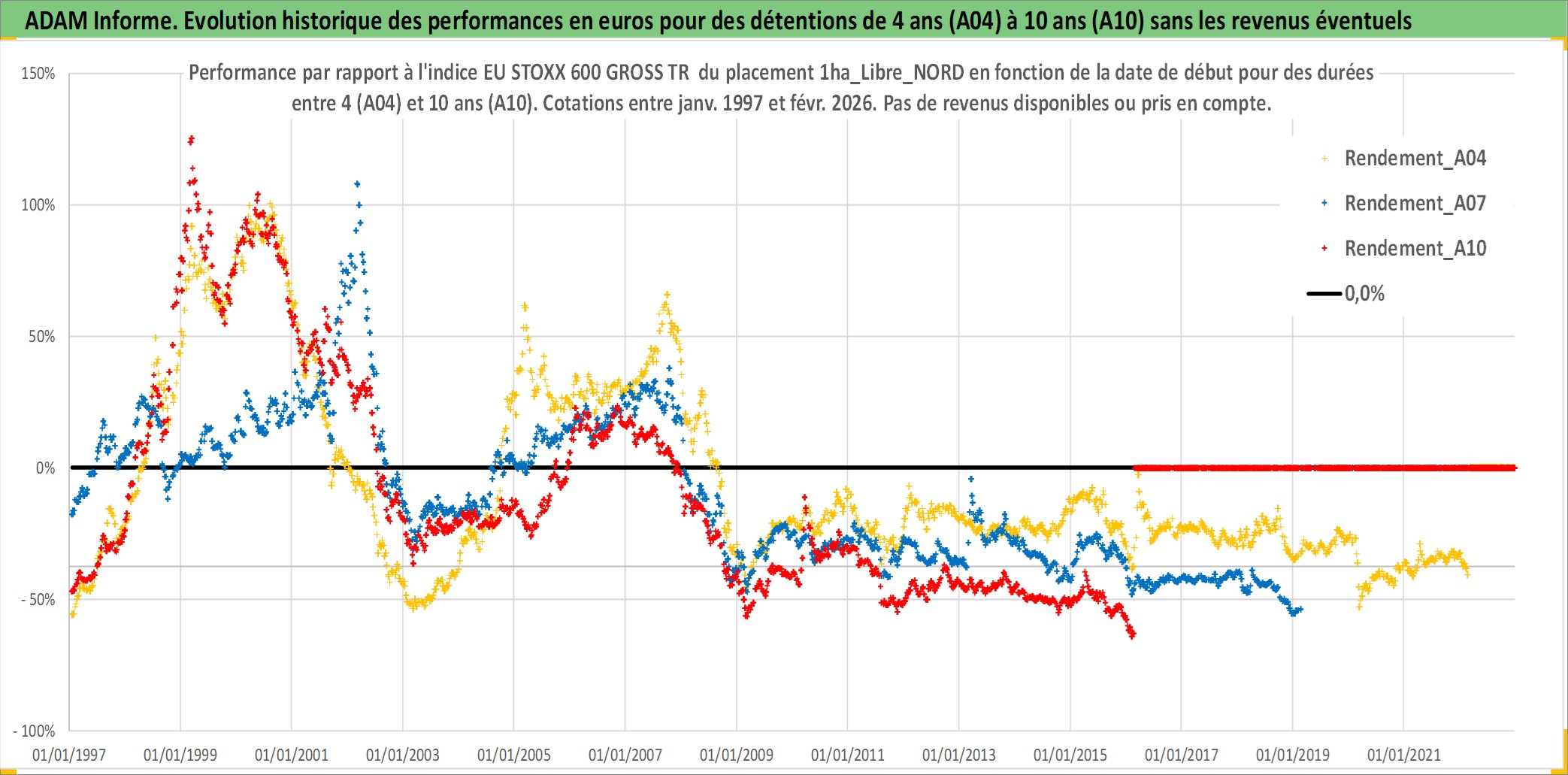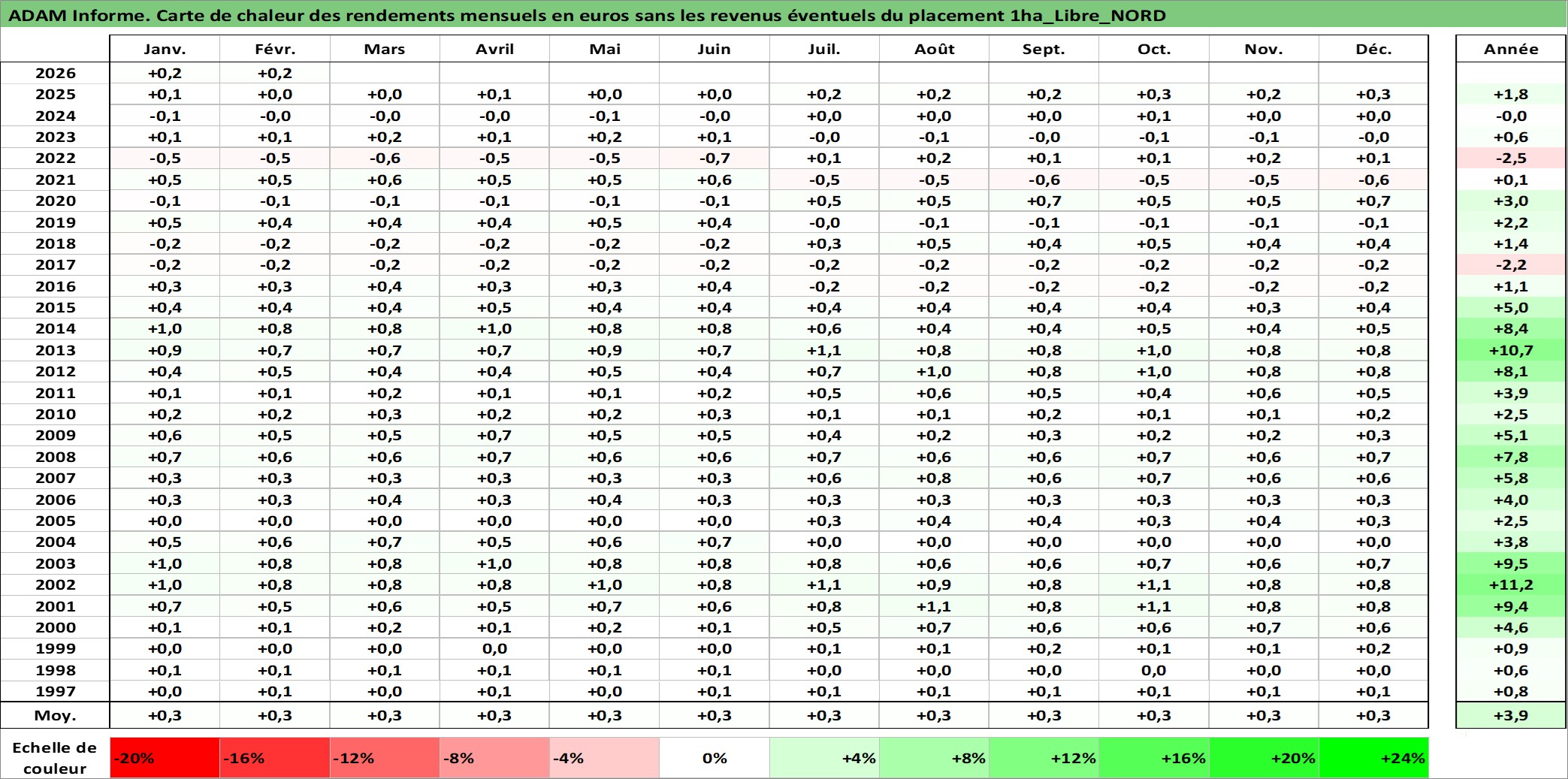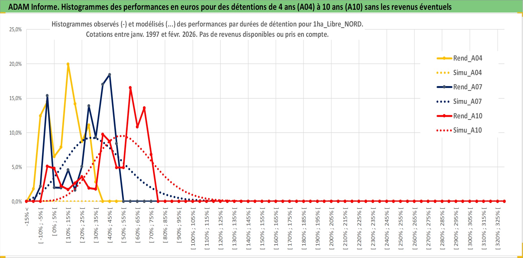 Site dédié aux investisseursPage dédiée sur site financeAnalyse des valorisations hebdomadaires de l'actif 1ha_Libre_NORD. Cet actif est cote en EUR. Les valorisations couvrent les semaines 1997W01 a 2026W09. Les fermages de ce bien foncier sont pris egaux a 2,5% annuels de la valeur venale du bien.