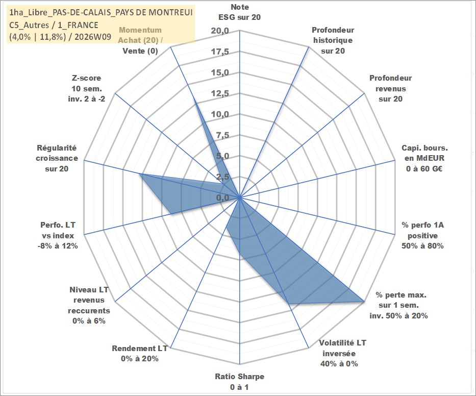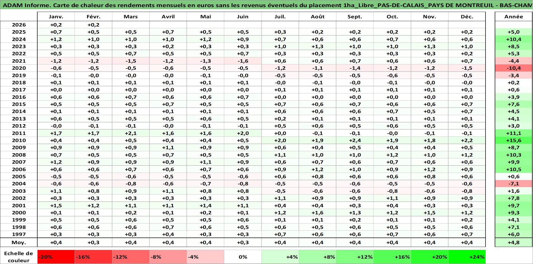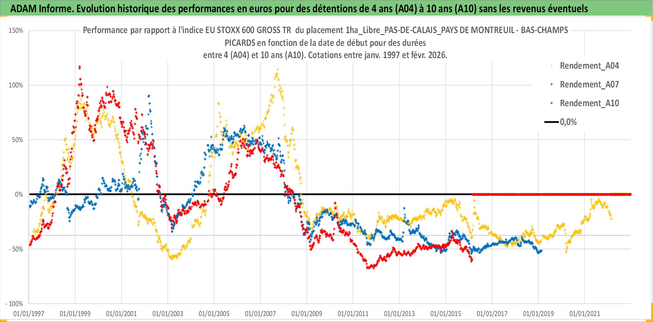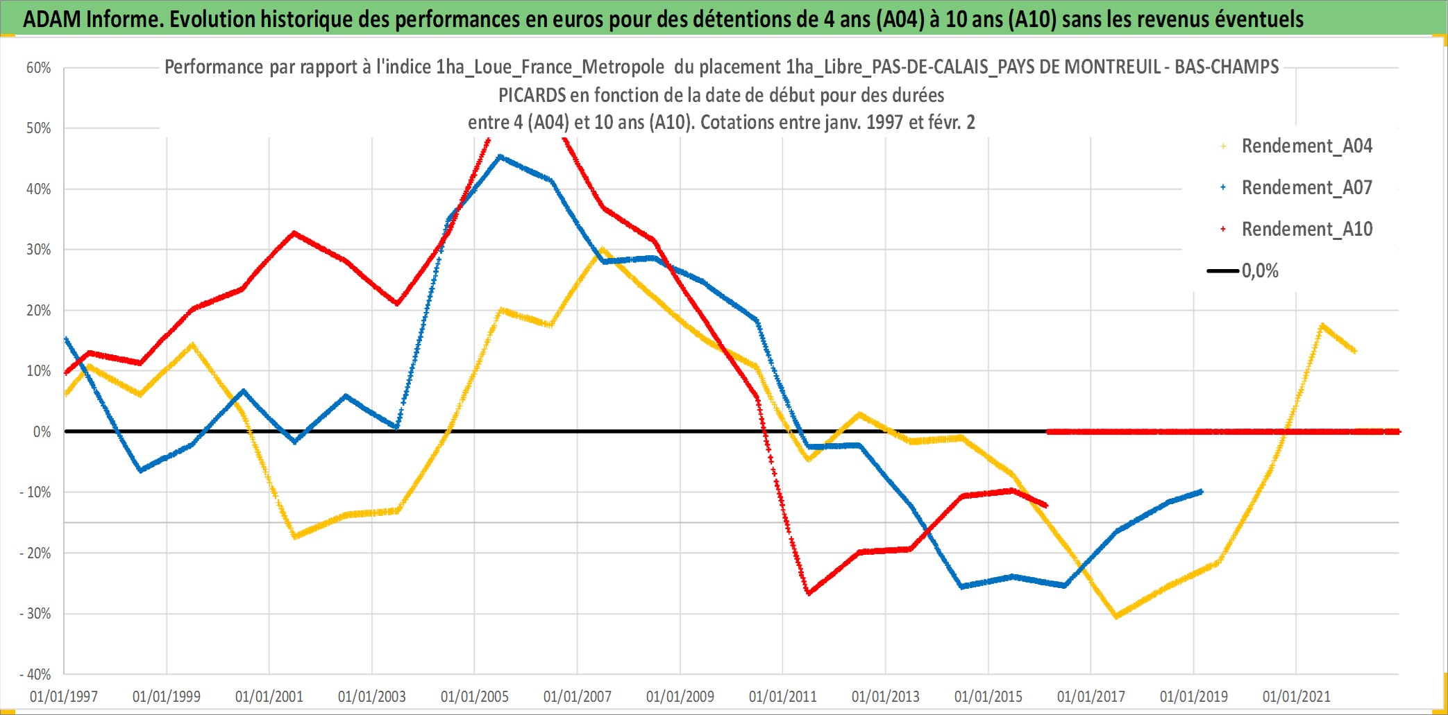Site dédié aux investisseursPage dédiée sur site financeAnalyse des valorisations hebdomadaires de l'actif 1ha_Libre_PAS-DE-CALAIS_PAYS DE MONTREUIL - BAS-CHAMPS PICARDS. Cet actif est cote en EUR. Les valorisations couvrent les semaines 1997W01 a 2026W09. Les fermages de ce bien foncier sont pris egaux a 2,5% annuels de la valeur venale du bien.