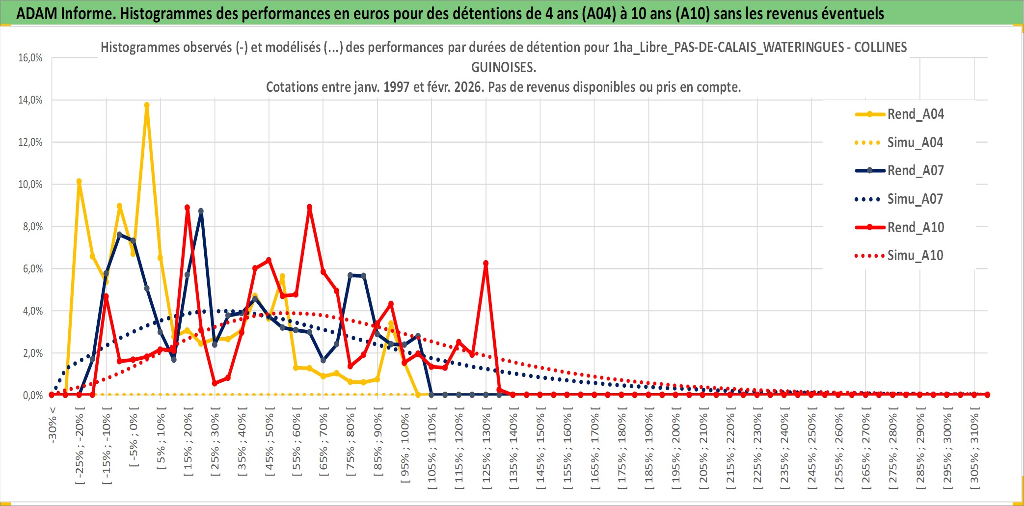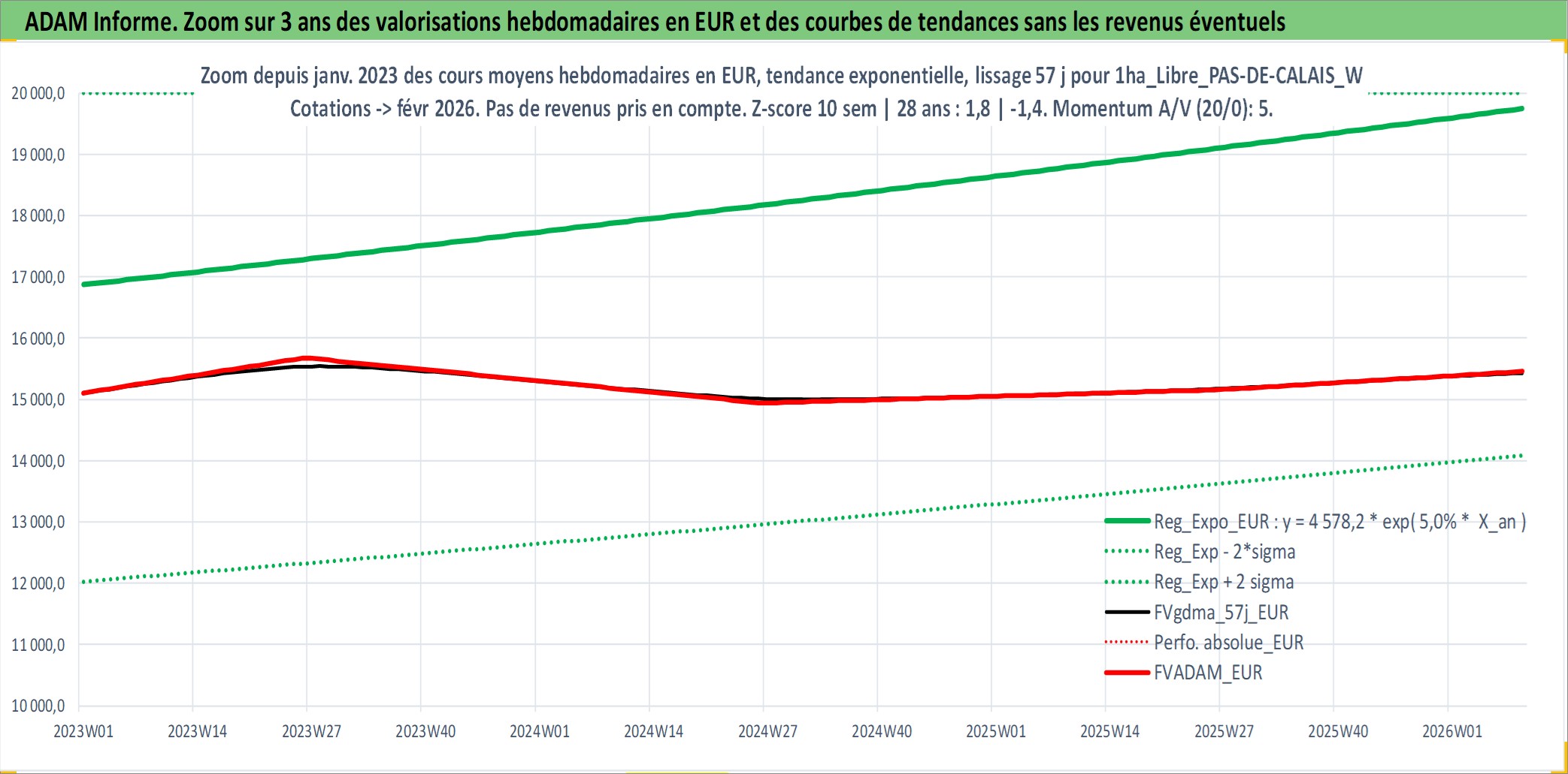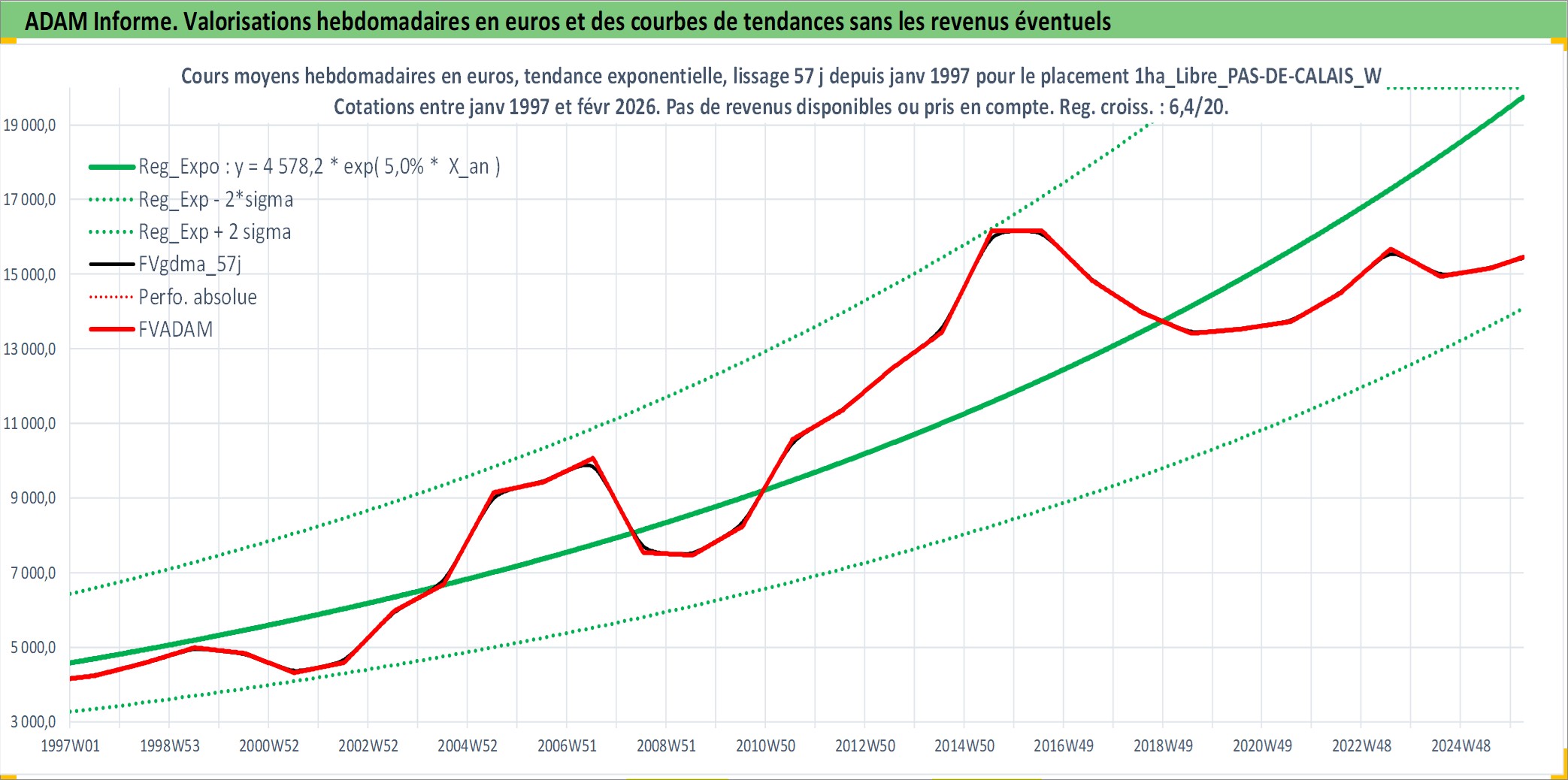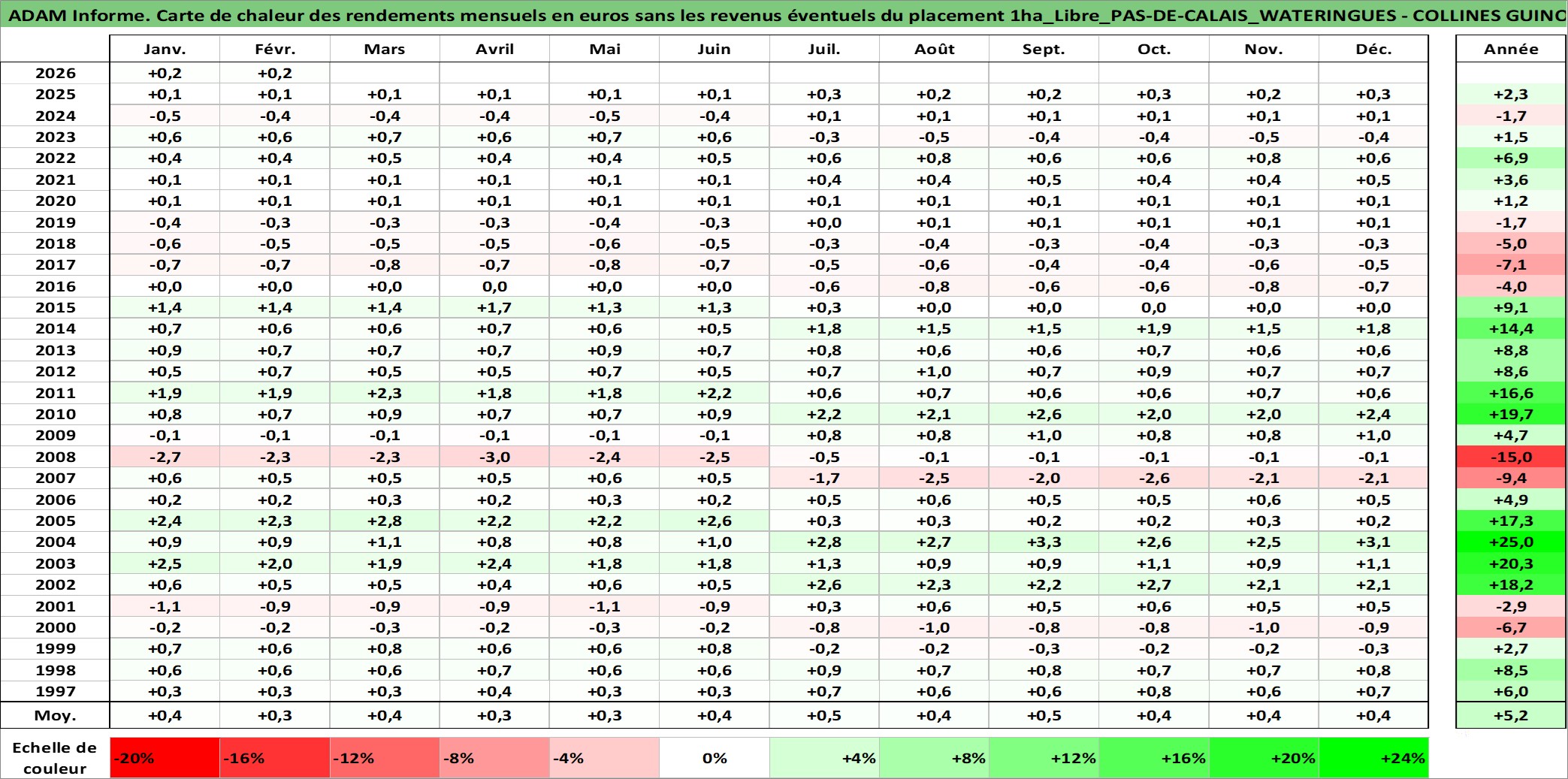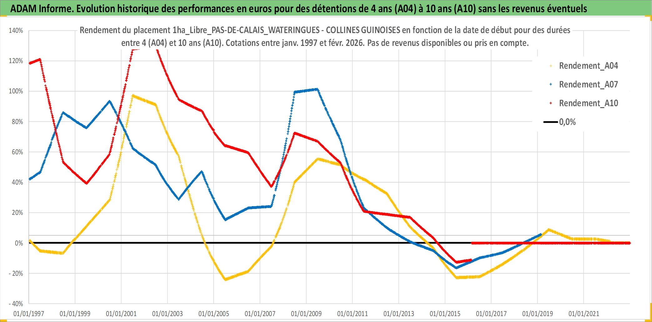 Site dédié aux investisseursPage dédiée sur site financeAnalyse des valorisations hebdomadaires de l'actif 1ha_Libre_PAS-DE-CALAIS_WATERINGUES - COLLINES GUINOISES. Cet actif est cote en EUR. Les valorisations couvrent les semaines 1997W01 a 2026W09. Les fermages de ce bien foncier sont pris egaux a 2,5% annuels de la valeur venale du bien.