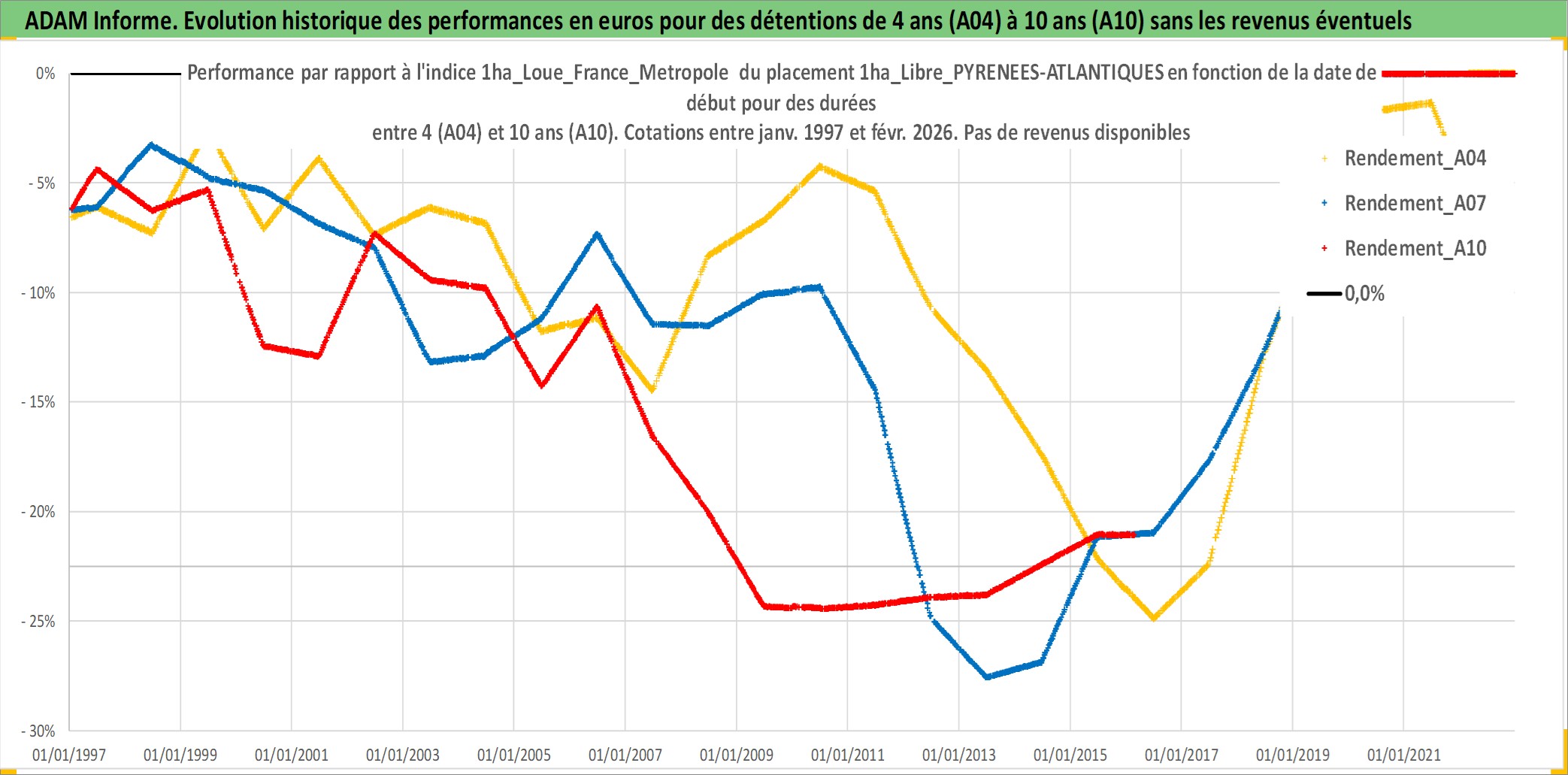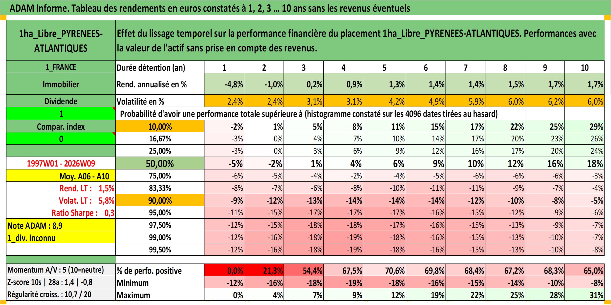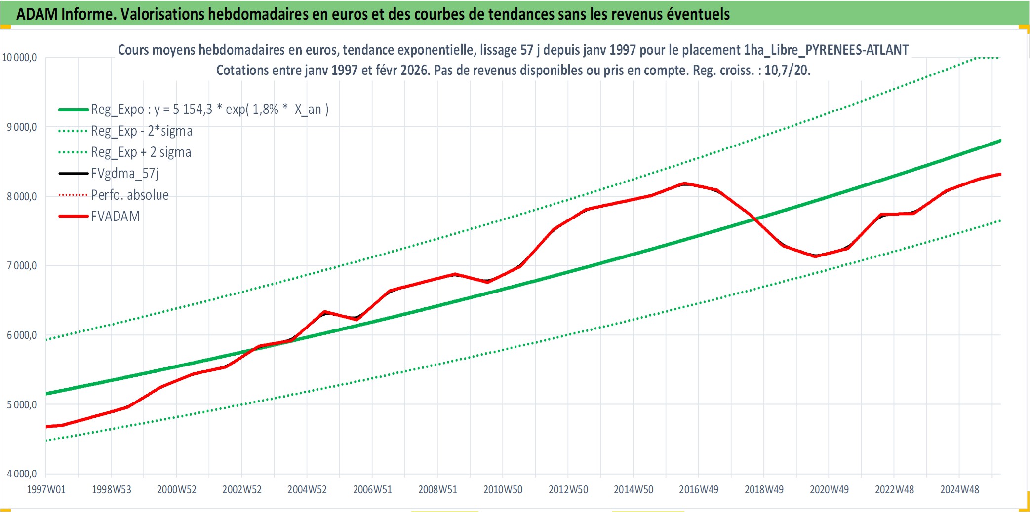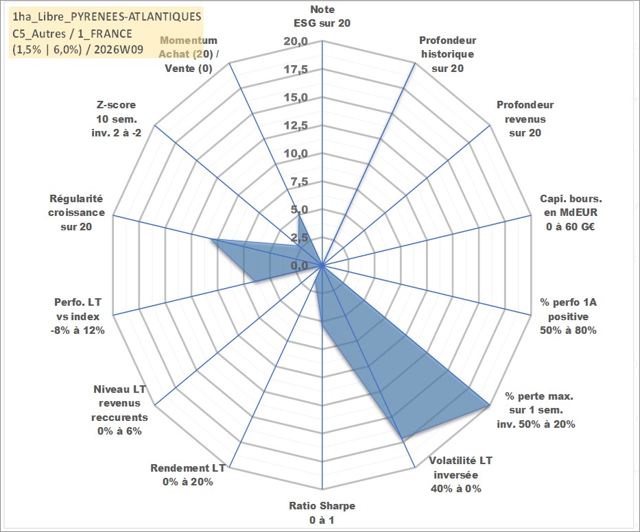 Site dédié aux investisseursPage dédiée sur site financeAnalyse des valorisations hebdomadaires de l'actif 1ha_Libre_PYRENEES-ATLANTIQUES. Cet actif est cote en EUR. Les valorisations couvrent les semaines 1997W01 a 2026W09. Les fermages de ce bien foncier sont pris egaux a 2,5% annuels de la valeur venale du bien.