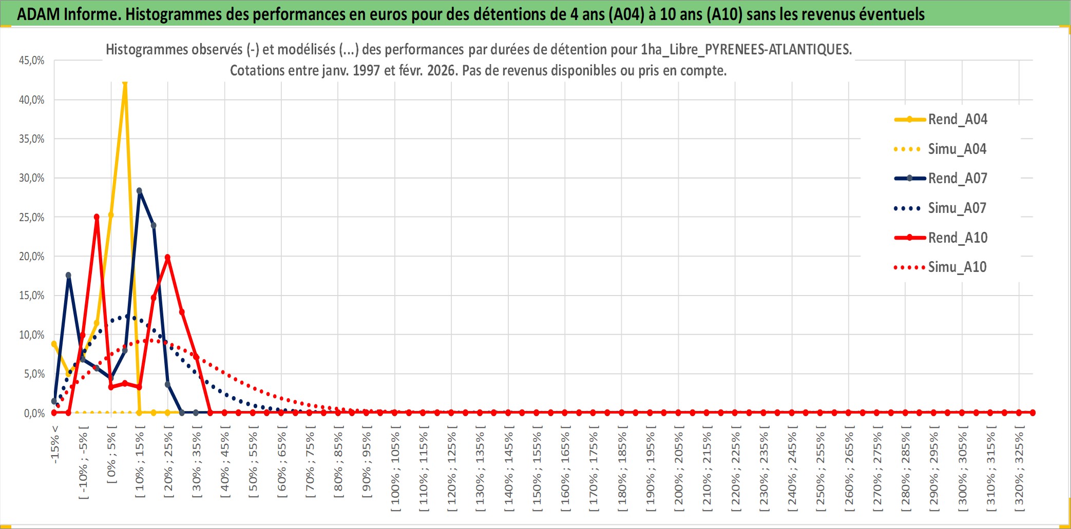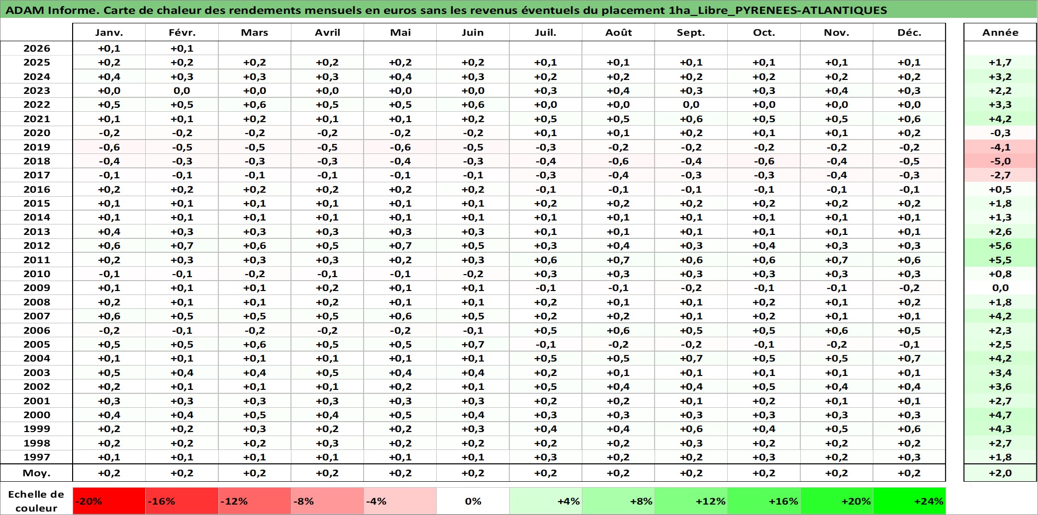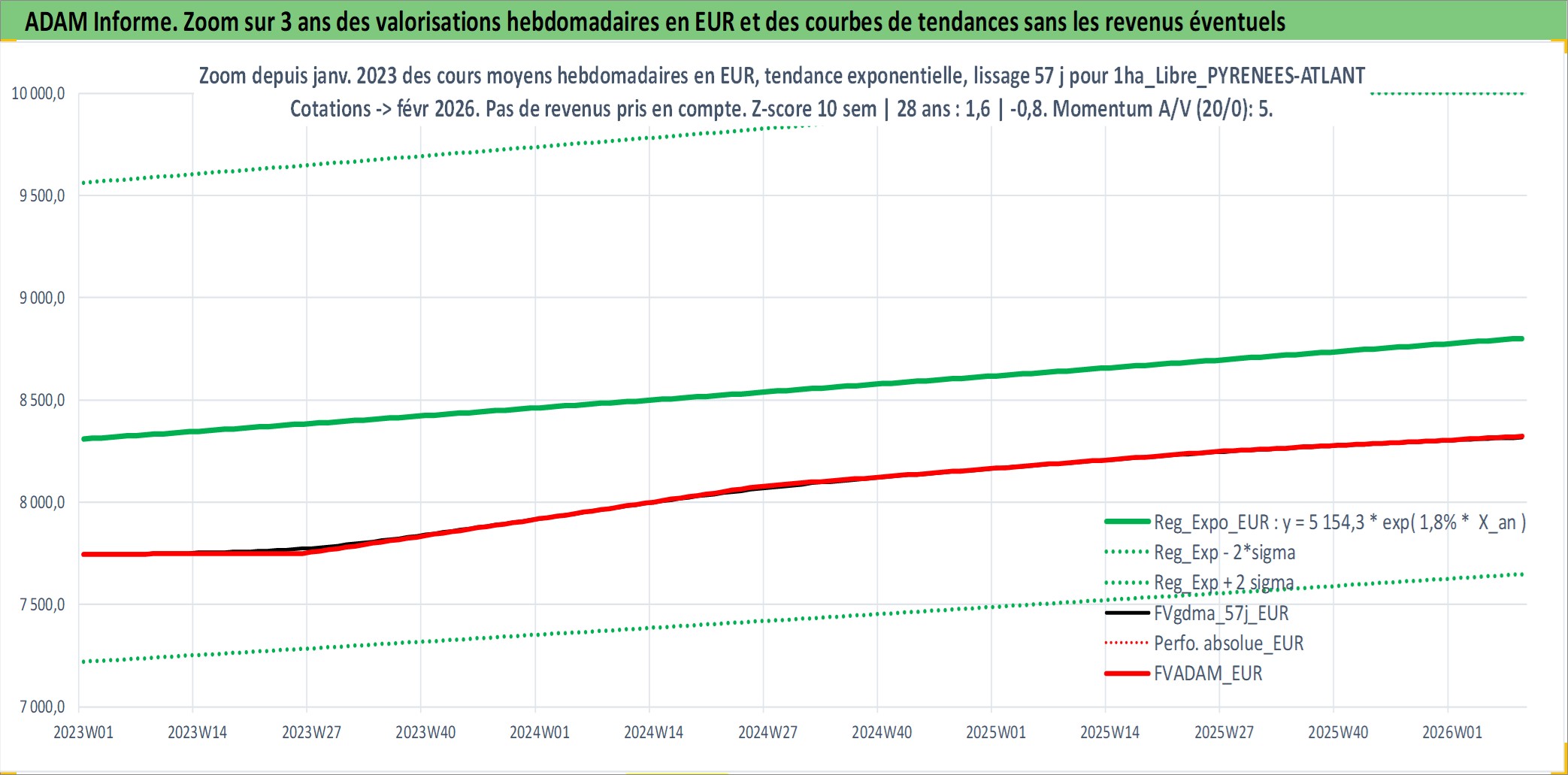 Site dédié aux investisseursPage dédiée sur site financeAnalyse des valorisations hebdomadaires de l'actif 1ha_Libre_PYRENEES-ATLANTIQUES. Cet actif est cote en EUR. Les valorisations couvrent les semaines 1997W01 a 2026W09. Les fermages de ce bien foncier sont pris egaux a 2,5% annuels de la valeur venale du bien.