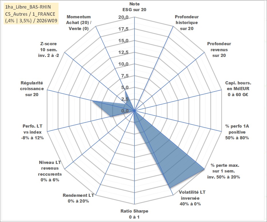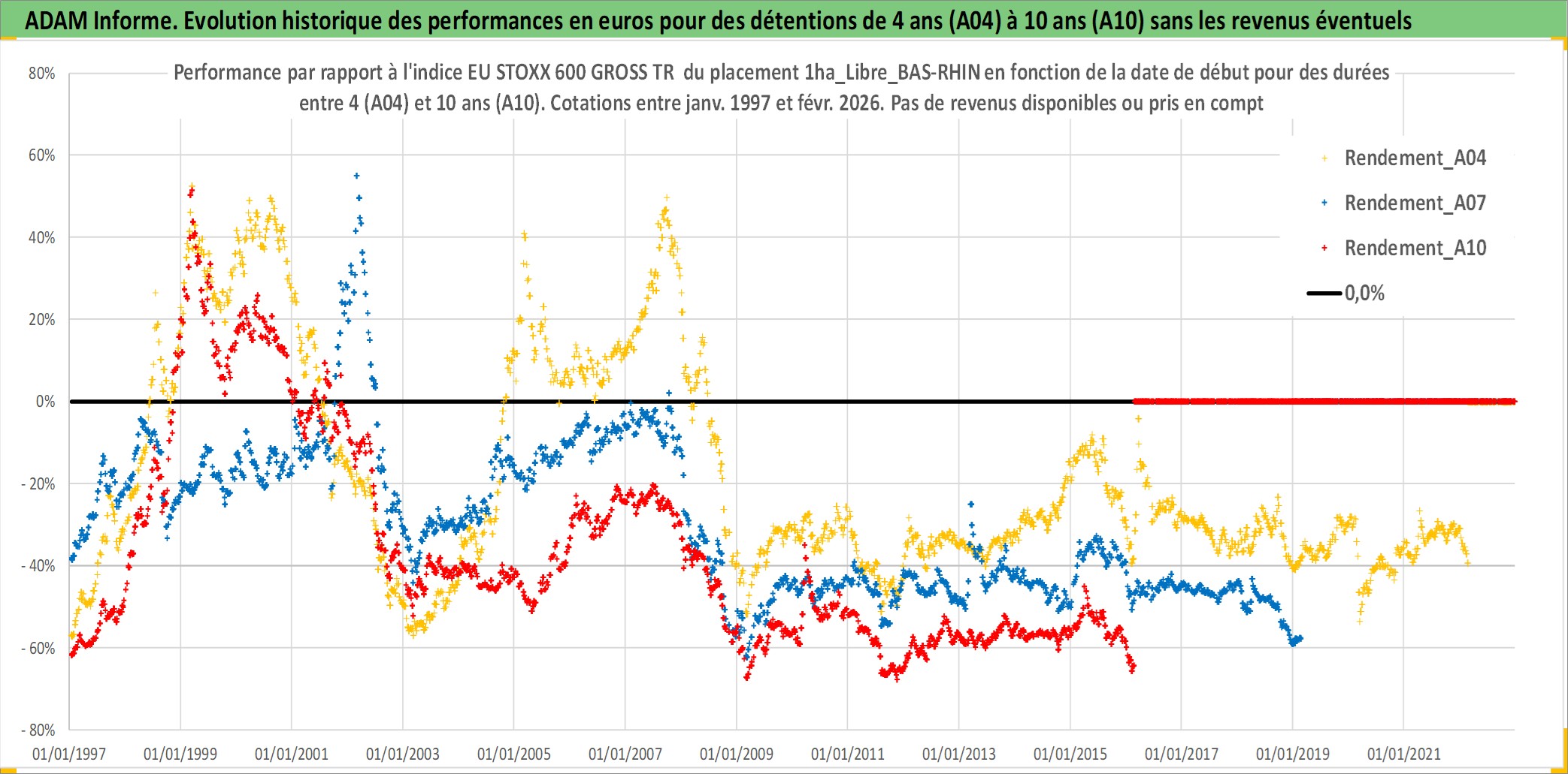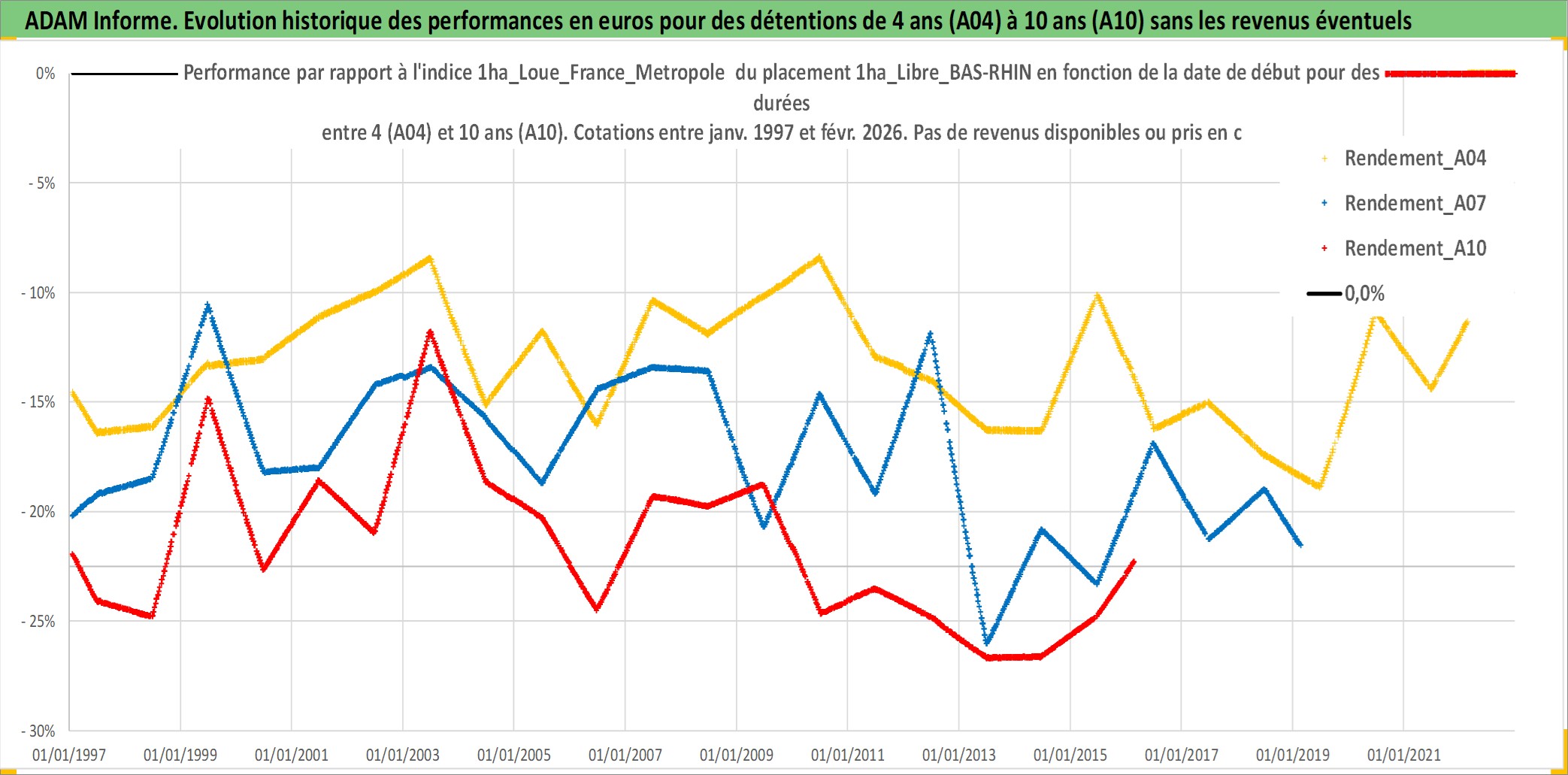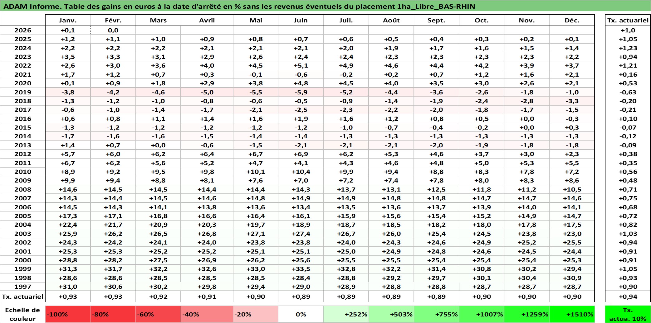 Site dédié aux investisseursPage dédiée sur site financeAnalyse des valorisations hebdomadaires de l'actif 1ha_Libre_BAS-RHIN. Cet actif est cote en EUR. Les valorisations couvrent les semaines 1997W01 a 2026W09. Les fermages de ce bien foncier sont pris egaux a 2,5% annuels de la valeur venale du bien.