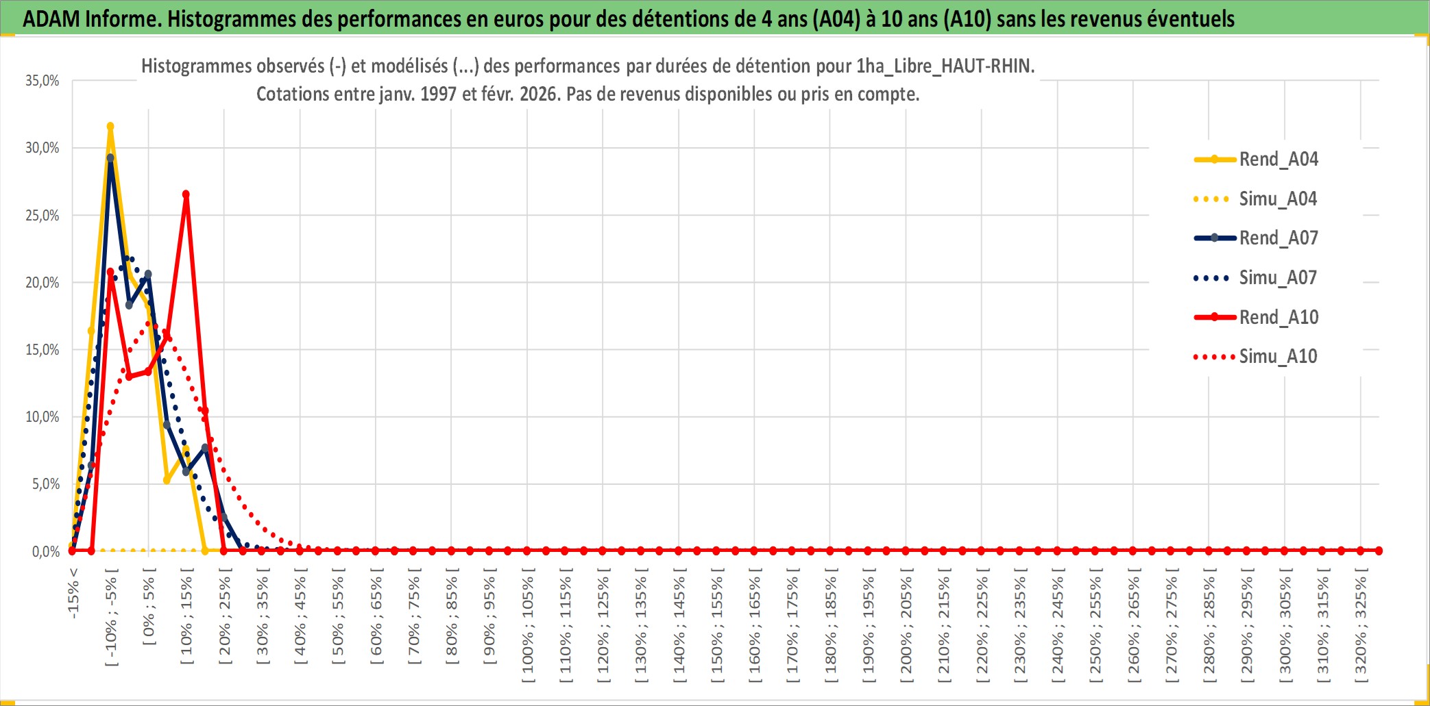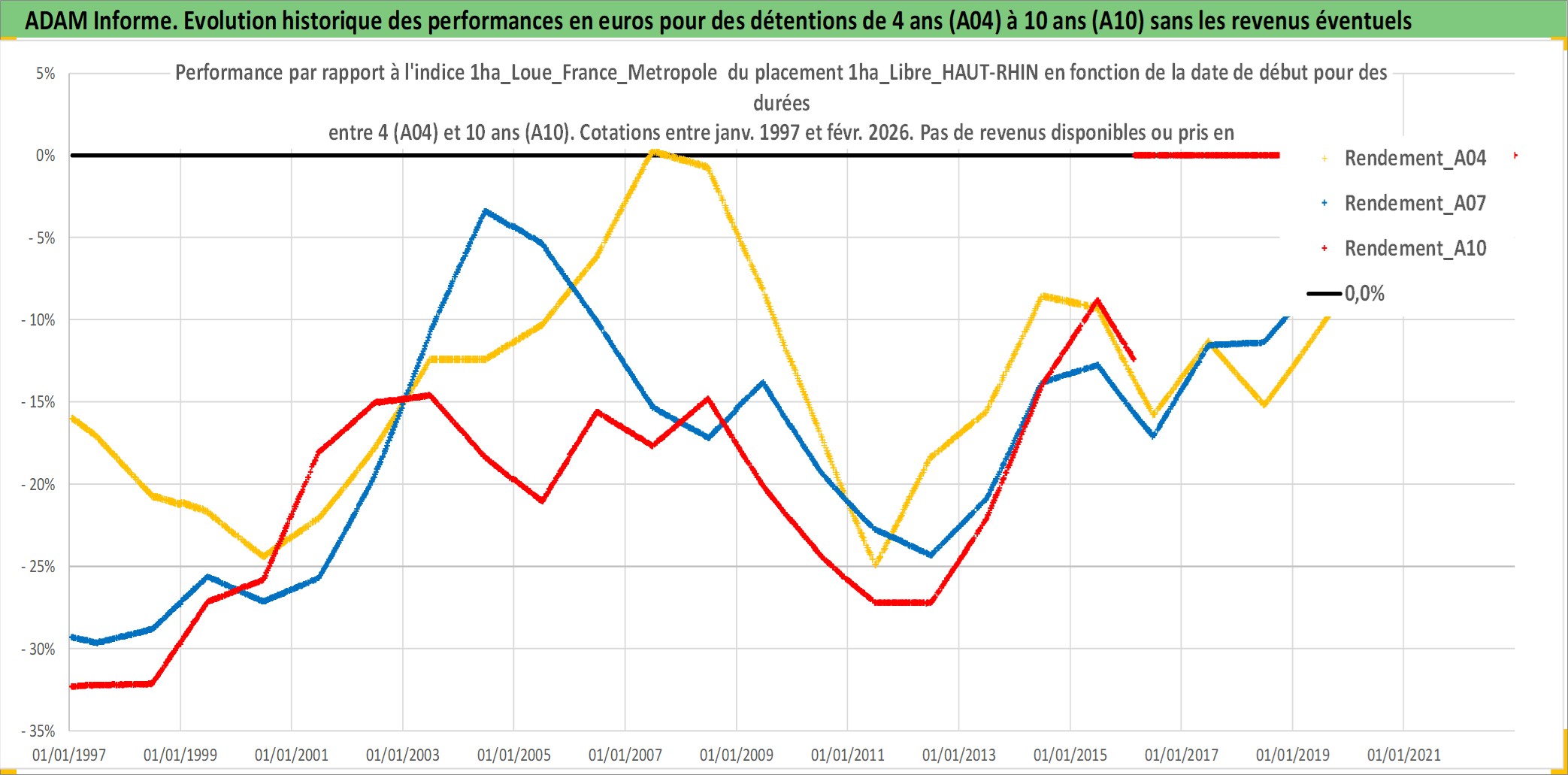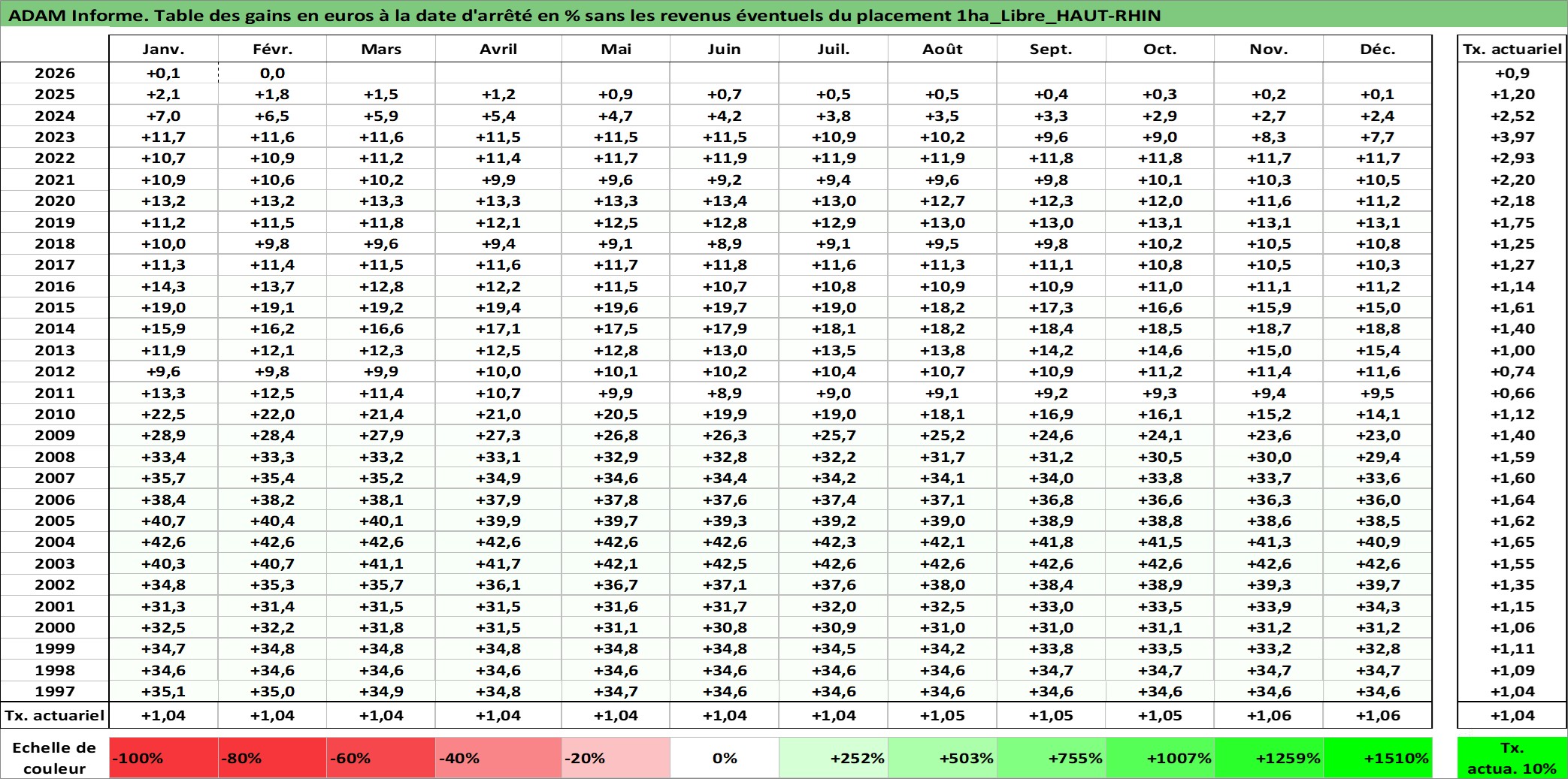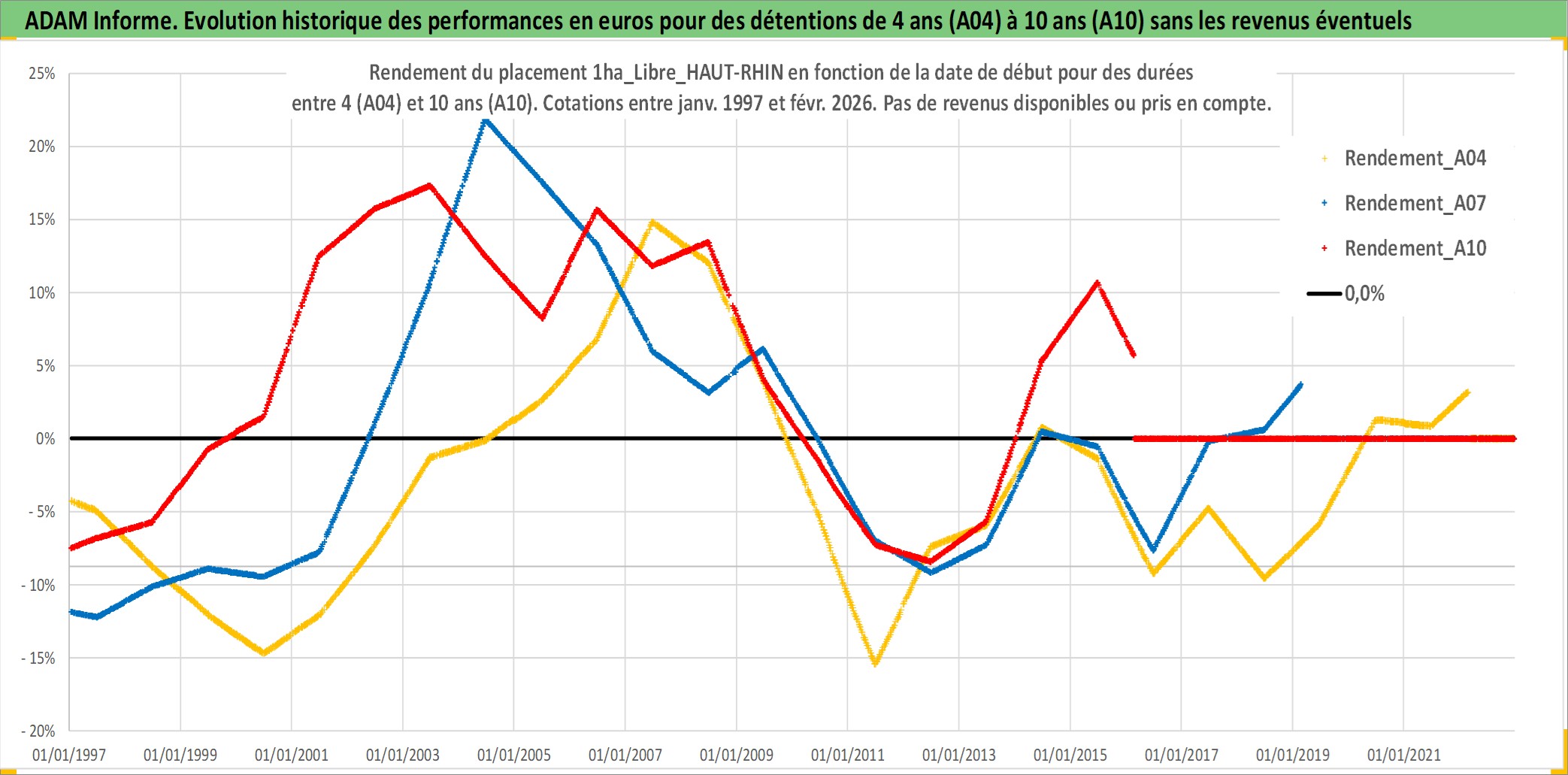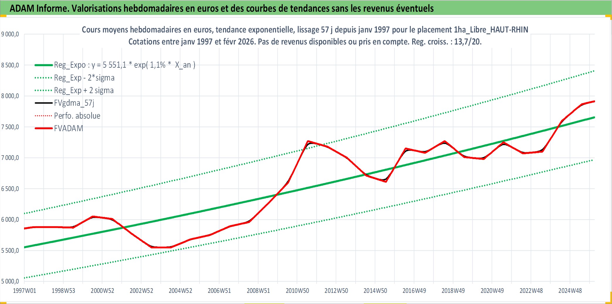Site dédié aux investisseursPage dédiée sur site financeAnalyse des valorisations hebdomadaires de l'actif 1ha_Libre_HAUT-RHIN. Cet actif est cote en EUR. Les valorisations couvrent les semaines 1997W01 a 2026W09. Les fermages de ce bien foncier sont pris egaux a 2,5% annuels de la valeur venale du bien.