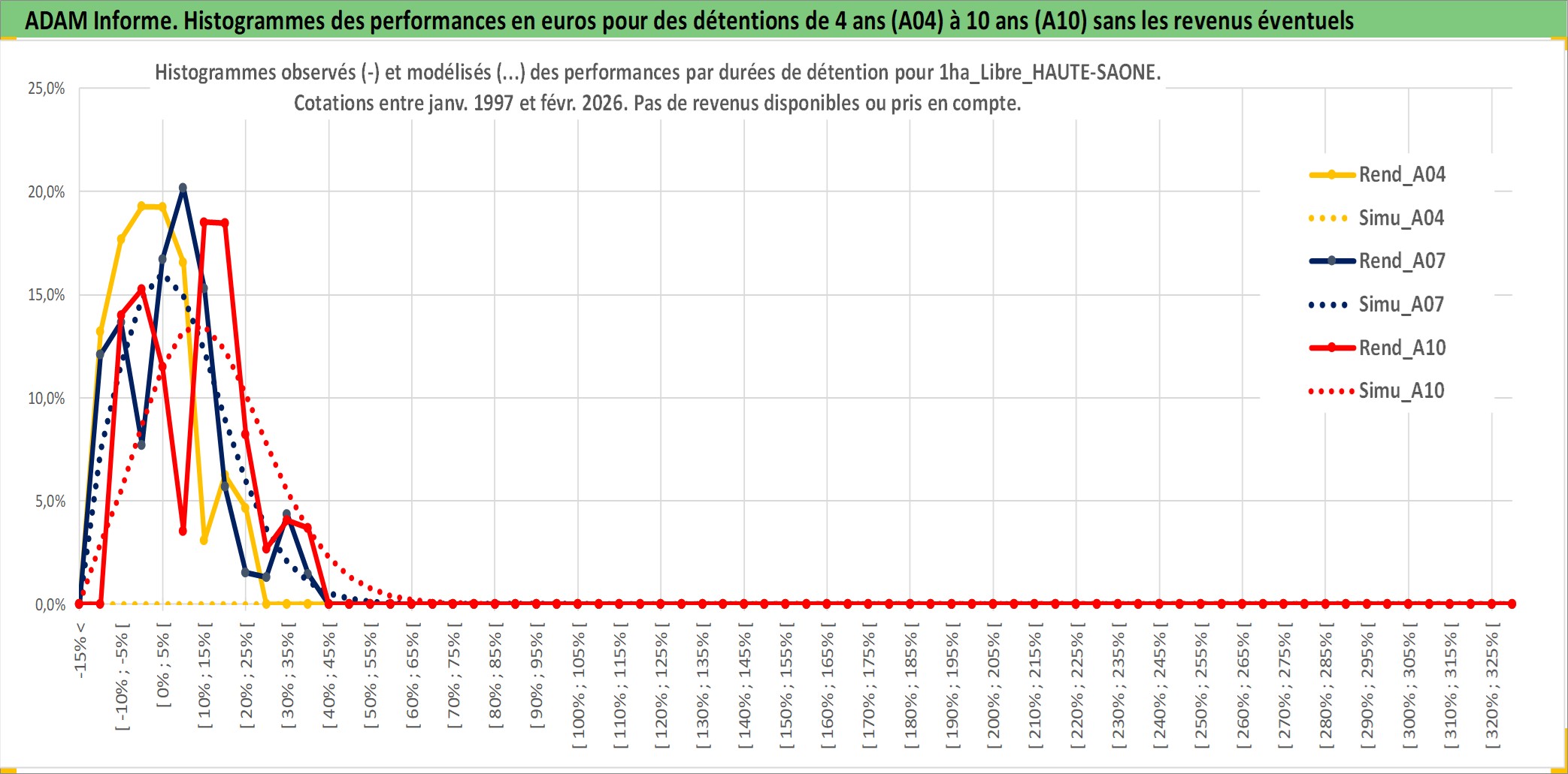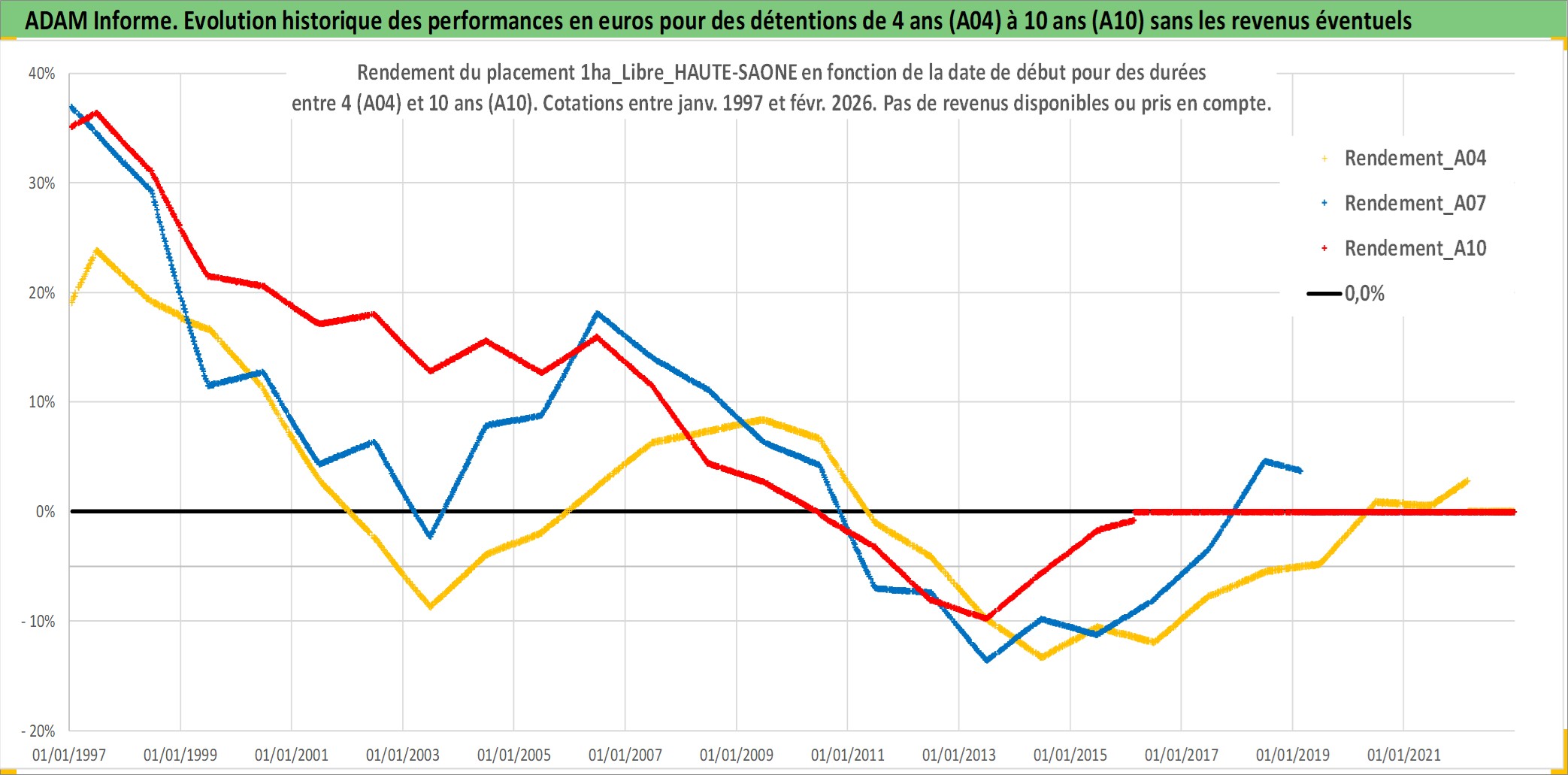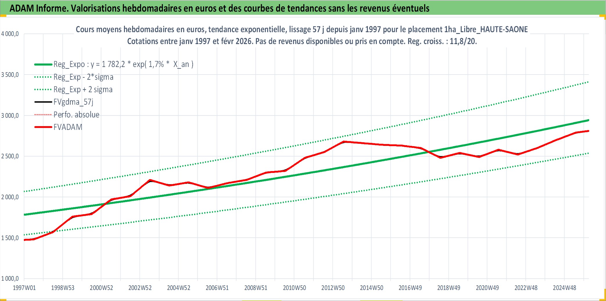 Site dédié aux investisseursPage dédiée sur site financeAnalyse des valorisations hebdomadaires de l'actif 1ha_Libre_HAUTE-SAONE. Cet actif est cote en EUR. Les valorisations couvrent les semaines 1997W01 a 2026W09. Les fermages de ce bien foncier sont pris egaux a 2,5% annuels de la valeur venale du bien.