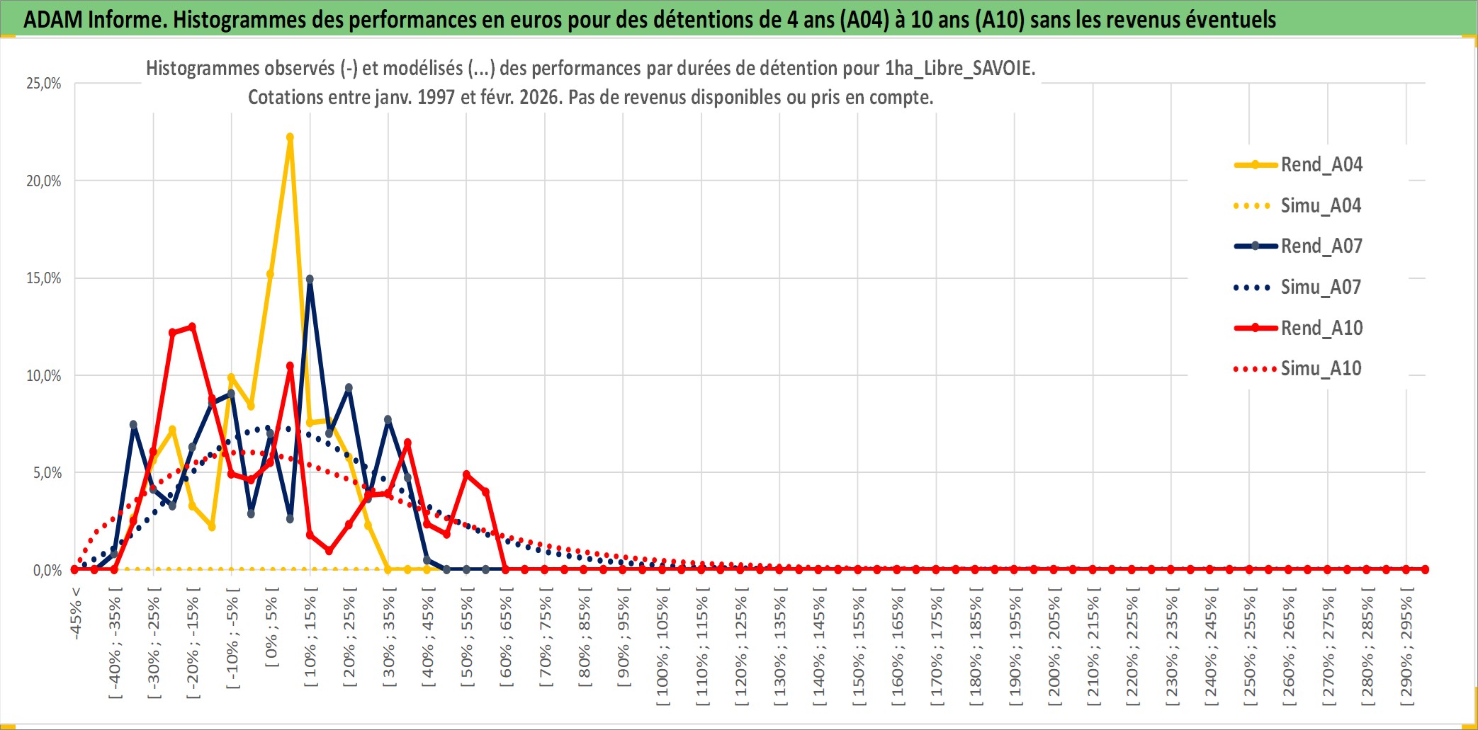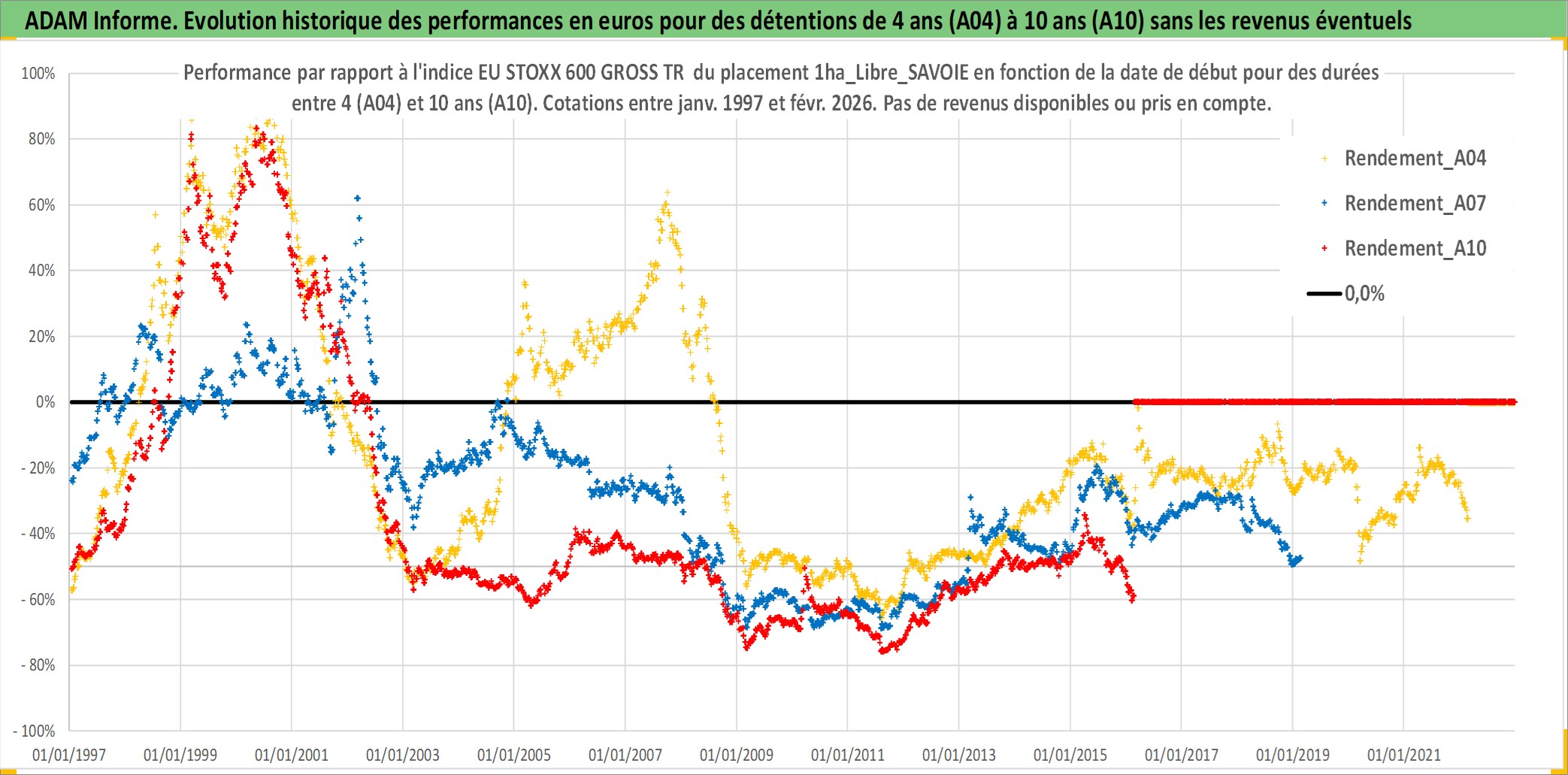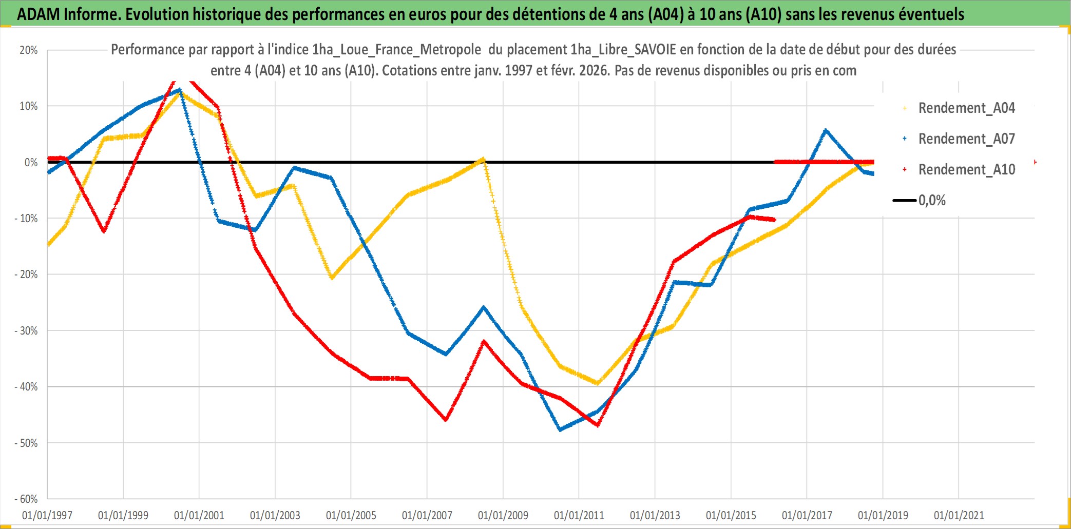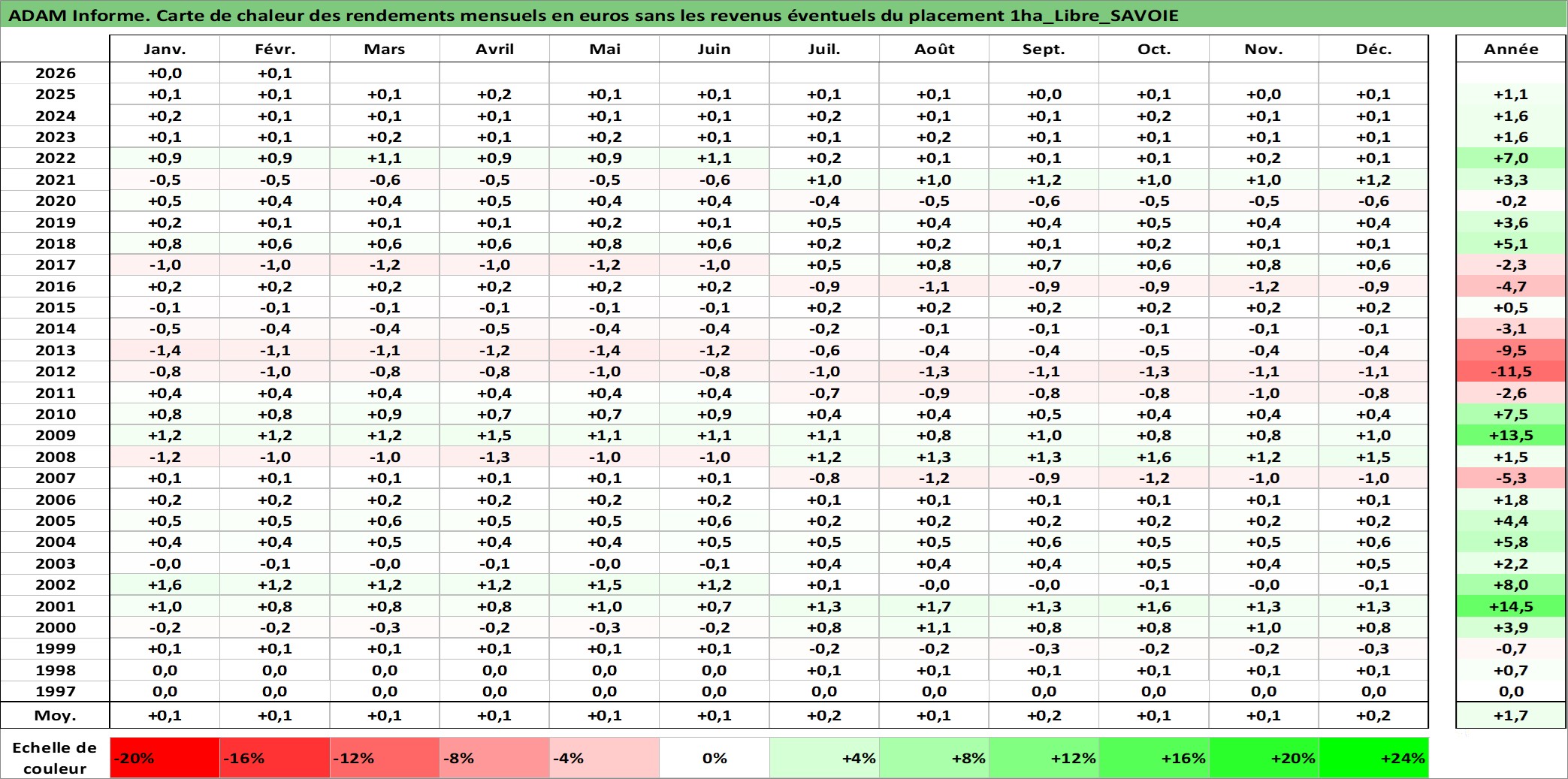Site dédié aux investisseursPage dédiée sur site financeAnalyse des valorisations hebdomadaires de l'actif 1ha_Libre_SAVOIE. Cet actif est cote en EUR. Les valorisations couvrent les semaines 1997W01 a 2026W09. Les fermages de ce bien foncier sont pris egaux a 2,5% annuels de la valeur venale du bien.