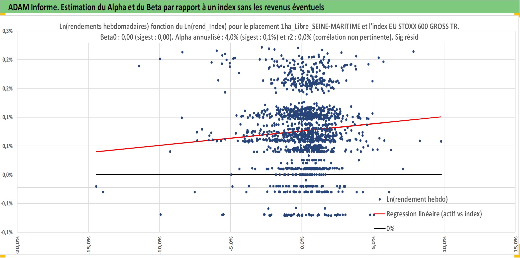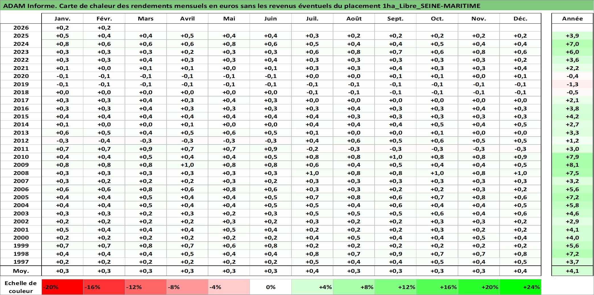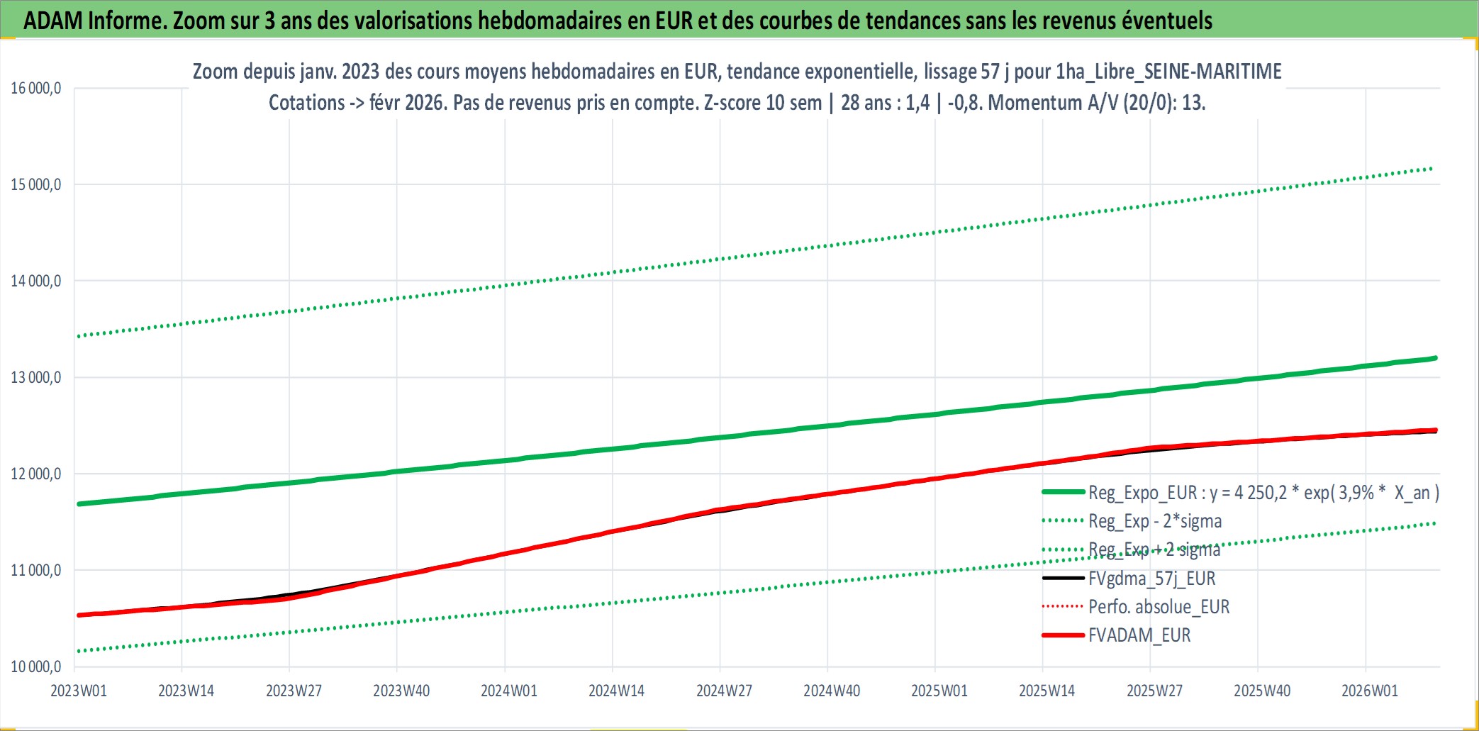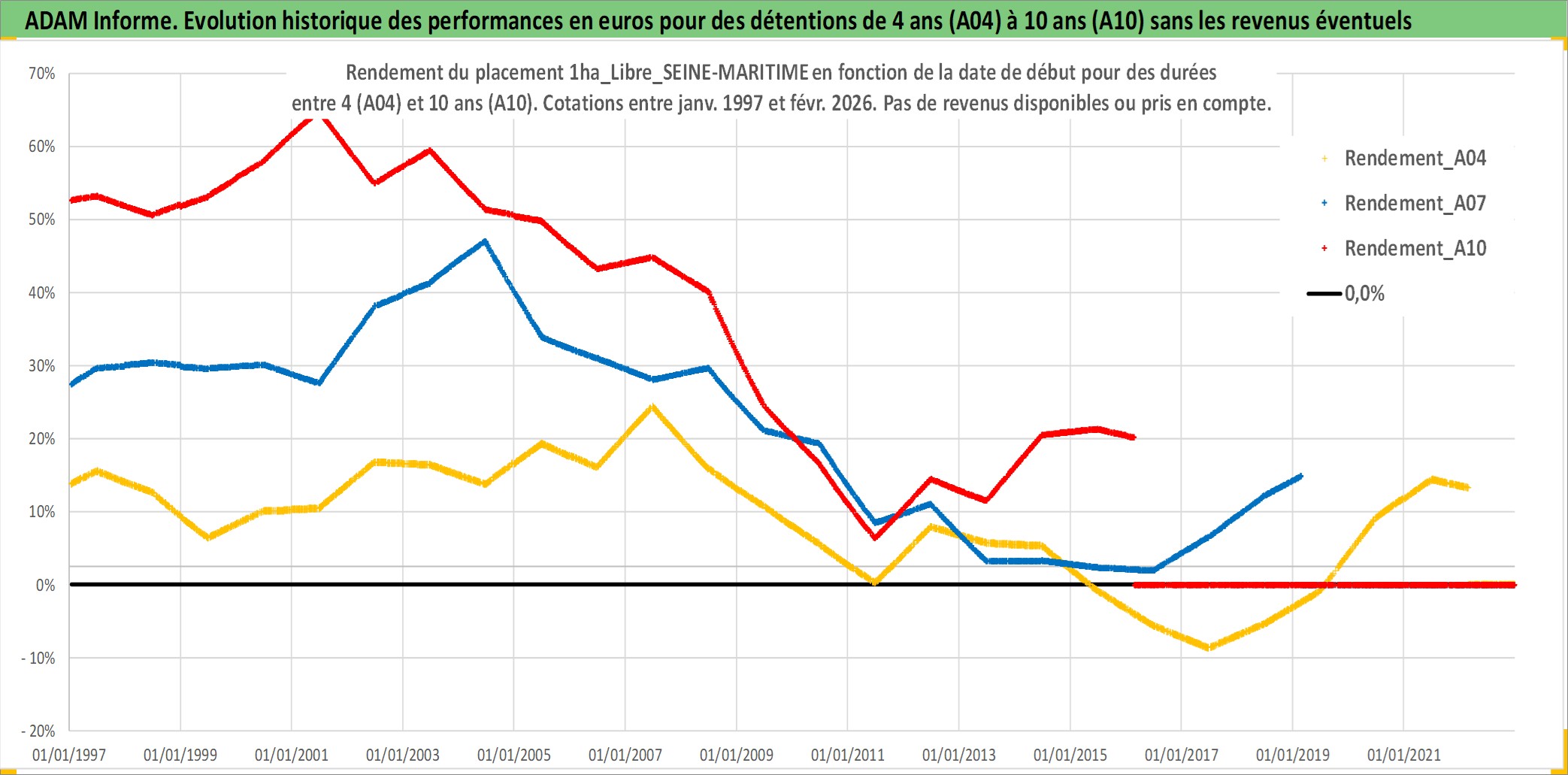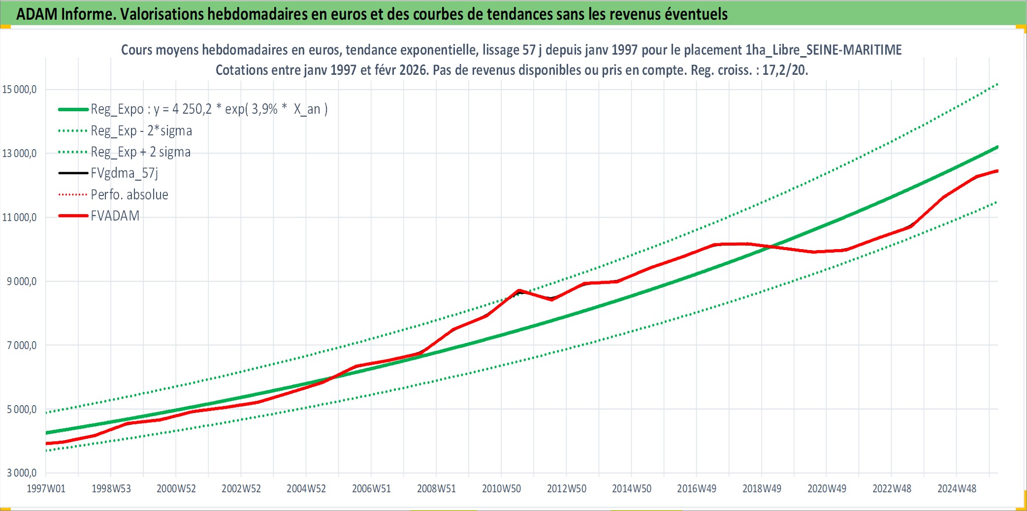 Site dédié aux investisseursPage dédiée sur site financeAnalyse des valorisations hebdomadaires de l'actif 1ha_Libre_SEINE-MARITIME. Cet actif est cote en EUR. Les valorisations couvrent les semaines 1997W01 a 2026W09. Les fermages de ce bien foncier sont pris egaux a 2,5% annuels de la valeur venale du bien.