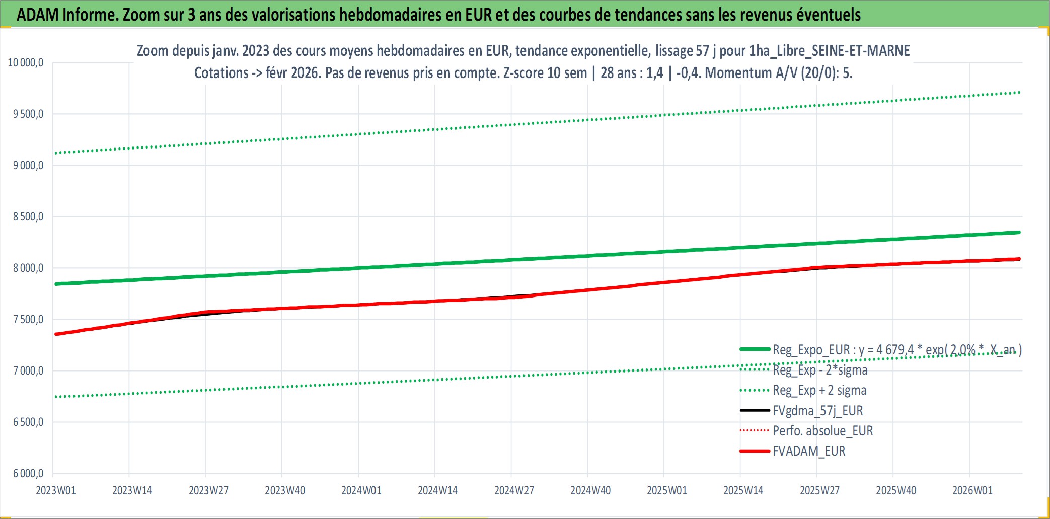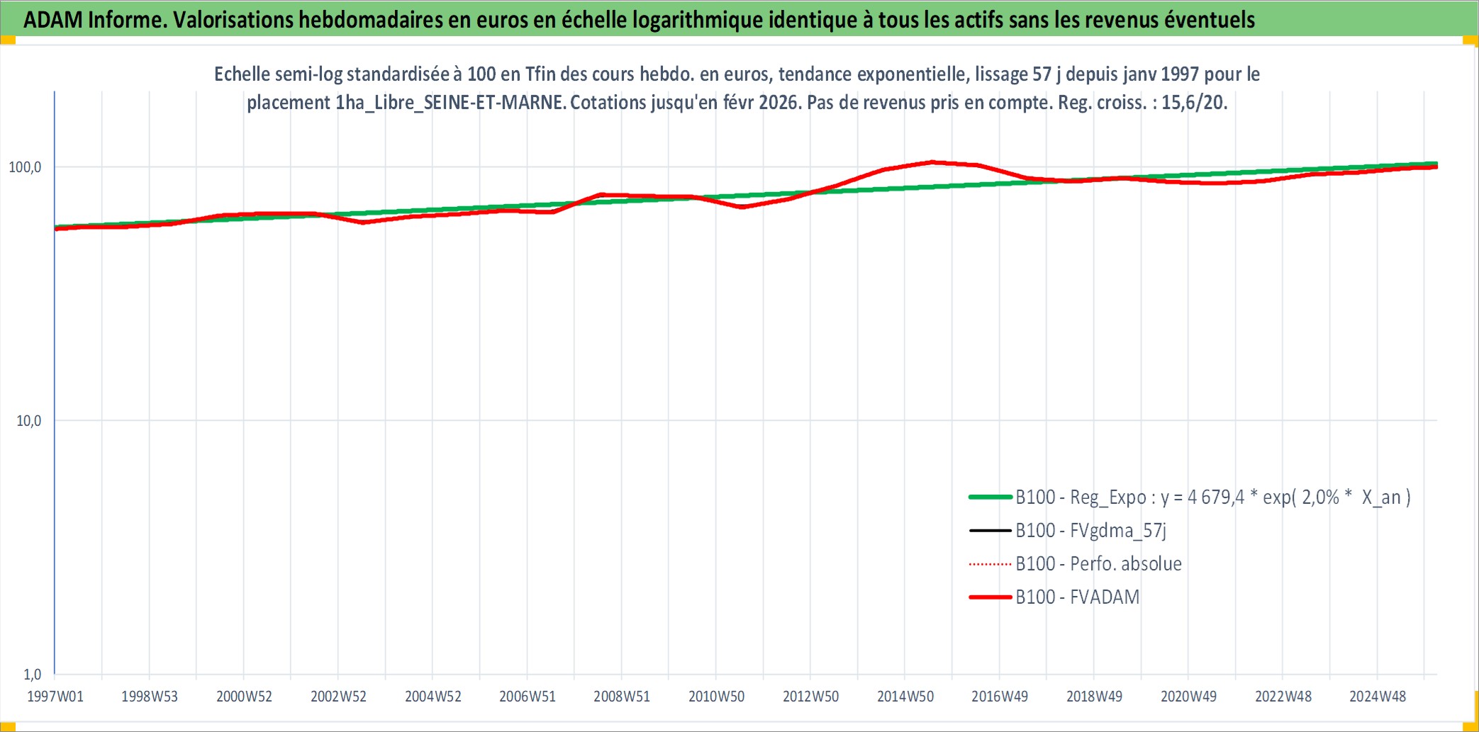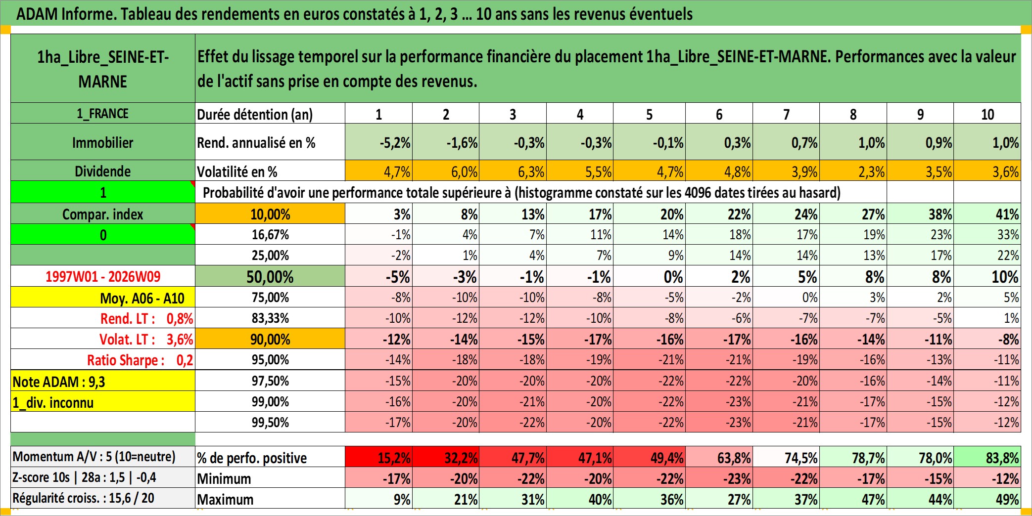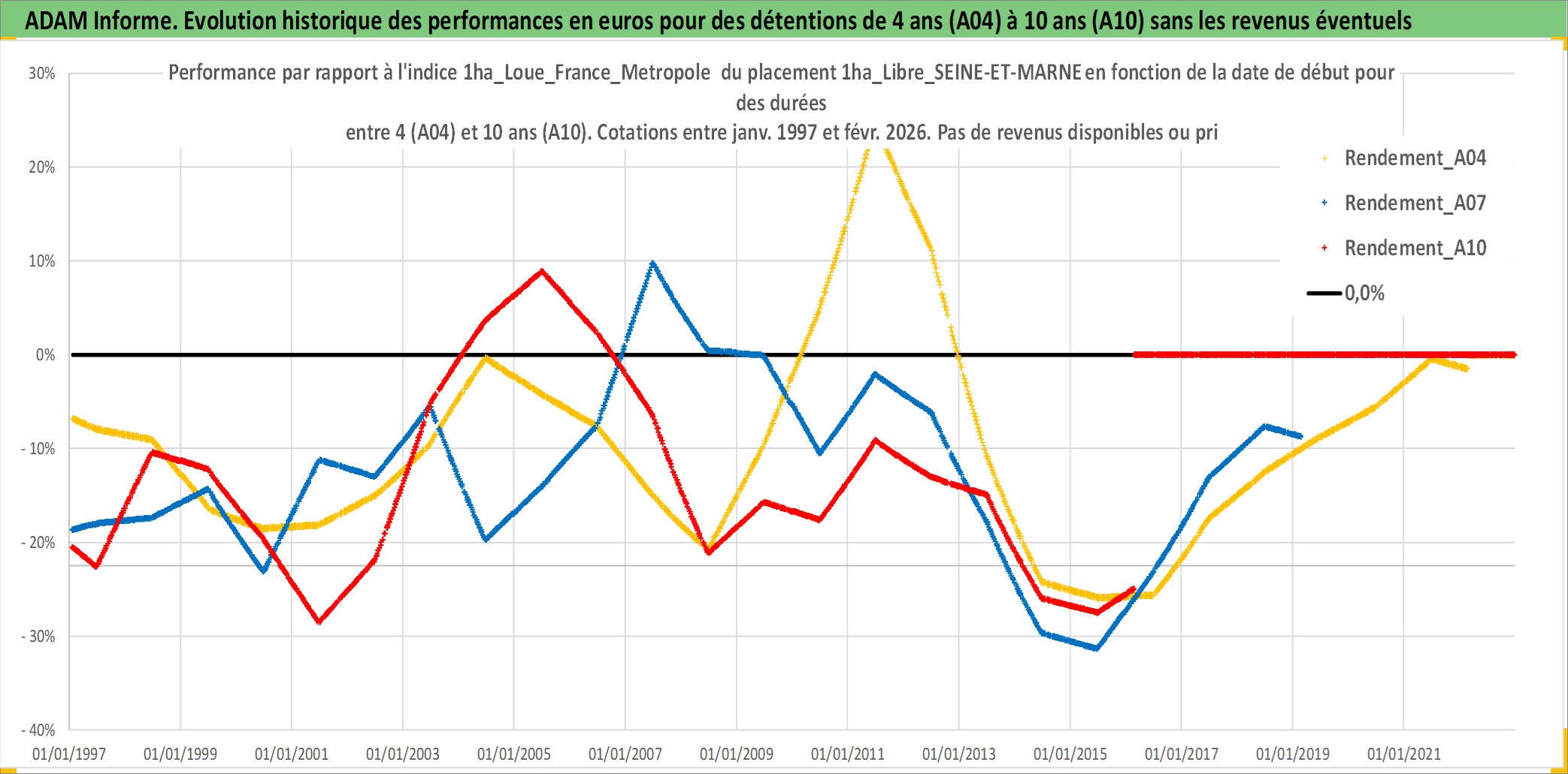 Site dédié aux investisseursPage dédiée sur site financeAnalyse des valorisations hebdomadaires de l'actif 1ha_Libre_SEINE-ET-MARNE. Cet actif est cote en EUR. Les valorisations couvrent les semaines 1997W01 a 2026W09. Les fermages de ce bien foncier sont pris egaux a 2,5% annuels de la valeur venale du bien.