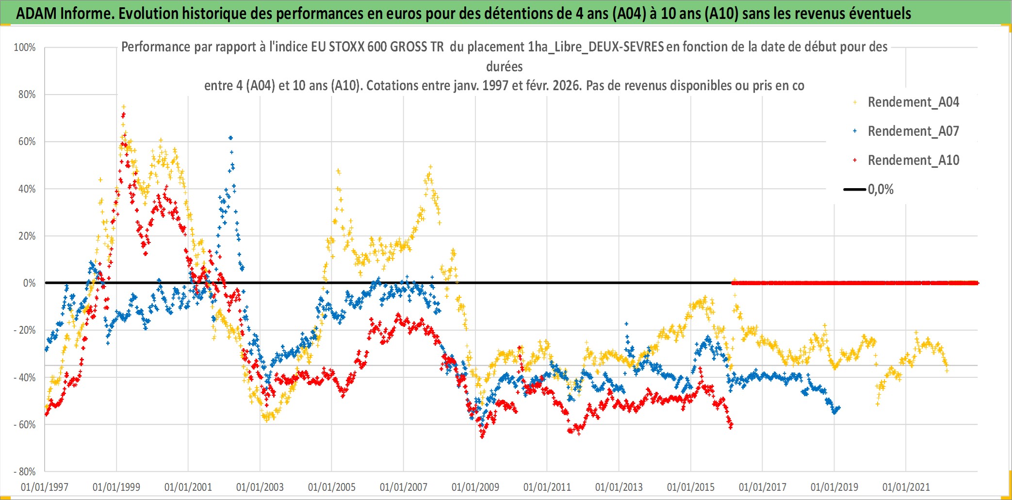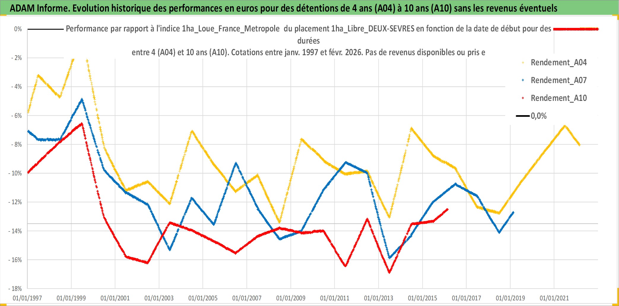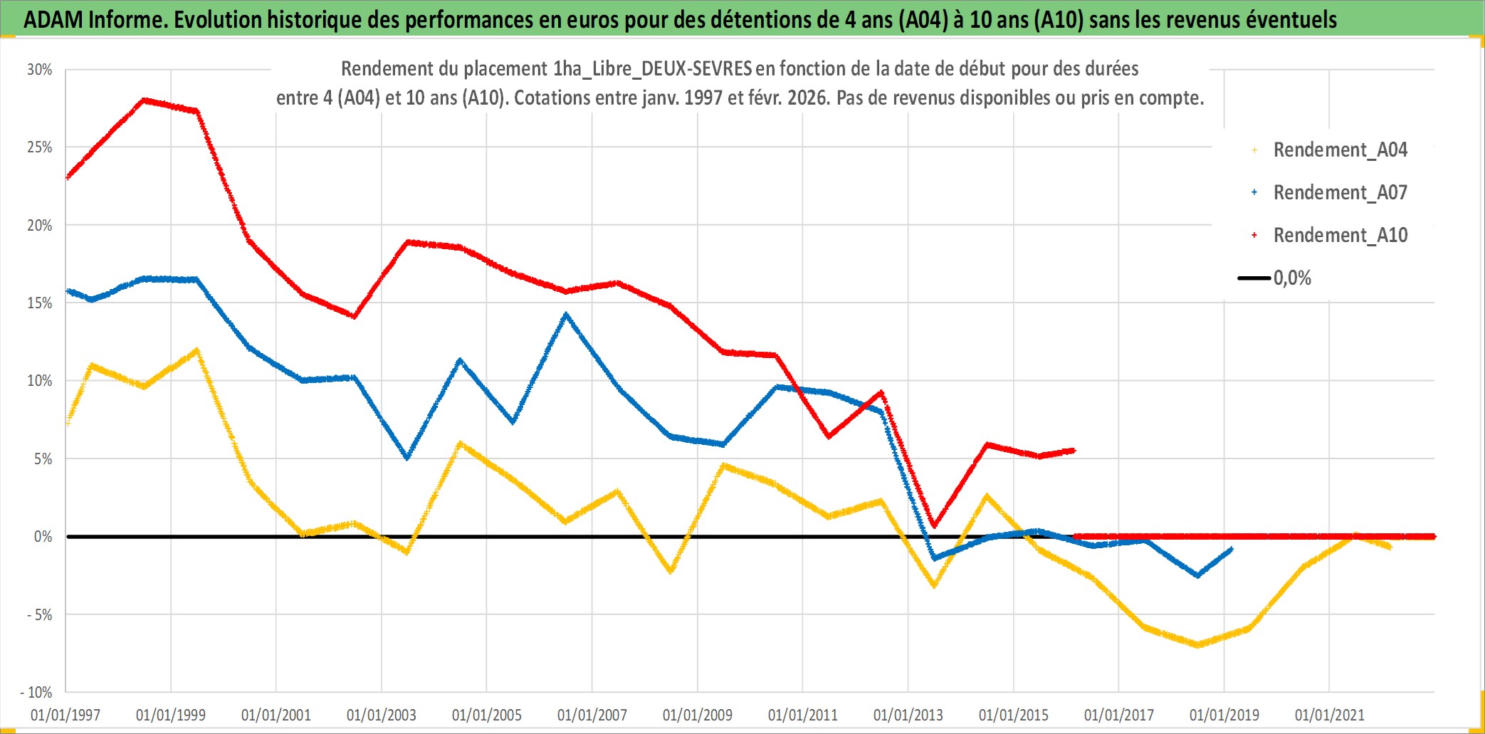 Site dédié aux investisseursPage dédiée sur site financeAnalyse des valorisations hebdomadaires de l'actif 1ha_Libre_DEUX-SEVRES. Cet actif est cote en EUR. Les valorisations couvrent les semaines 1997W01 a 2026W09. Les fermages de ce bien foncier sont pris egaux a 2,5% annuels de la valeur venale du bien.