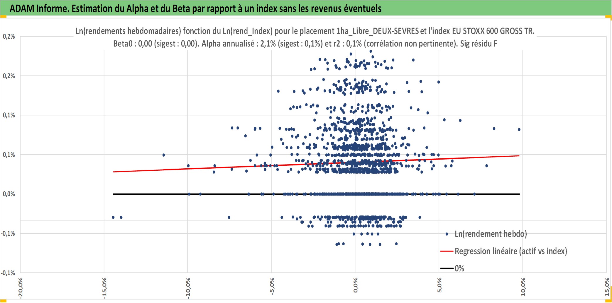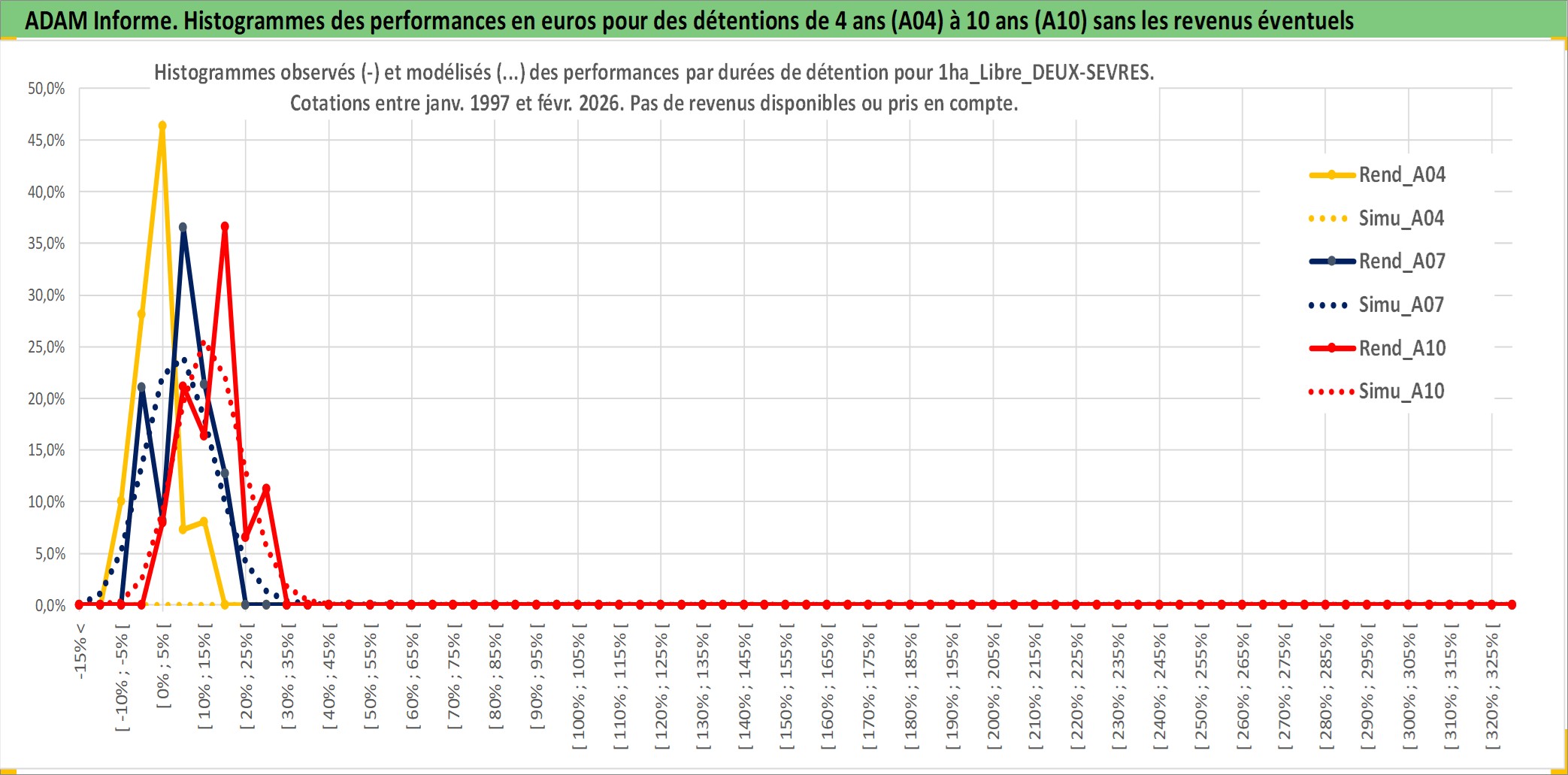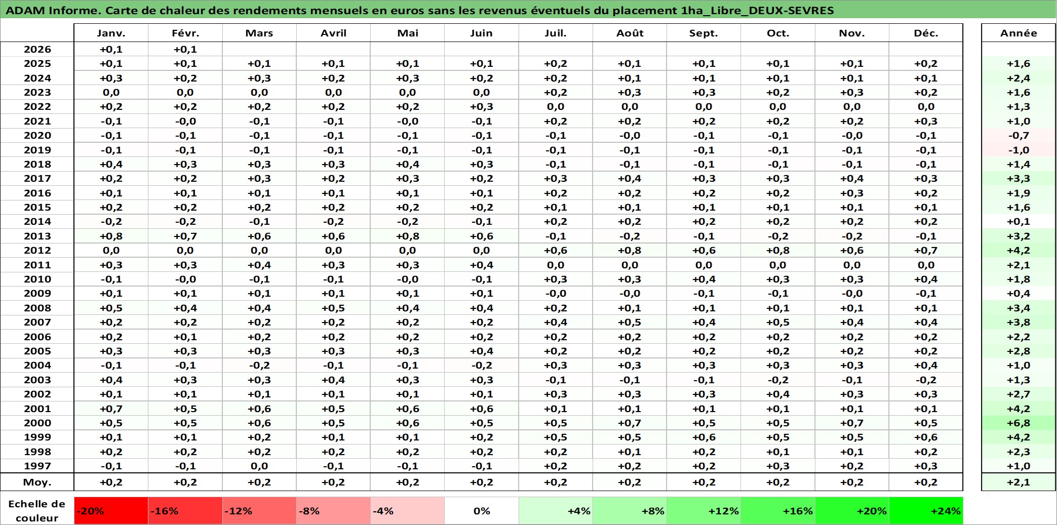 Site dédié aux investisseursPage dédiée sur site financeAnalyse des valorisations hebdomadaires de l'actif 1ha_Libre_DEUX-SEVRES. Cet actif est cote en EUR. Les valorisations couvrent les semaines 1997W01 a 2026W09. Les fermages de ce bien foncier sont pris egaux a 2,5% annuels de la valeur venale du bien.