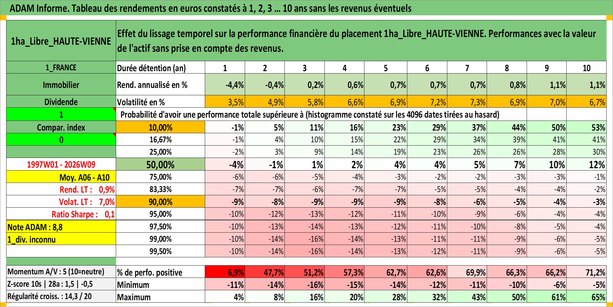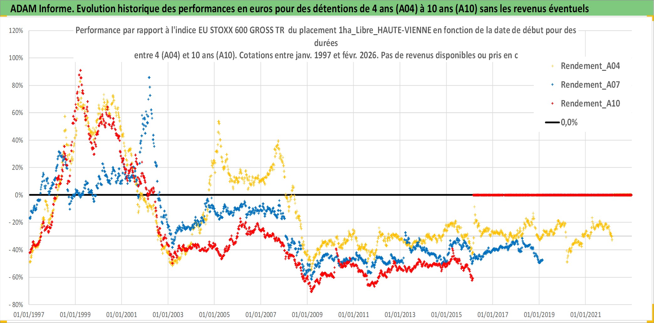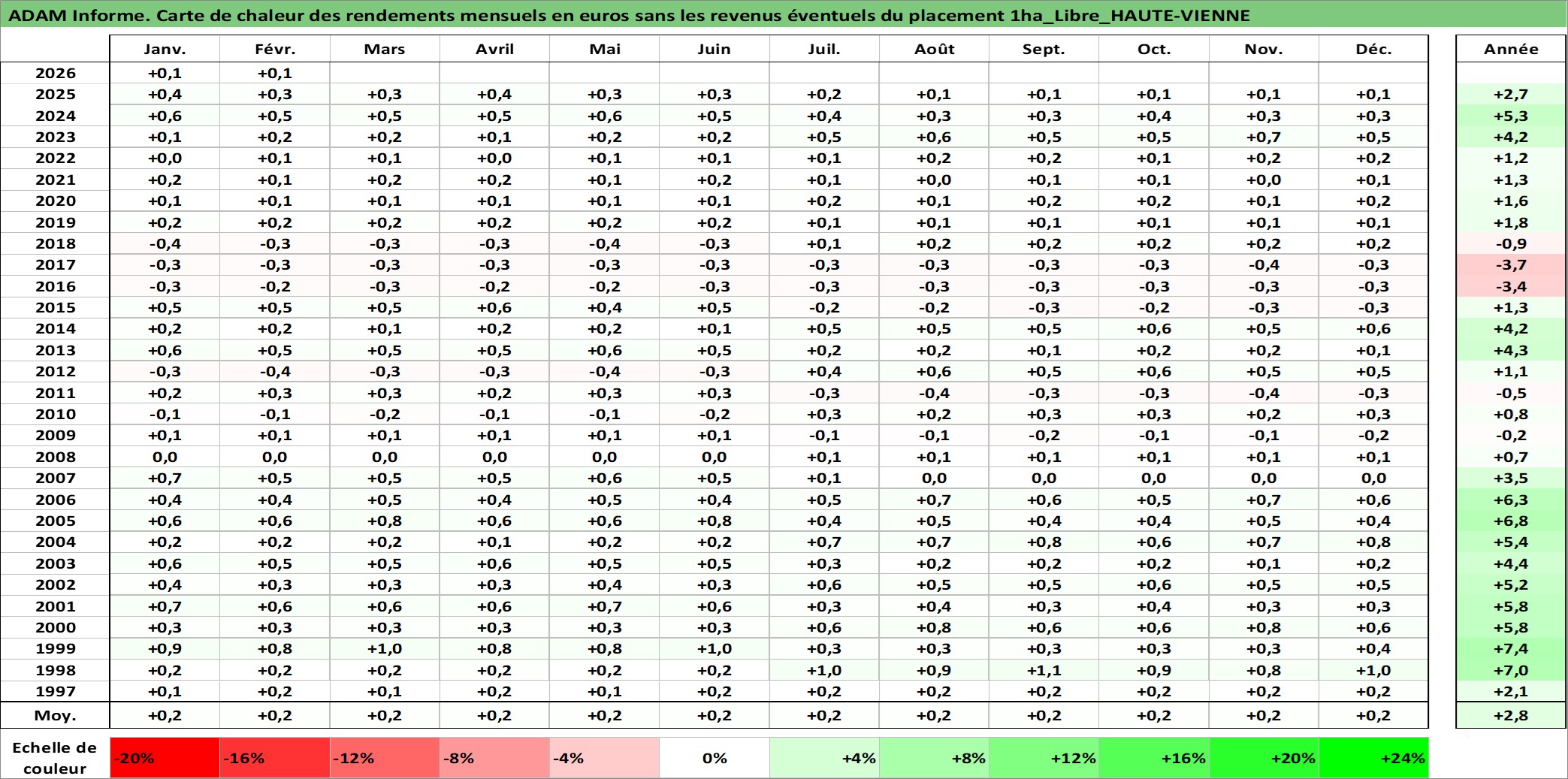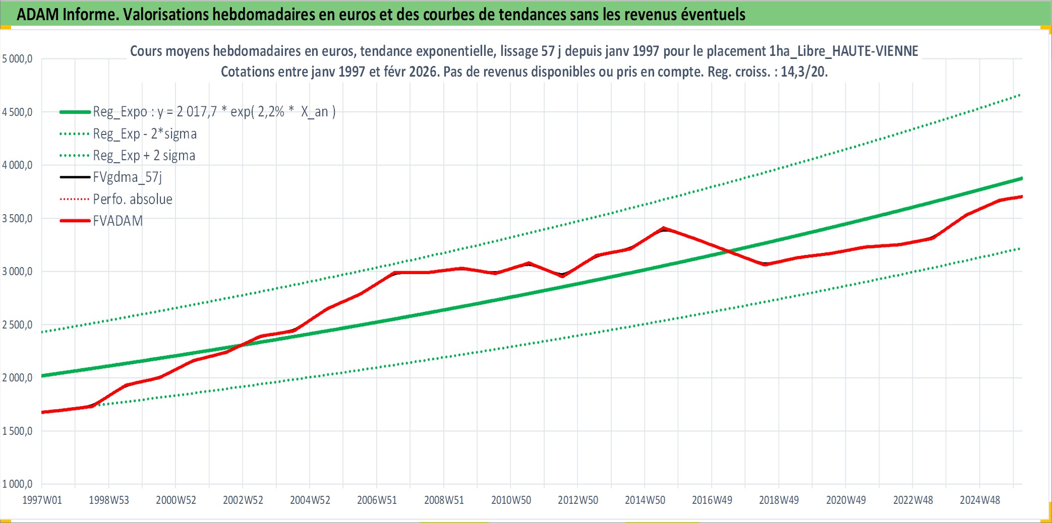 Site dédié aux investisseursPage dédiée sur site financeAnalyse des valorisations hebdomadaires de l'actif 1ha_Libre_HAUTE-VIENNE. Cet actif est cote en EUR. Les valorisations couvrent les semaines 1997W01 a 2026W09. Les fermages de ce bien foncier sont pris egaux a 2,5% annuels de la valeur venale du bien.