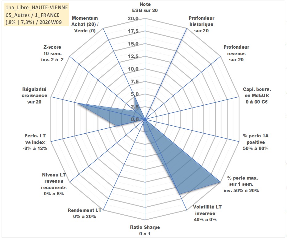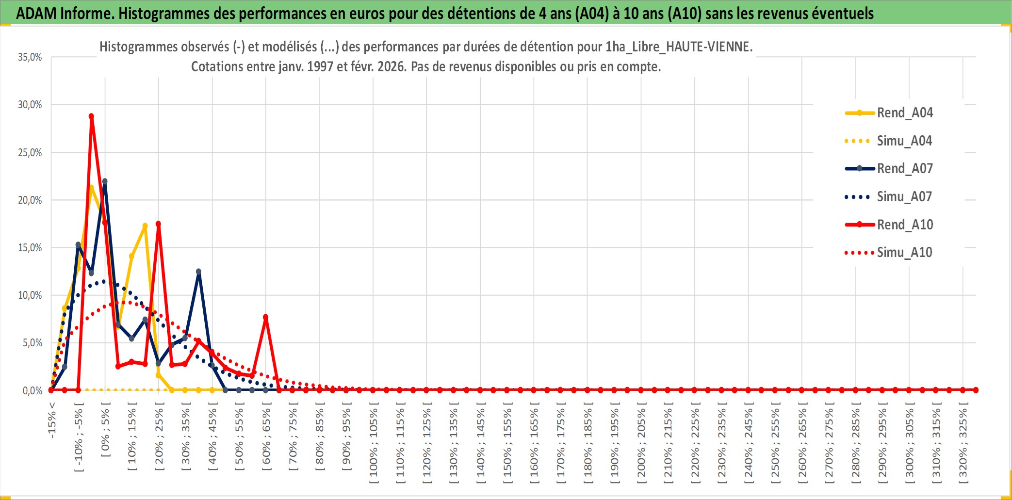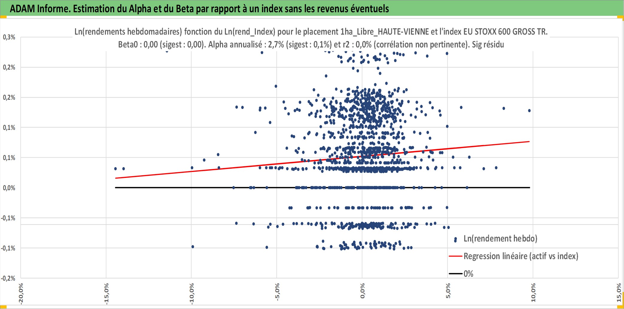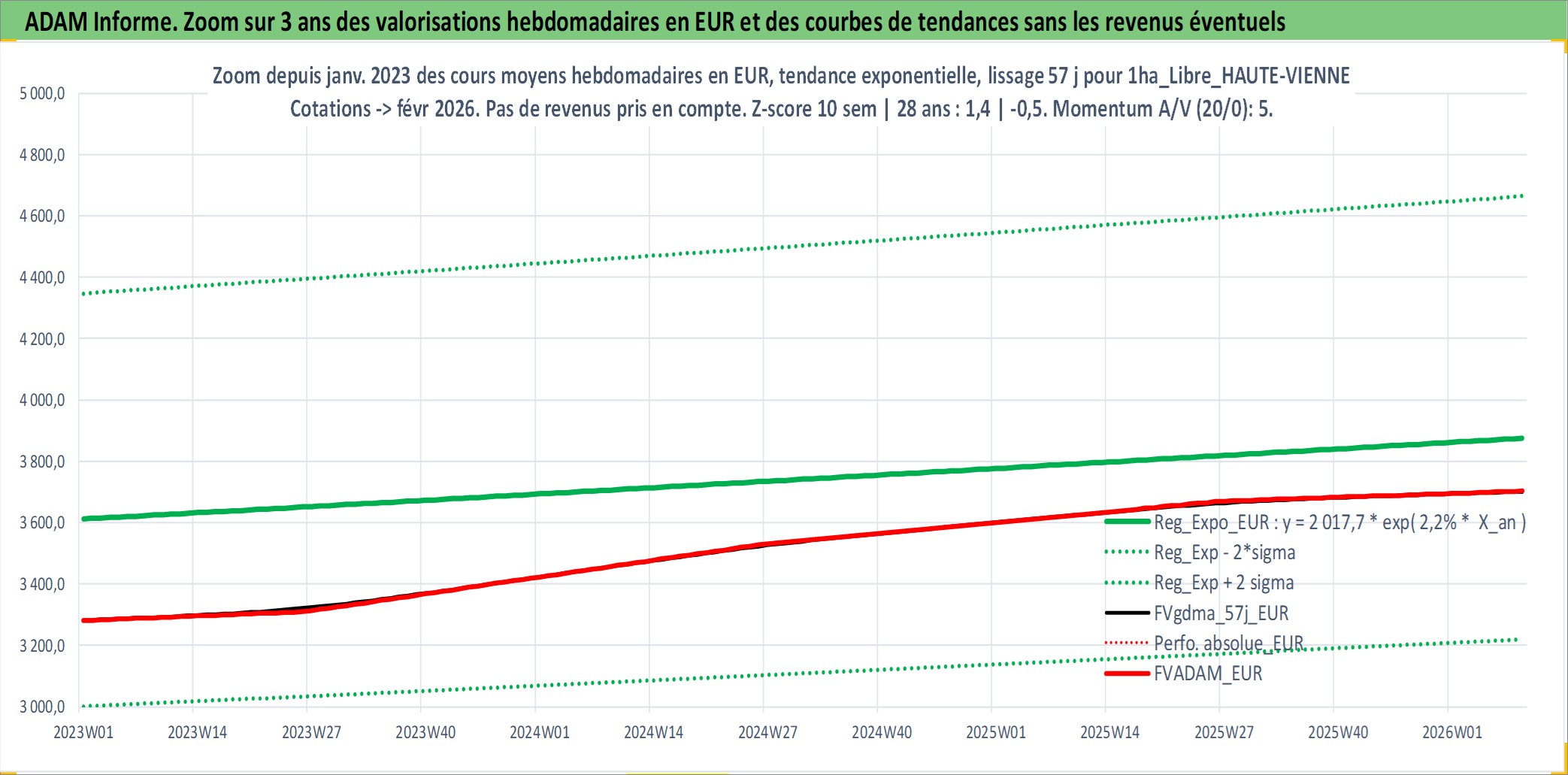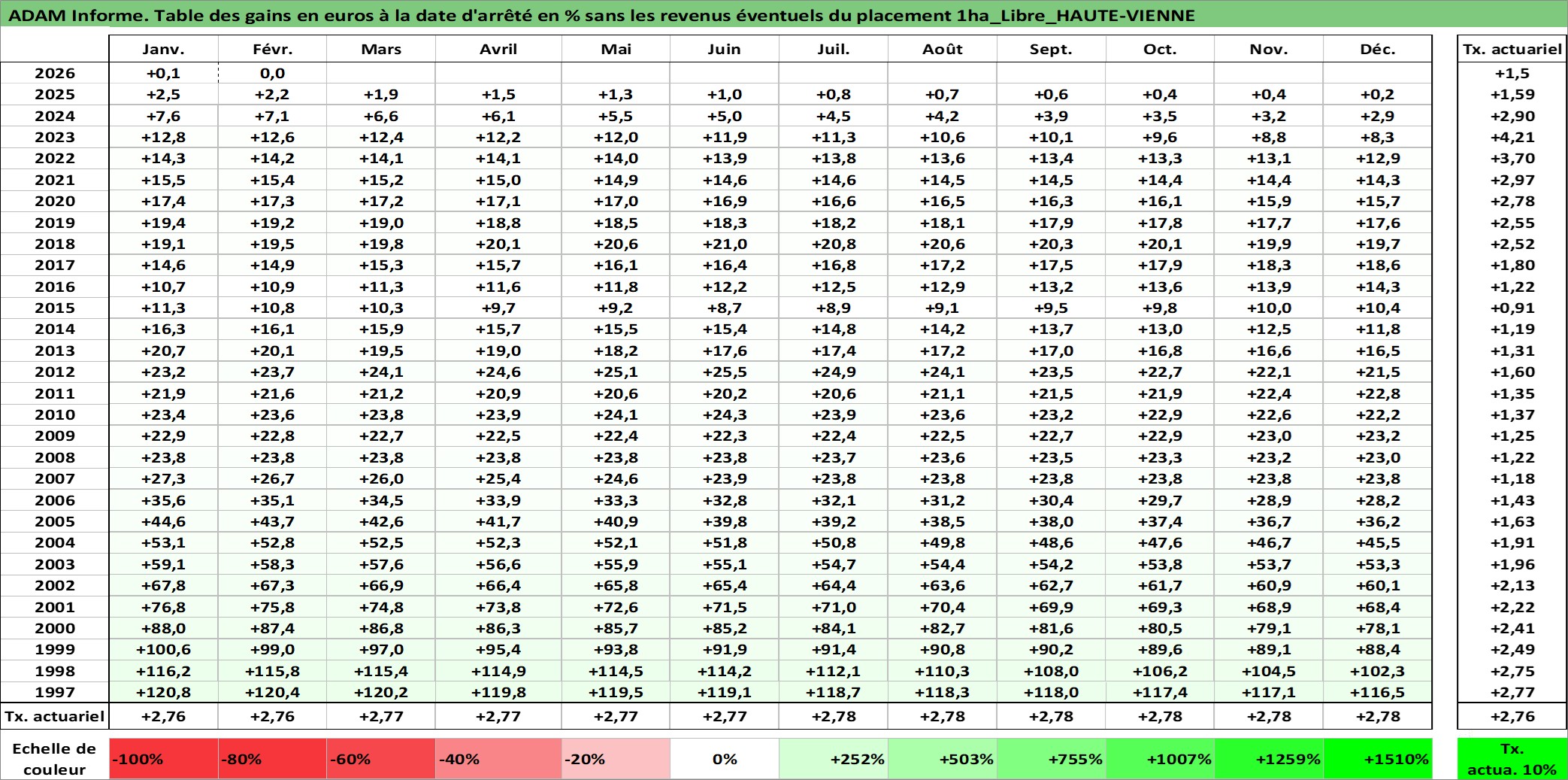 Site dédié aux investisseursPage dédiée sur site financeAnalyse des valorisations hebdomadaires de l'actif 1ha_Libre_HAUTE-VIENNE. Cet actif est cote en EUR. Les valorisations couvrent les semaines 1997W01 a 2026W09. Les fermages de ce bien foncier sont pris egaux a 2,5% annuels de la valeur venale du bien.