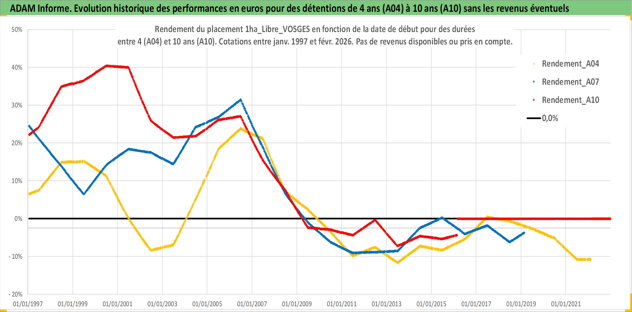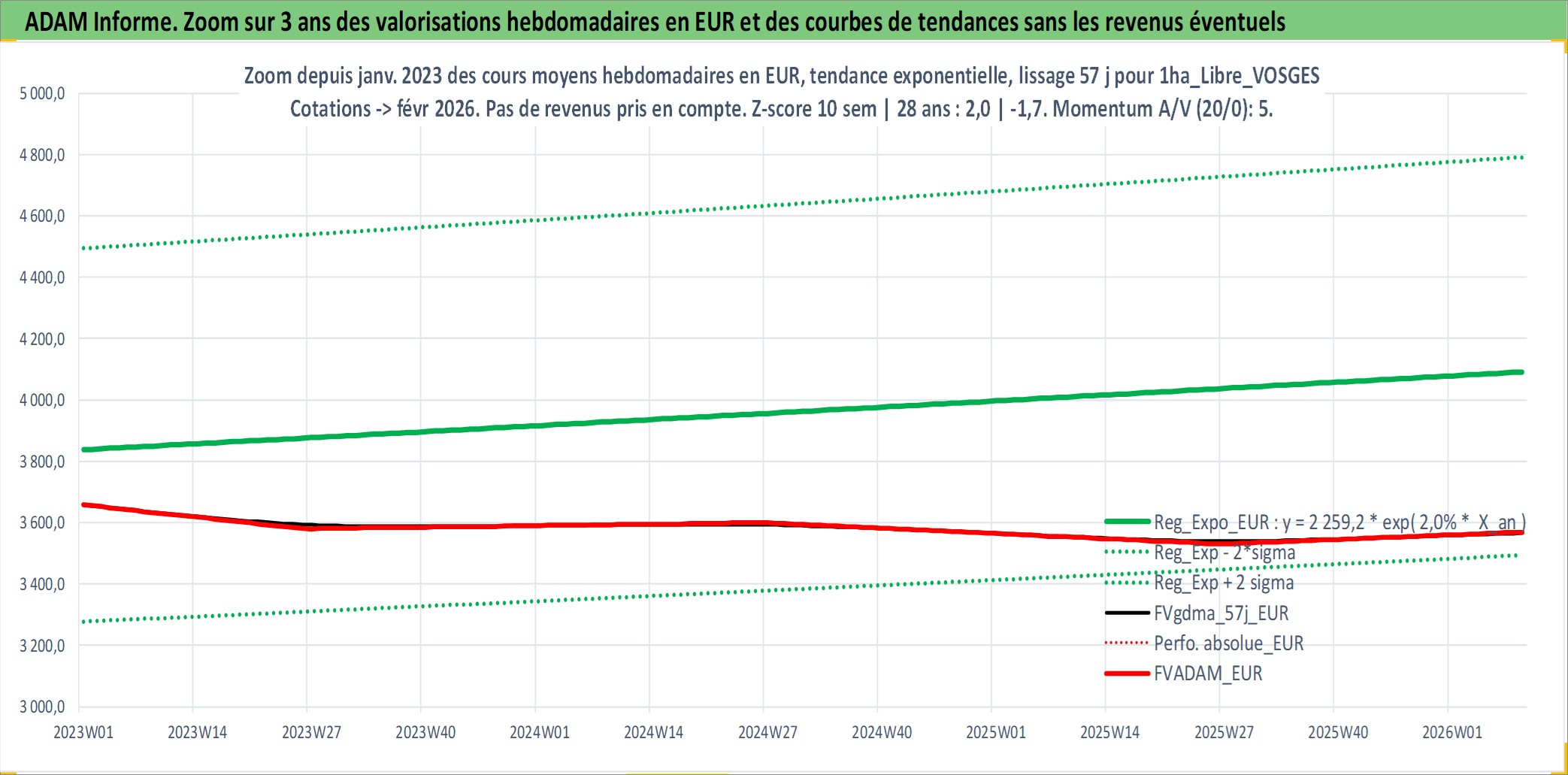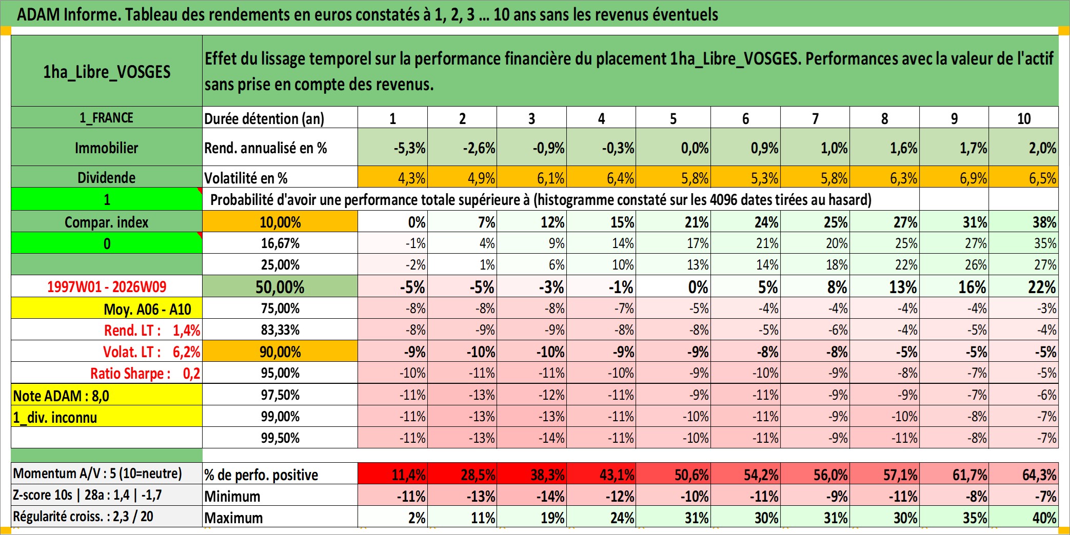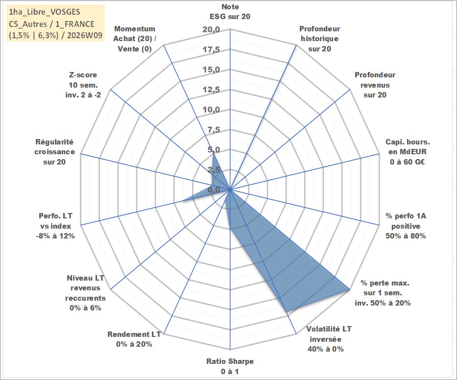 Site dédié aux investisseursPage dédiée sur site financeAnalyse des valorisations hebdomadaires de l'actif 1ha_Libre_VOSGES. Cet actif est cote en EUR. Les valorisations couvrent les semaines 1997W01 a 2026W09. Les fermages de ce bien foncier sont pris egaux a 2,5% annuels de la valeur venale du bien.