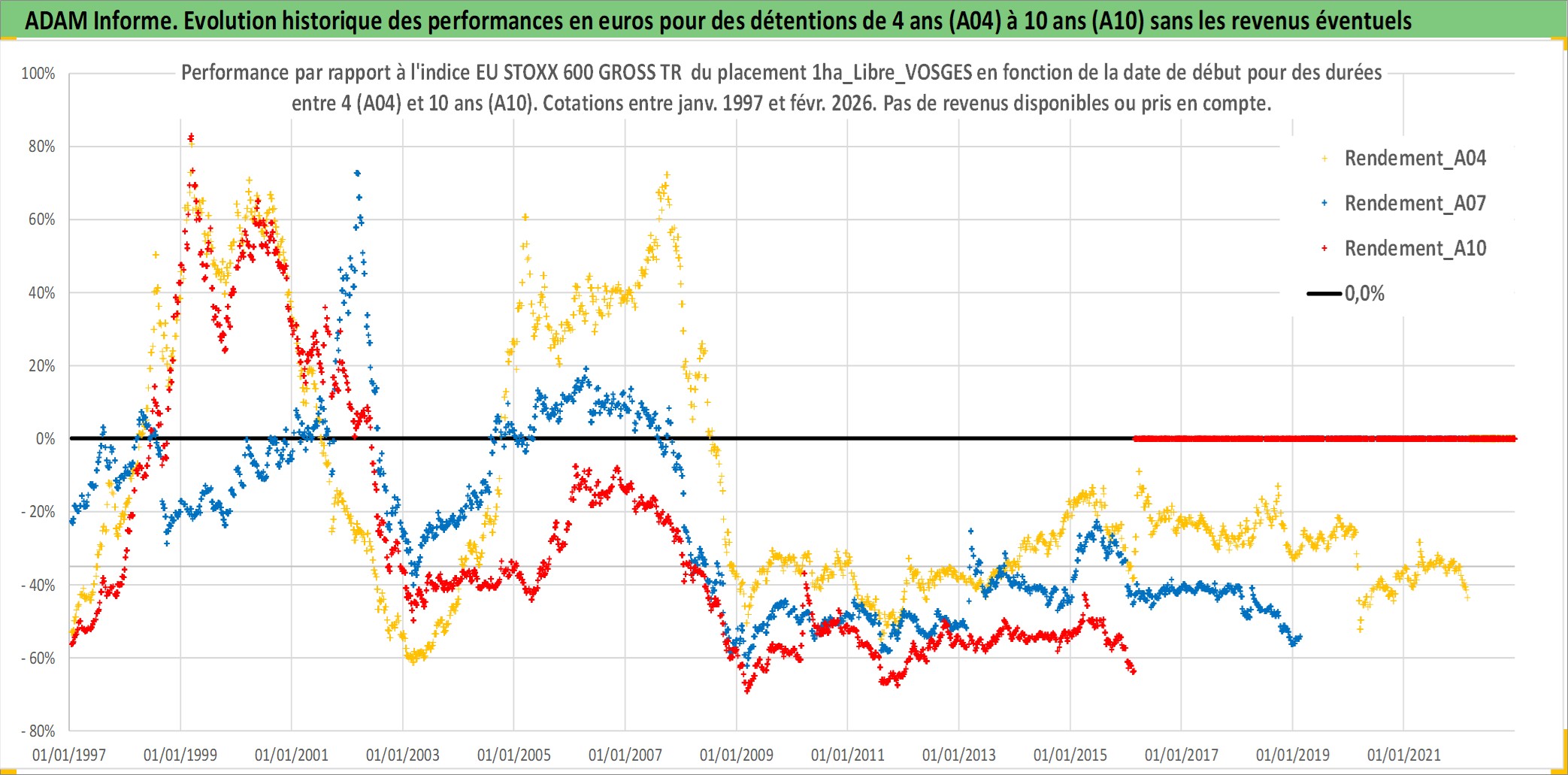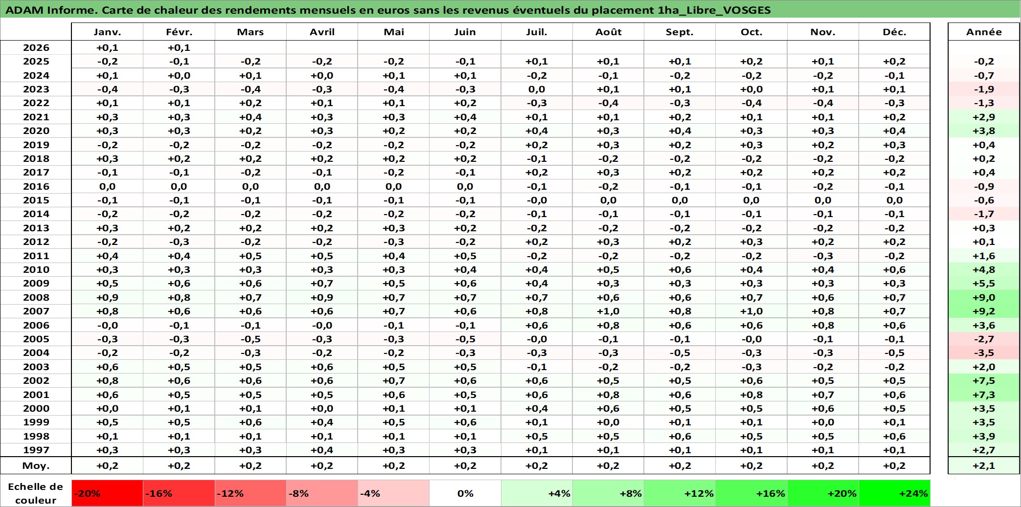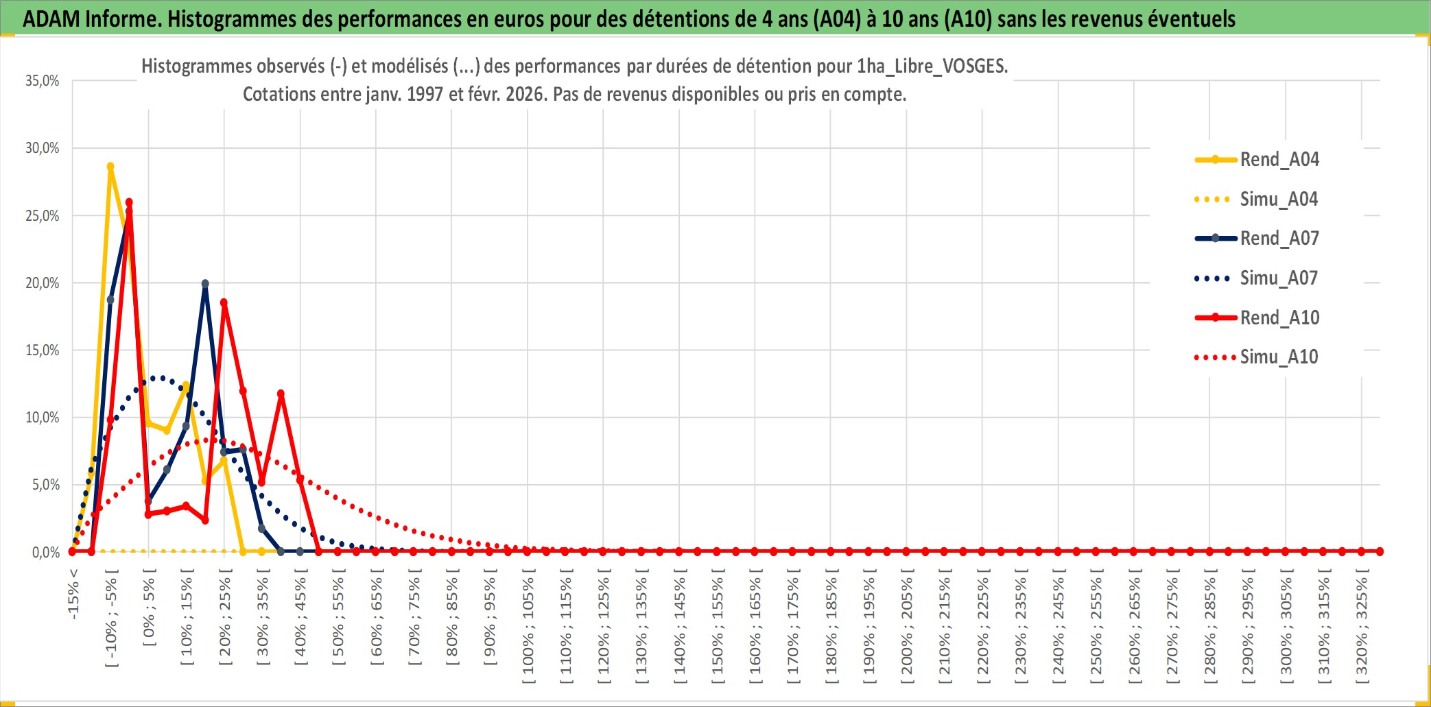 Site dédié aux investisseursPage dédiée sur site financeAnalyse des valorisations hebdomadaires de l'actif 1ha_Libre_VOSGES. Cet actif est cote en EUR. Les valorisations couvrent les semaines 1997W01 a 2026W09. Les fermages de ce bien foncier sont pris egaux a 2,5% annuels de la valeur venale du bien.