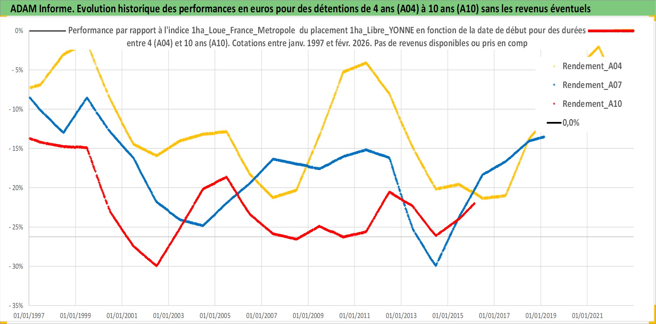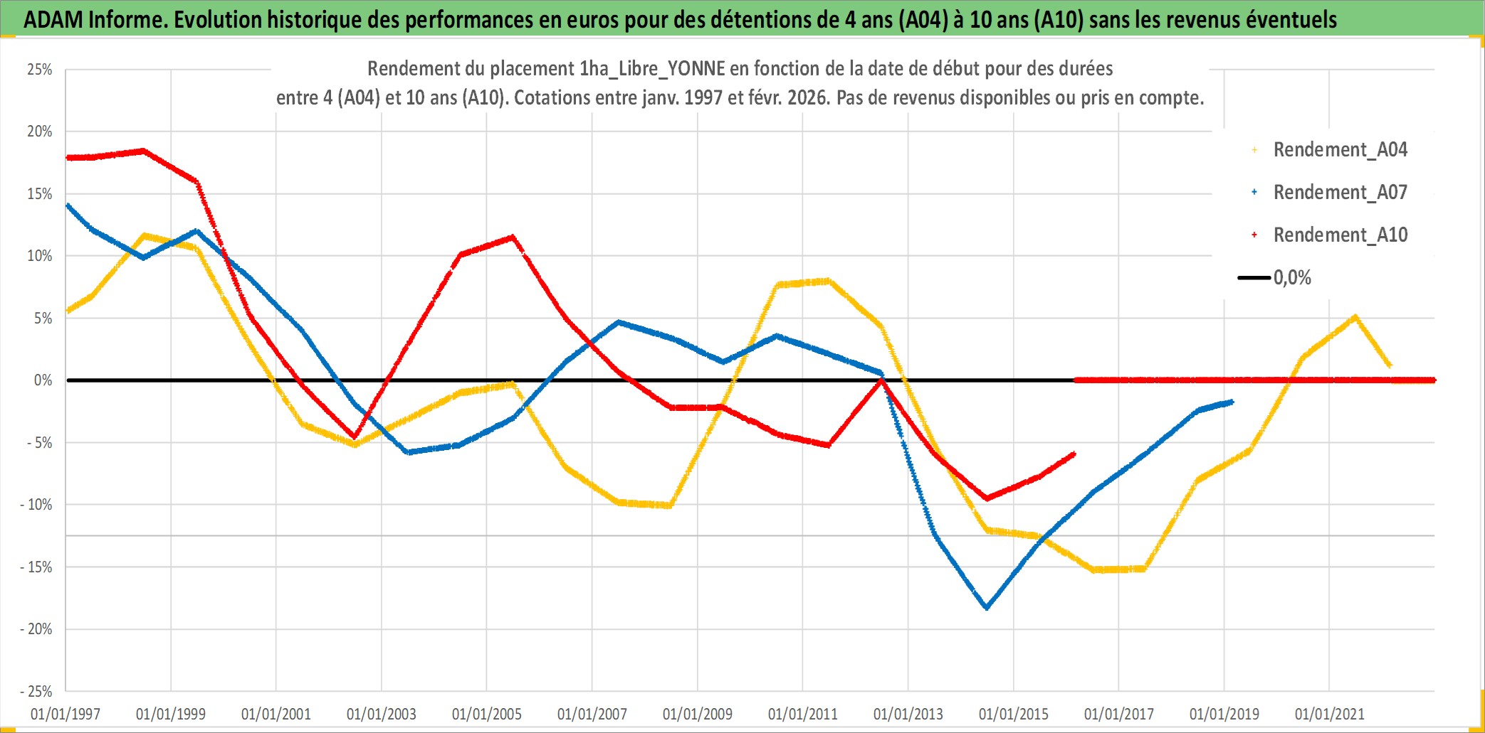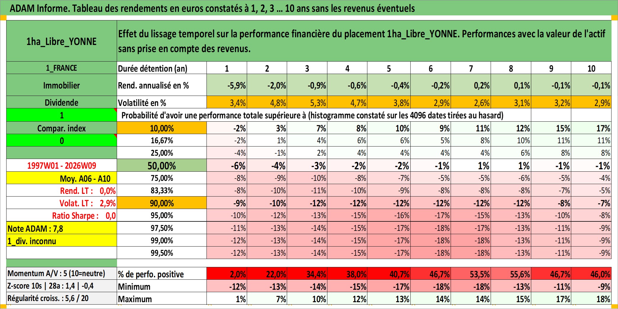Site dédié aux investisseursPage dédiée sur site financeAnalyse des valorisations hebdomadaires de l'actif 1ha_Libre_YONNE. Cet actif est cote en EUR. Les valorisations couvrent les semaines 1997W01 a 2026W09. Les fermages de ce bien foncier sont pris egaux a 2,5% annuels de la valeur venale du bien.