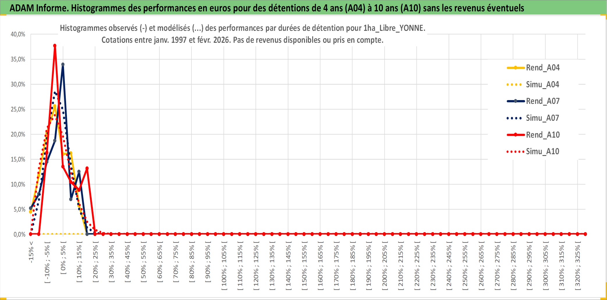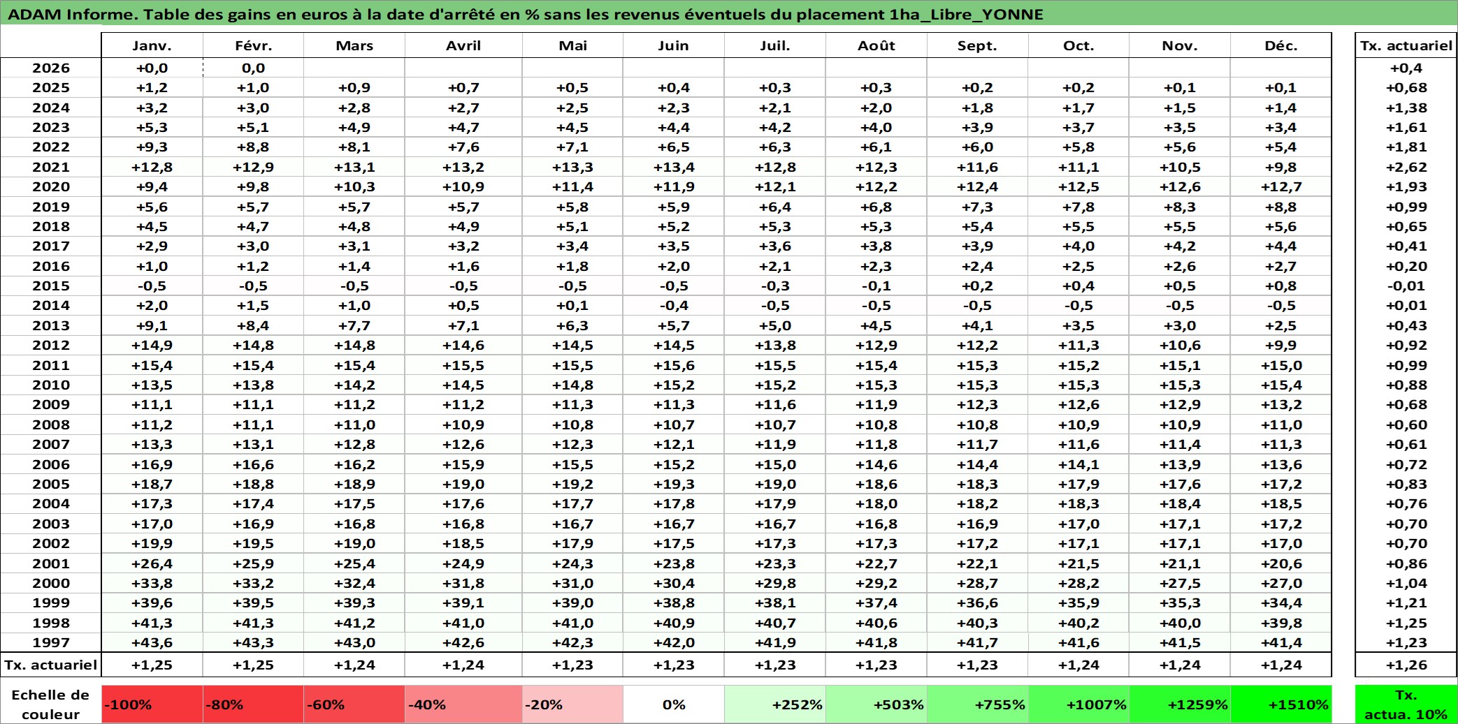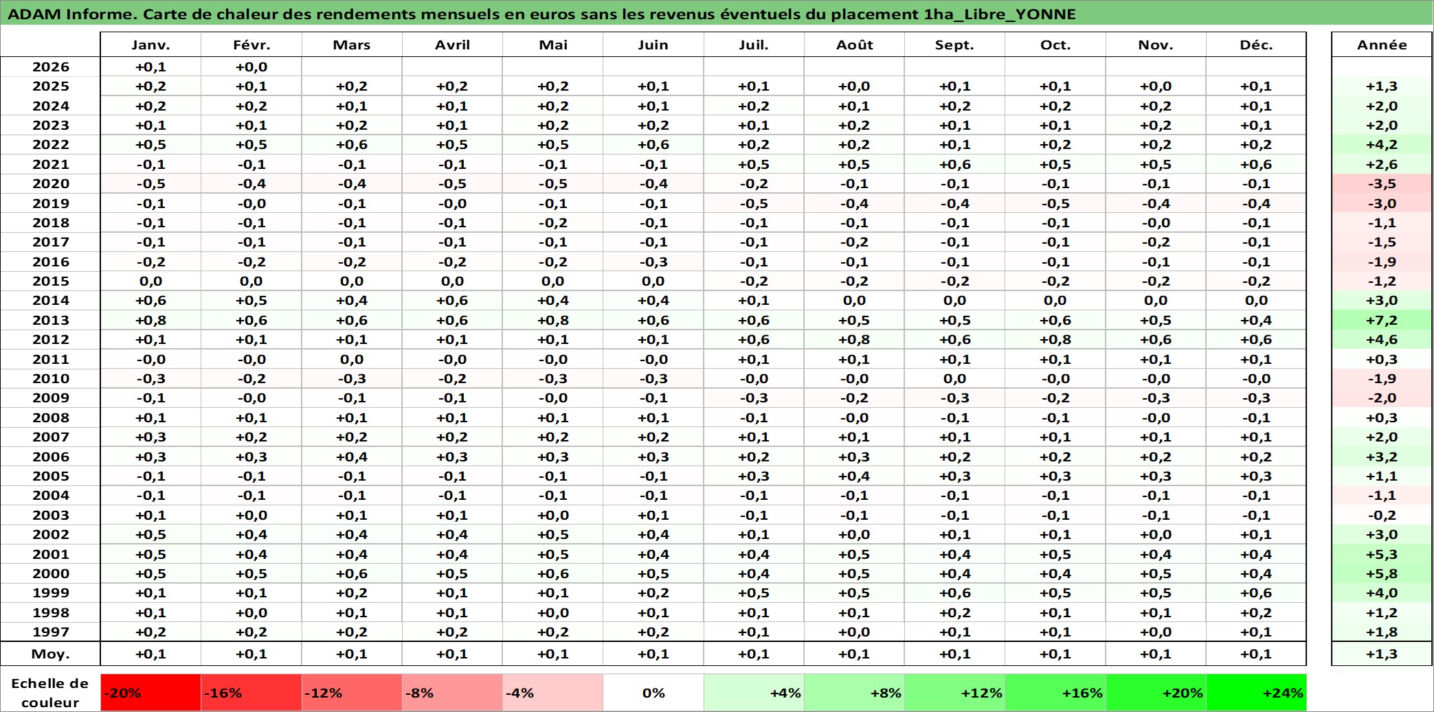Site dédié aux investisseursPage dédiée sur site financeAnalyse des valorisations hebdomadaires de l'actif 1ha_Libre_YONNE. Cet actif est cote en EUR. Les valorisations couvrent les semaines 1997W01 a 2026W09. Les fermages de ce bien foncier sont pris egaux a 2,5% annuels de la valeur venale du bien.