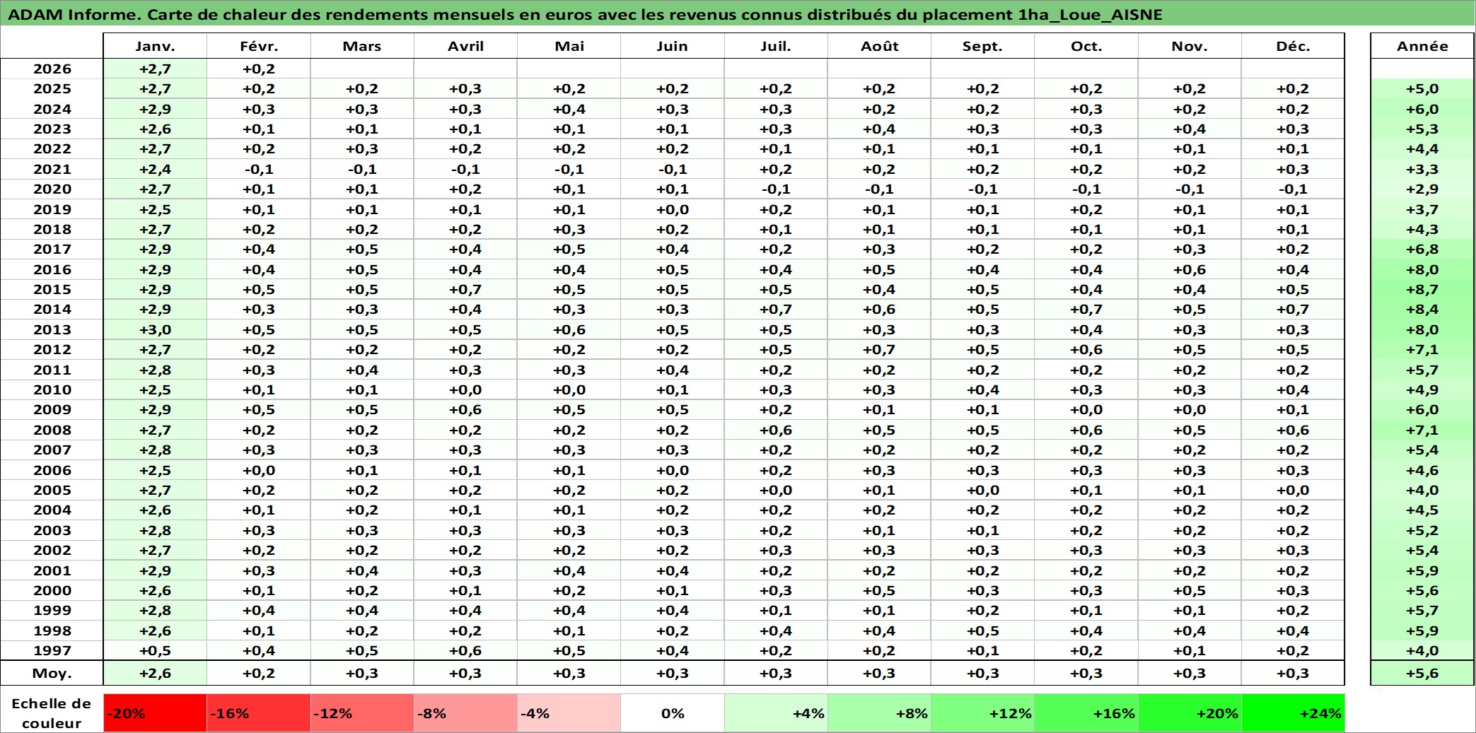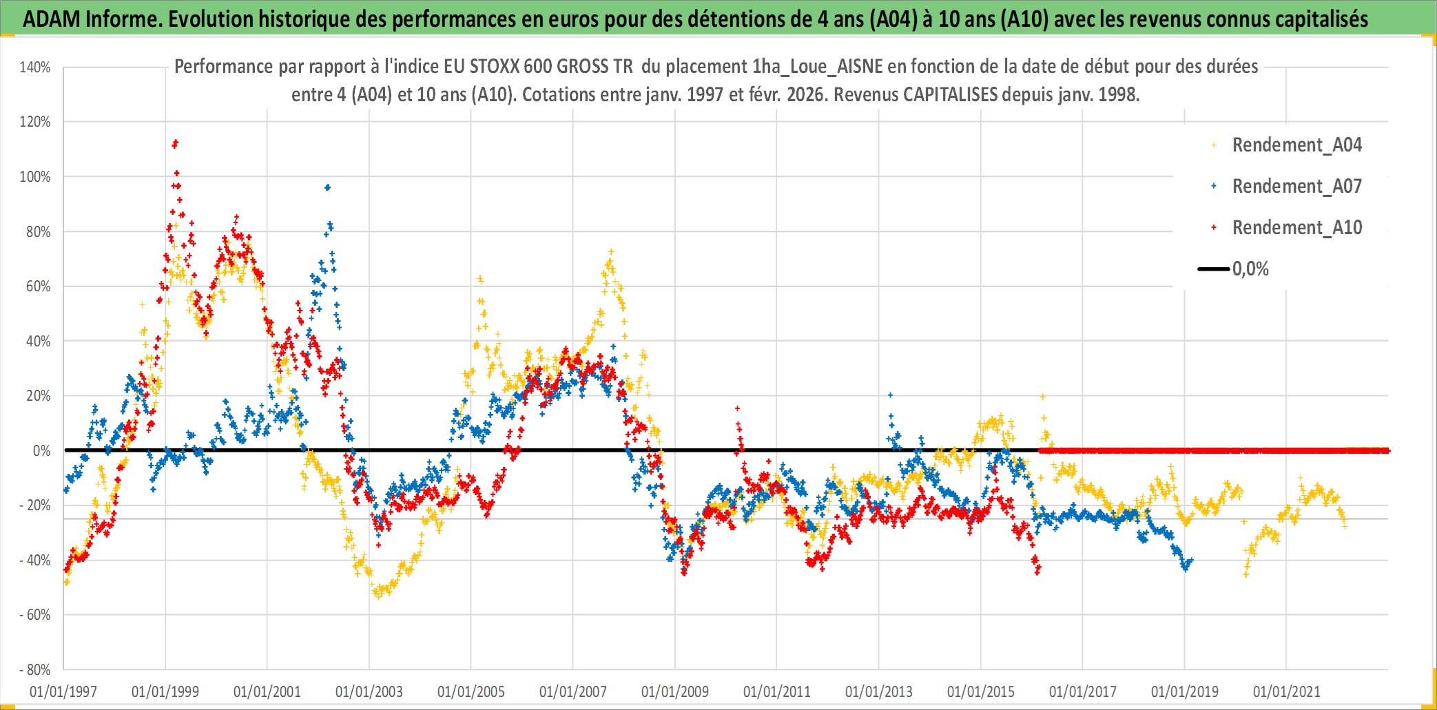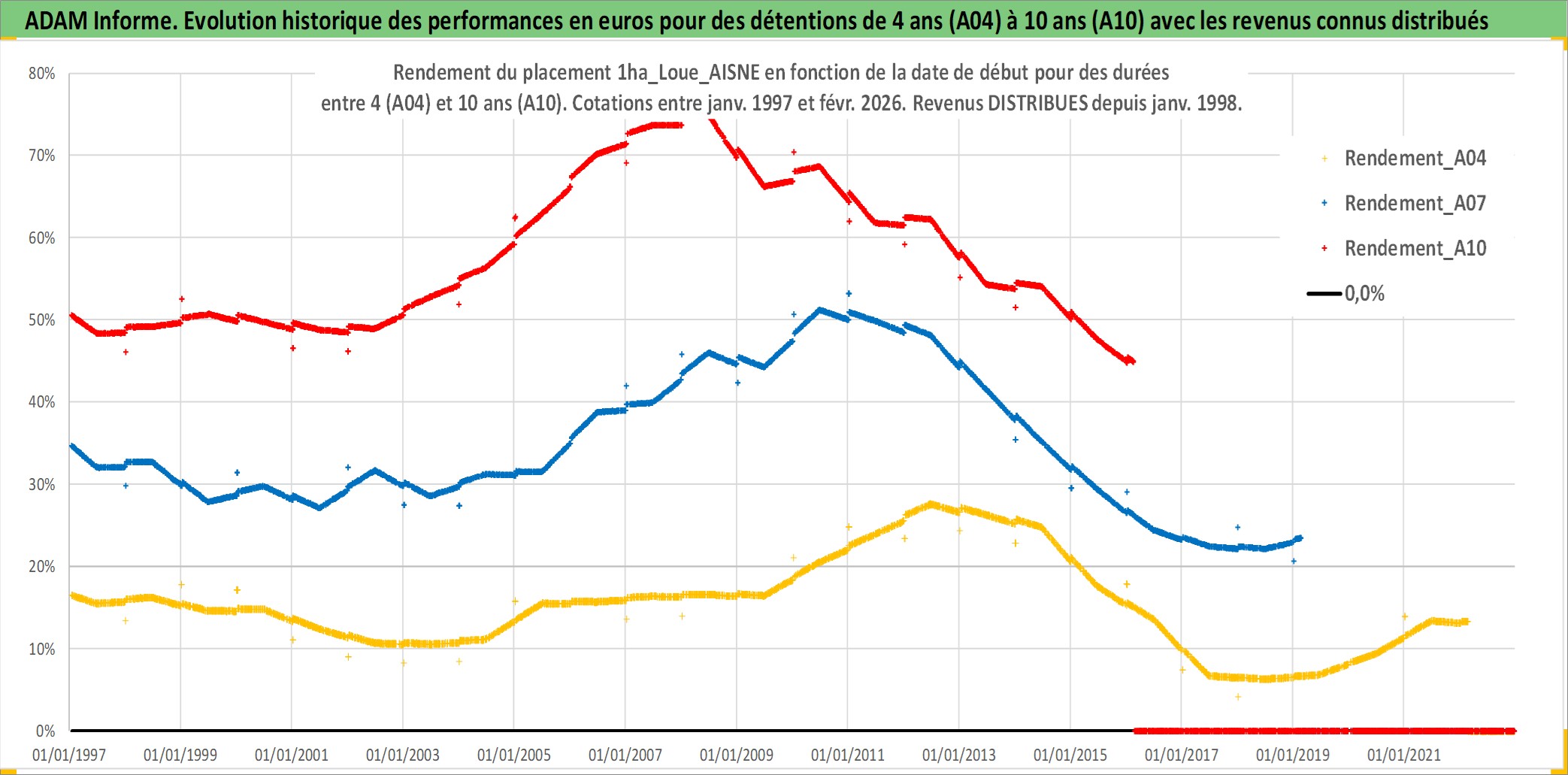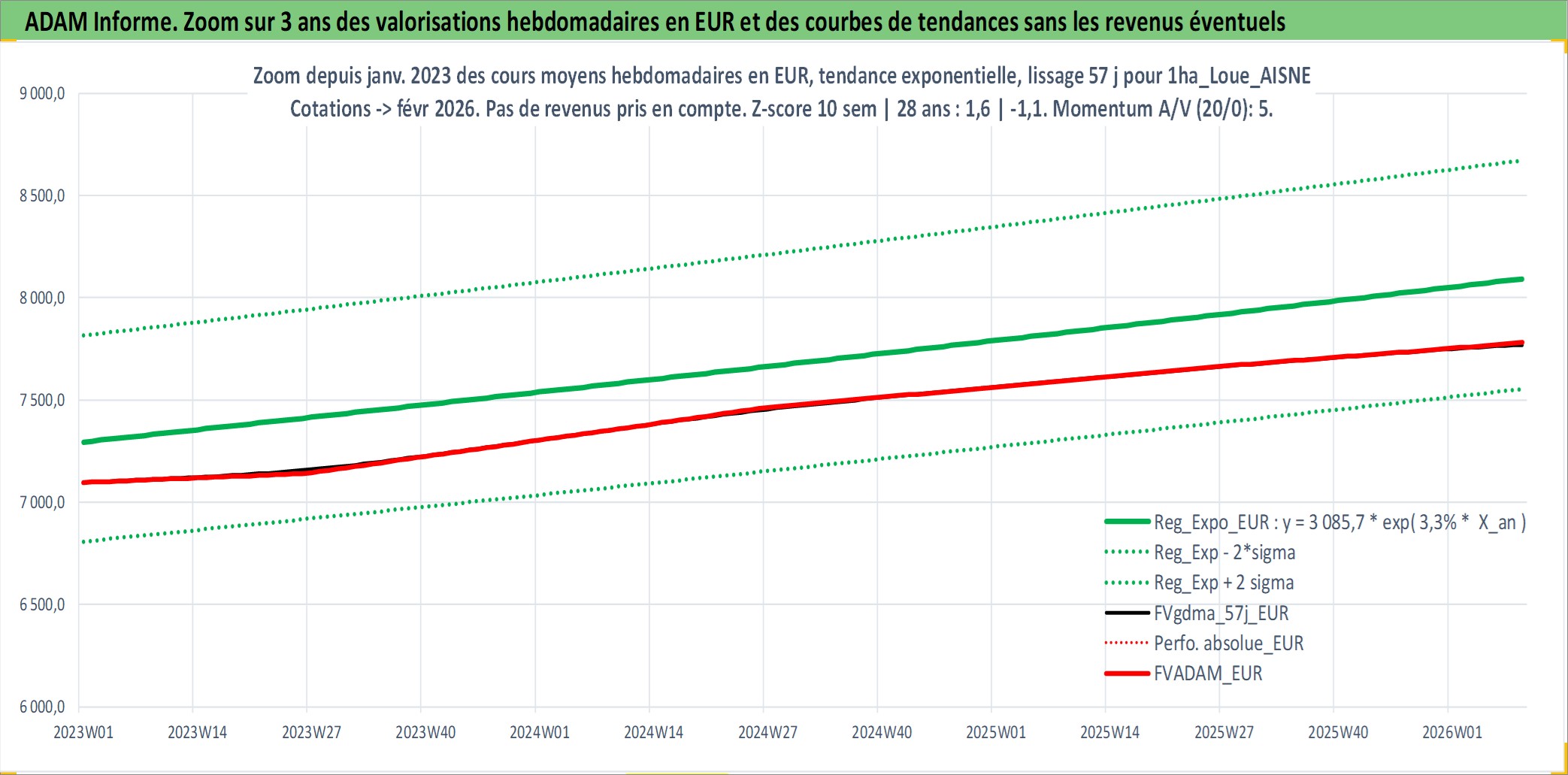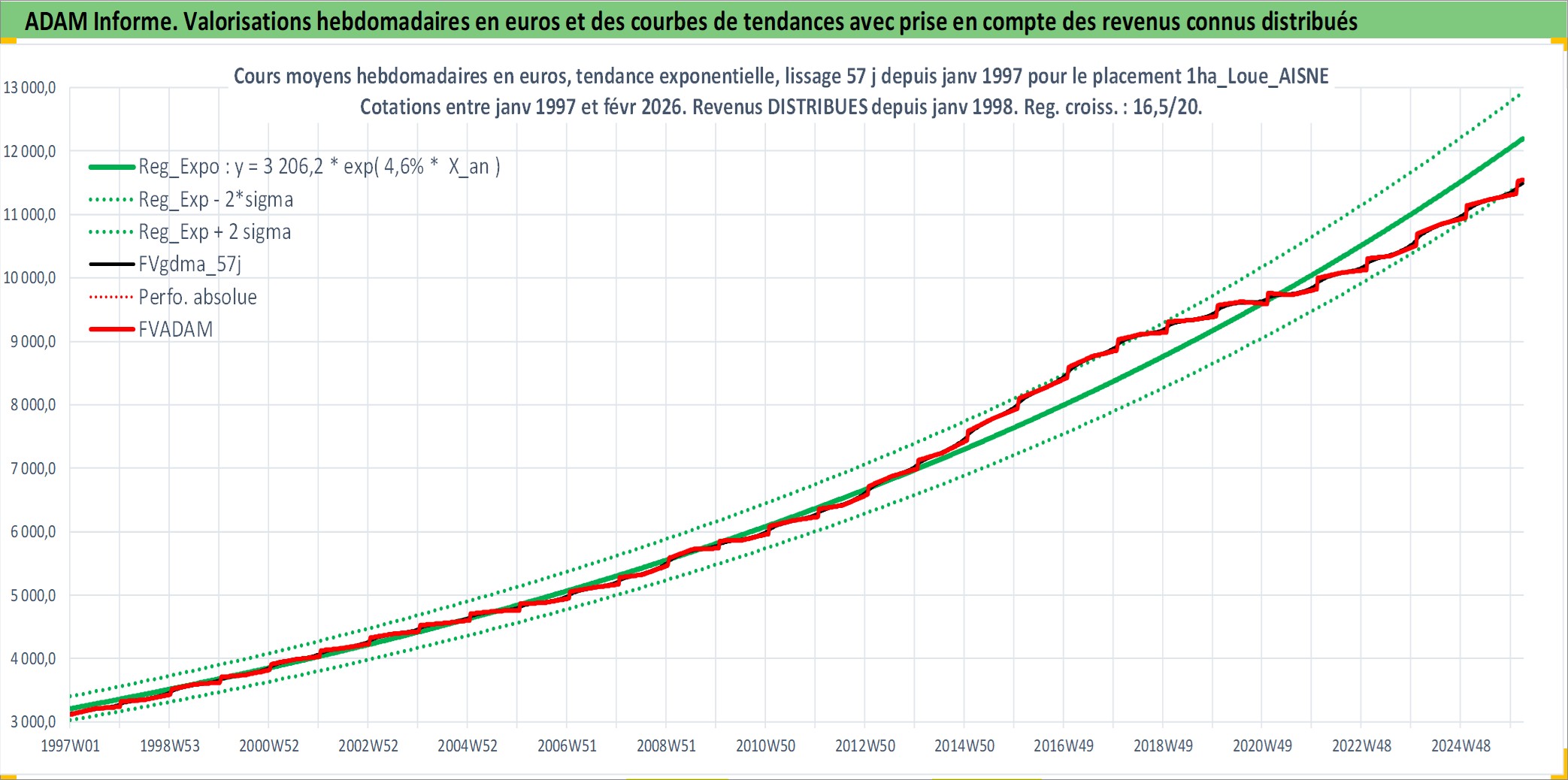 Site dédié aux investisseursPage dédiée sur site financeAnalyse des valorisations hebdomadaires de l'actif 1ha_Loue_AISNE. Cet actif est cote en EUR. Les valorisations couvrent les semaines 1997W01 a 2026W09. Les fermages de ce bien foncier sont pris egaux a 2,5% annuels de la valeur venale du bien.