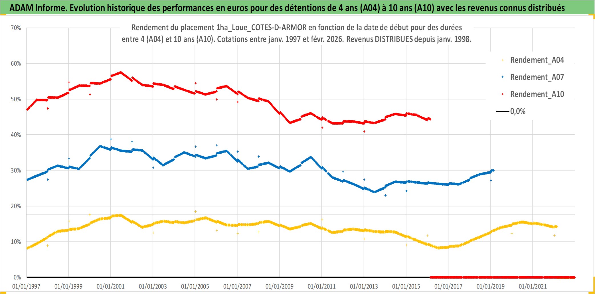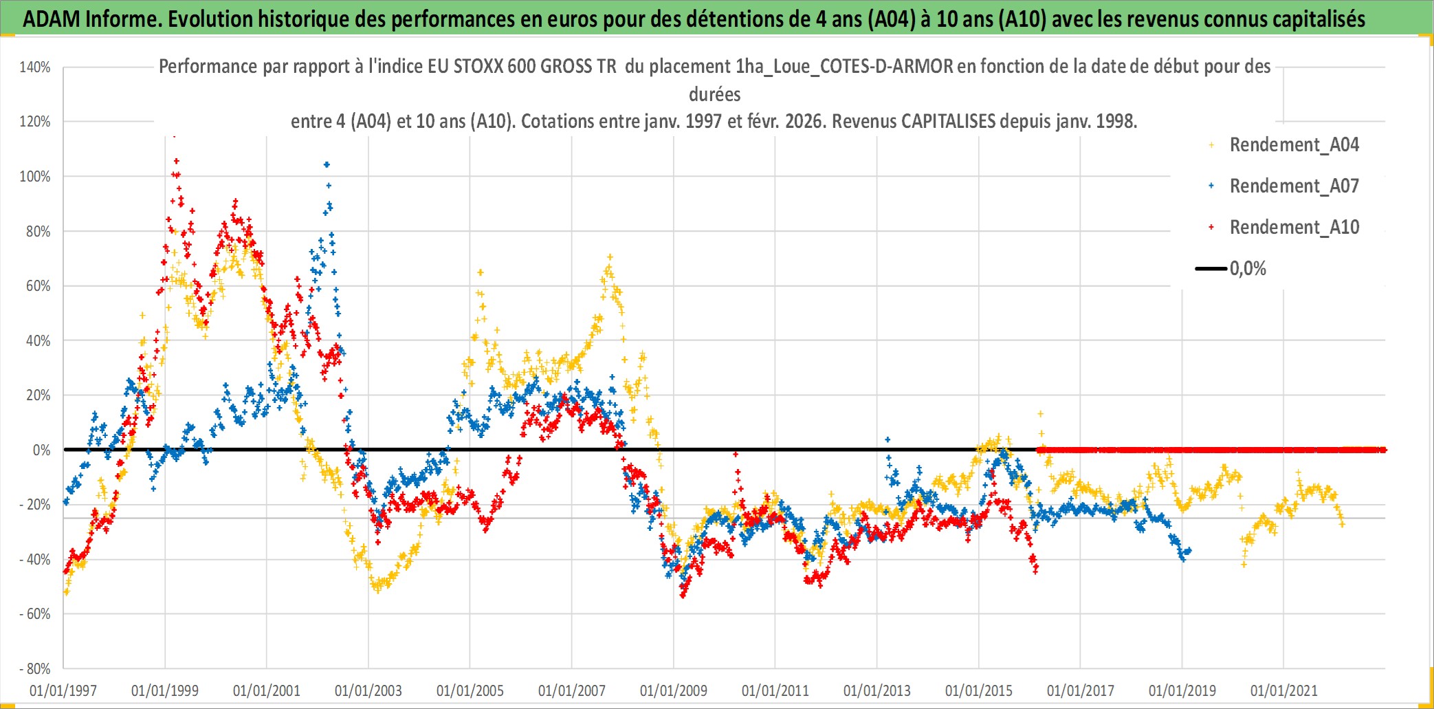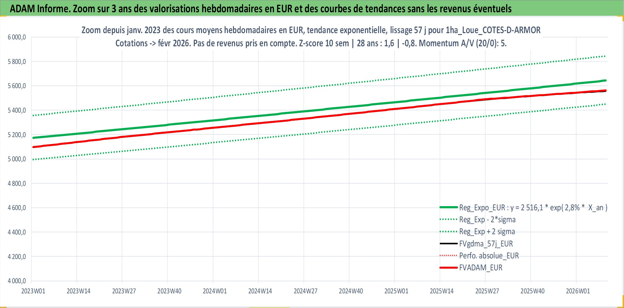 Site dédié aux investisseursPage dédiée sur site financeAnalyse des valorisations hebdomadaires de l'actif 1ha_Loue_COTES-D-ARMOR. Cet actif est cote en EUR. Les valorisations couvrent les semaines 1997W01 a 2026W09. Les fermages de ce bien foncier sont pris egaux a 2,5% annuels de la valeur venale du bien.