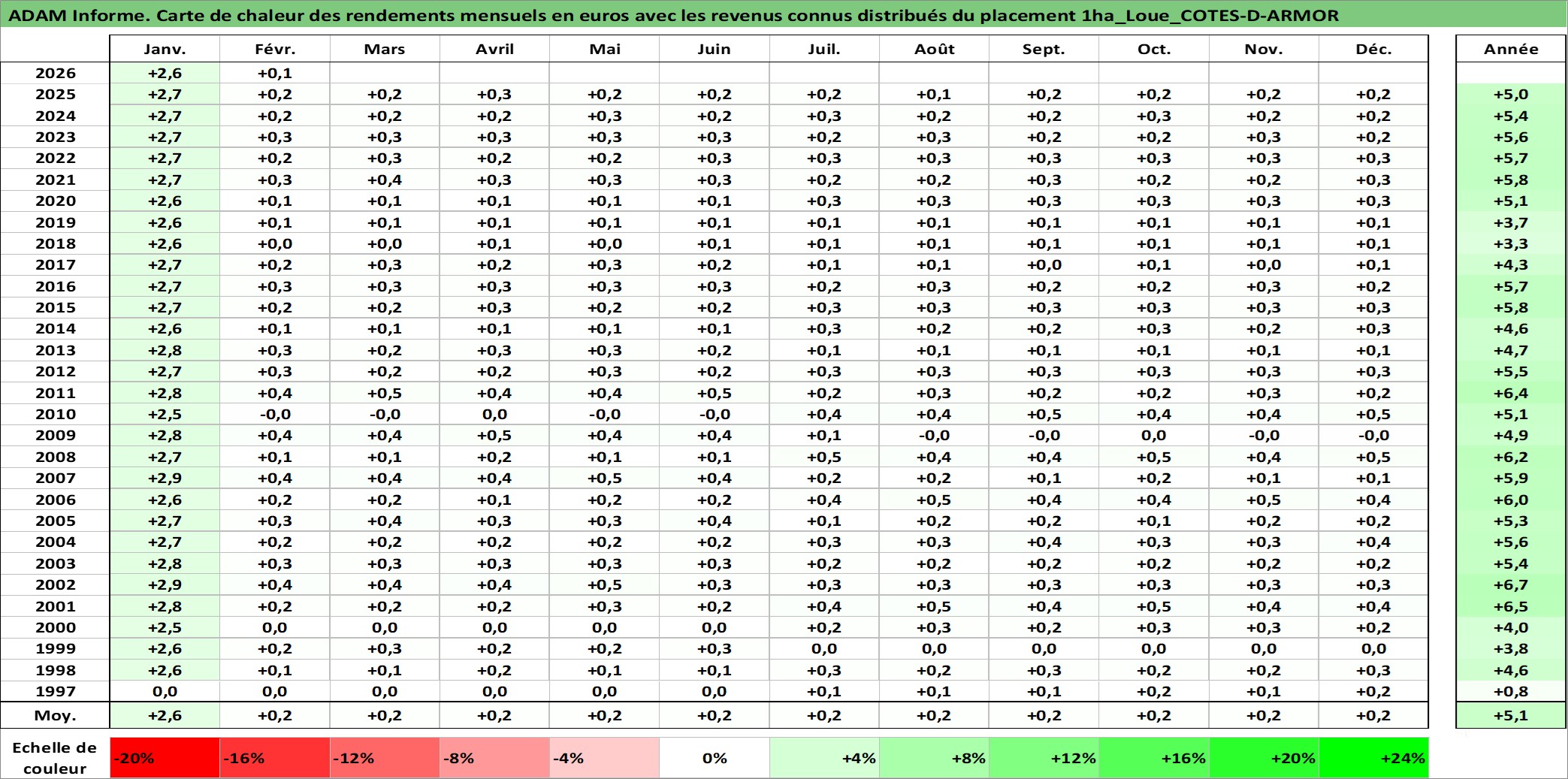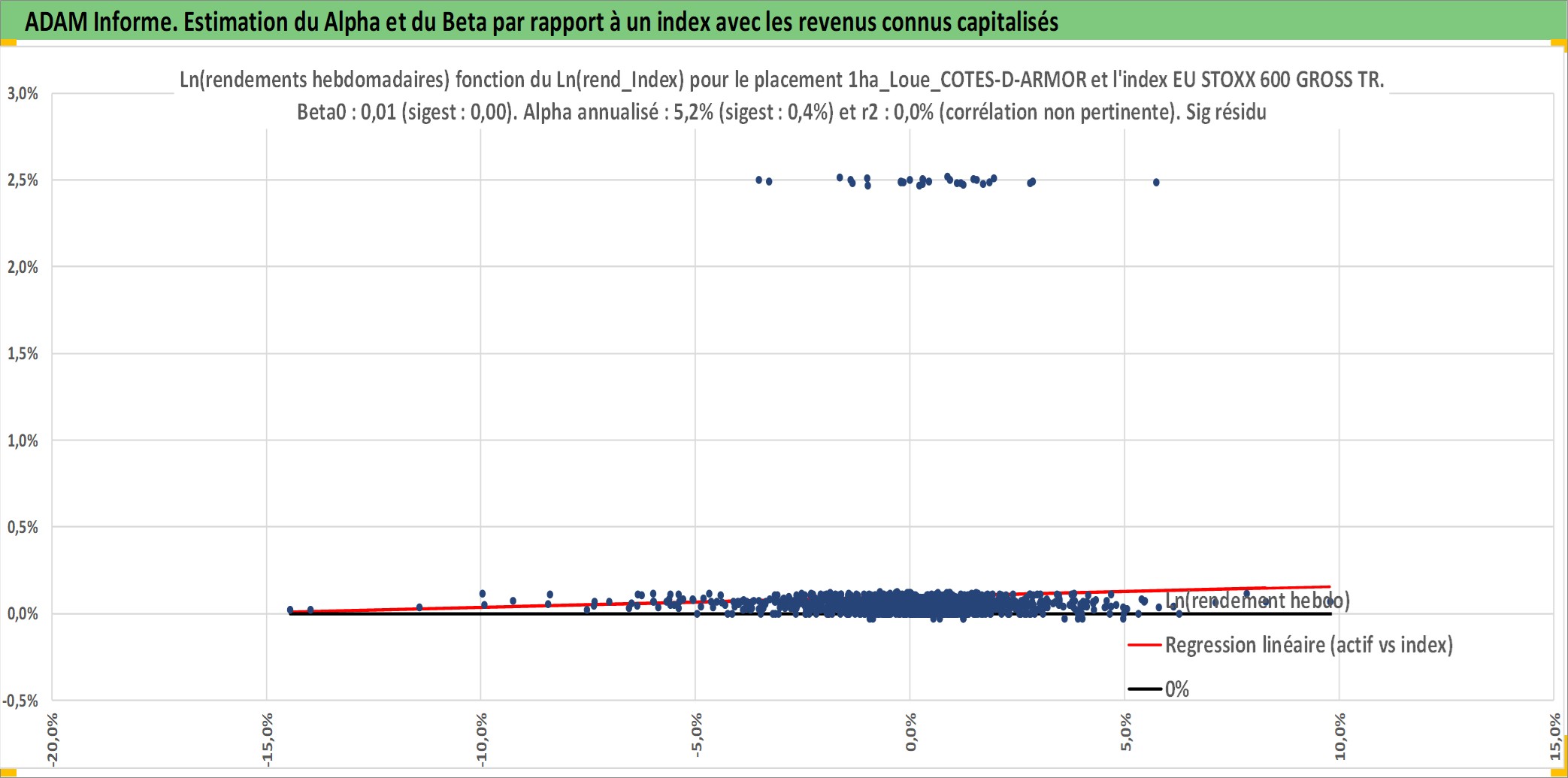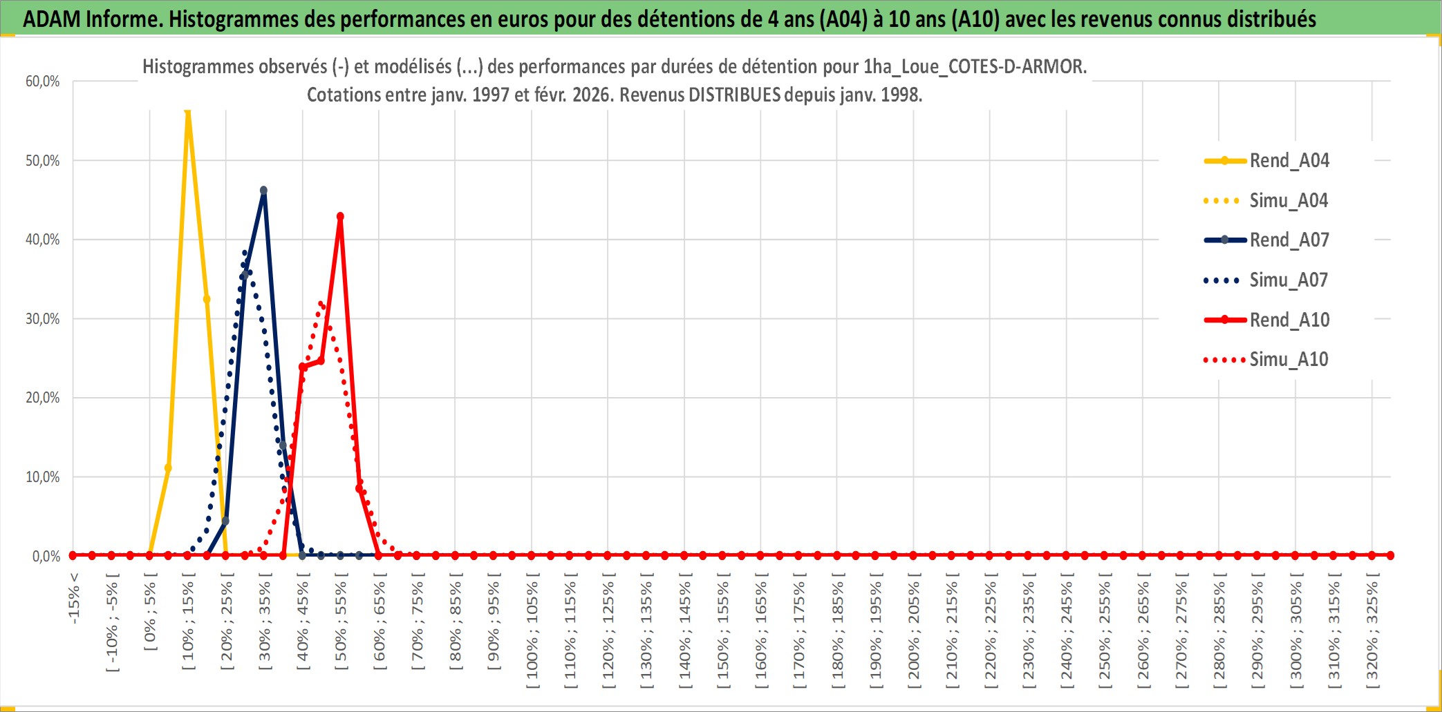 Site dédié aux investisseursPage dédiée sur site financeAnalyse des valorisations hebdomadaires de l'actif 1ha_Loue_COTES-D-ARMOR. Cet actif est cote en EUR. Les valorisations couvrent les semaines 1997W01 a 2026W09. Les fermages de ce bien foncier sont pris egaux a 2,5% annuels de la valeur venale du bien.
