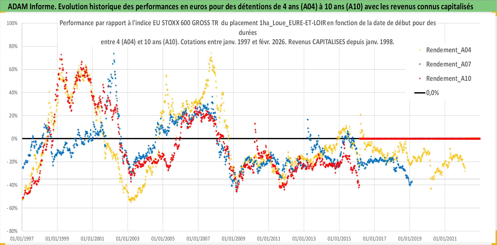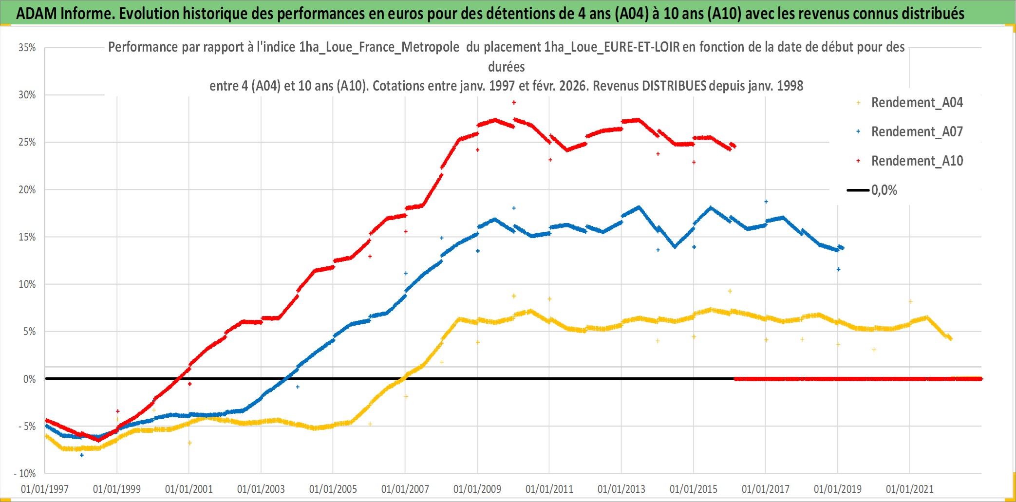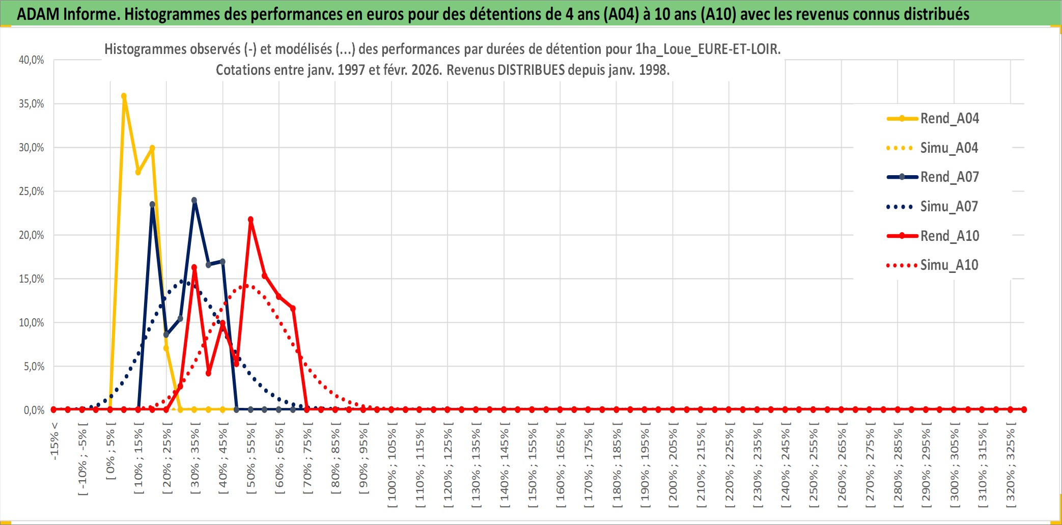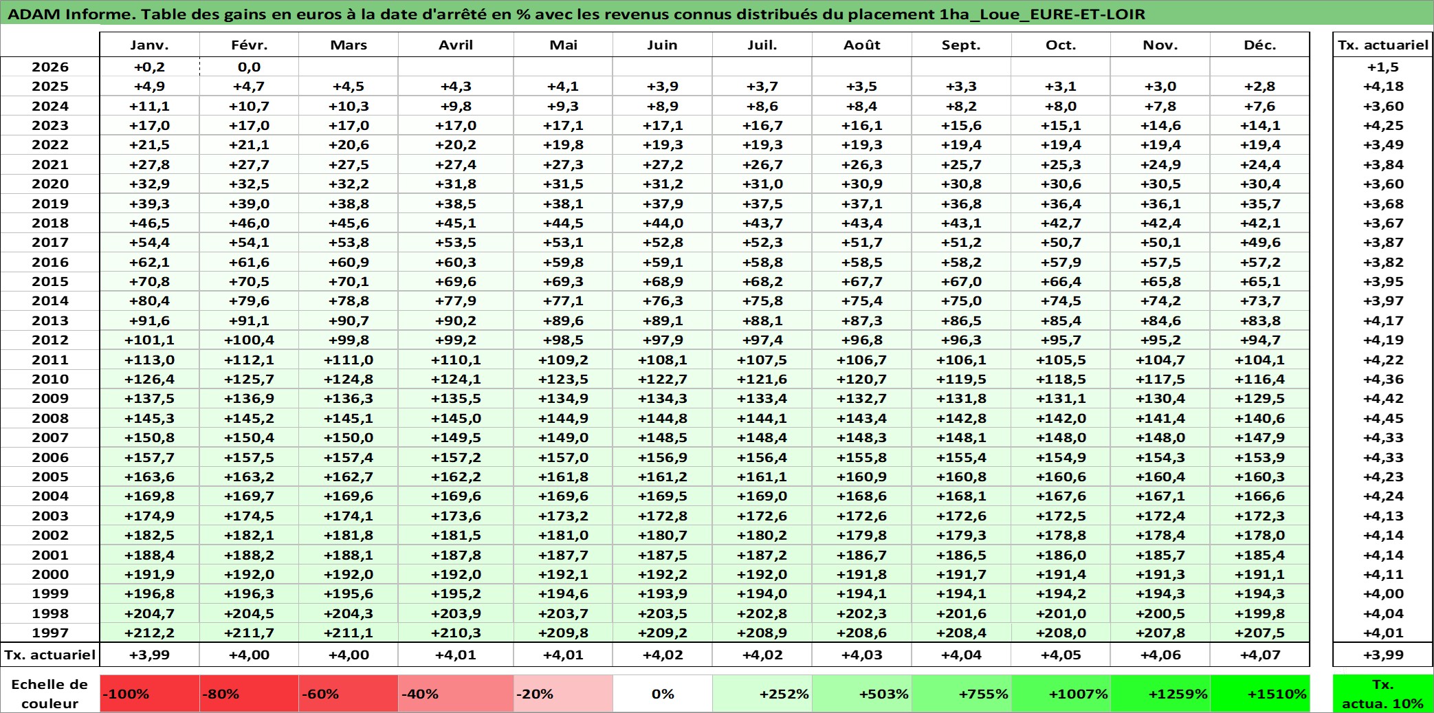 Site dédié aux investisseursPage dédiée sur site financeAnalyse des valorisations hebdomadaires de l'actif 1ha_Loue_EURE-ET-LOIR. Cet actif est cote en EUR. Les valorisations couvrent les semaines 1997W01 a 2026W09. Les fermages de ce bien foncier sont pris egaux a 2,5% annuels de la valeur venale du bien.