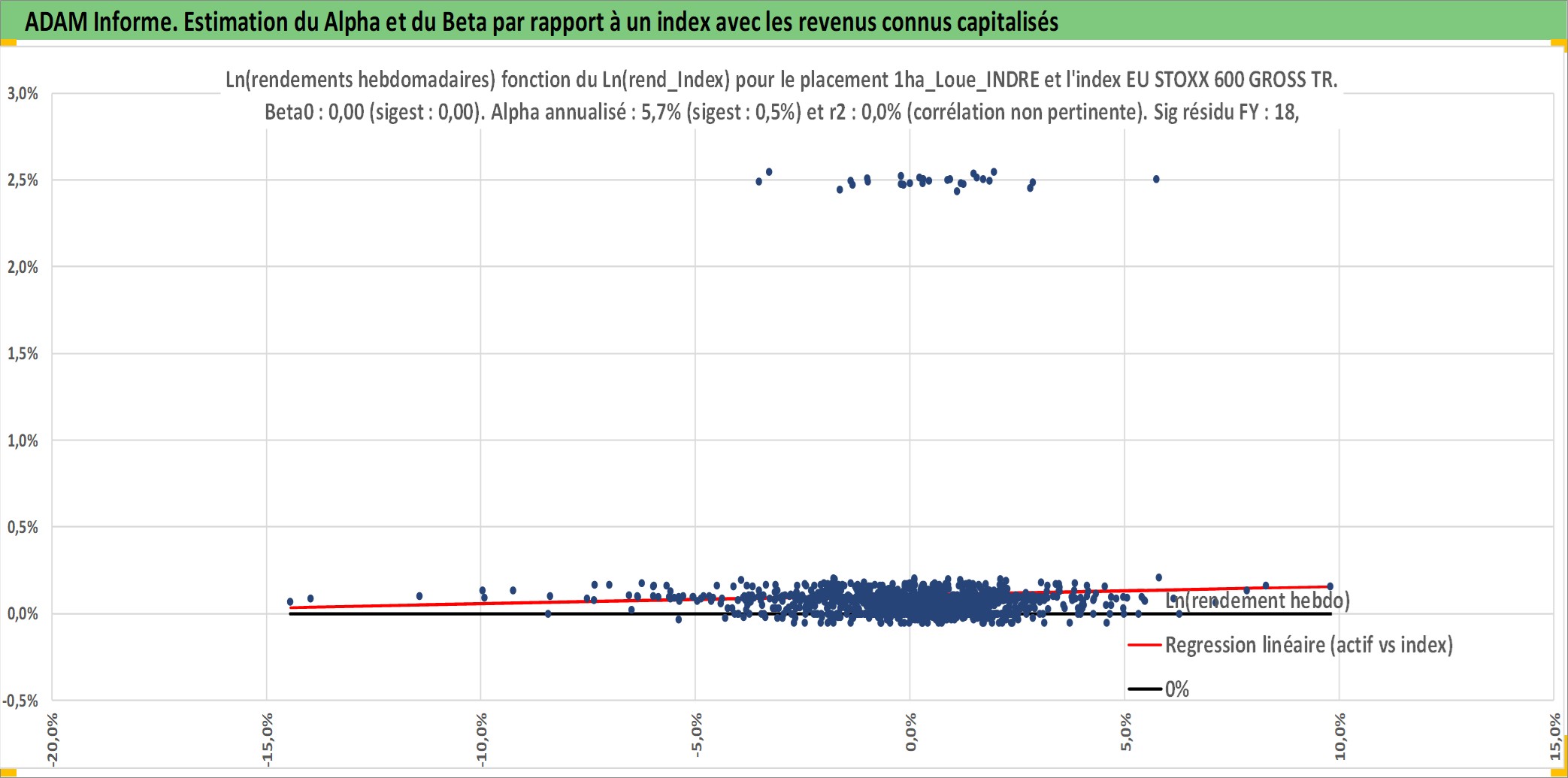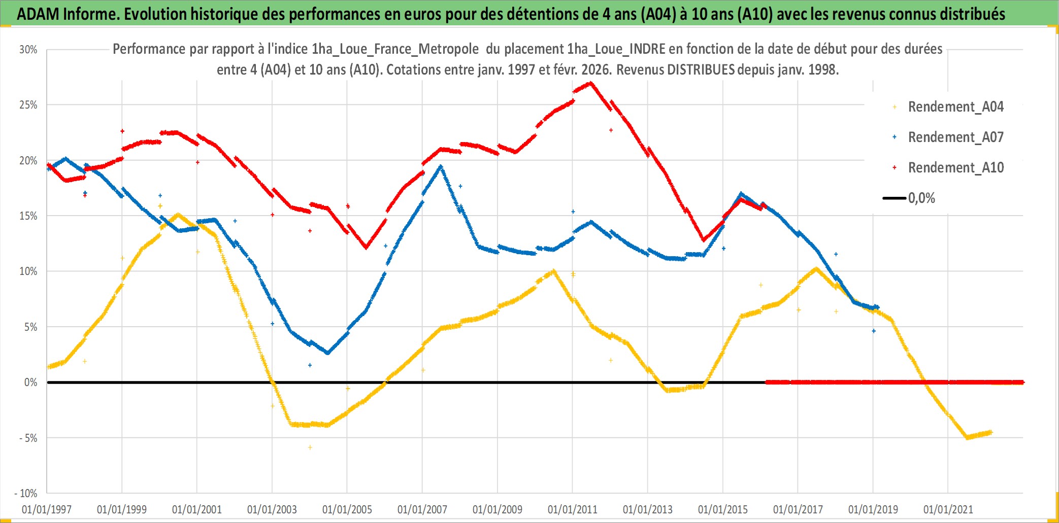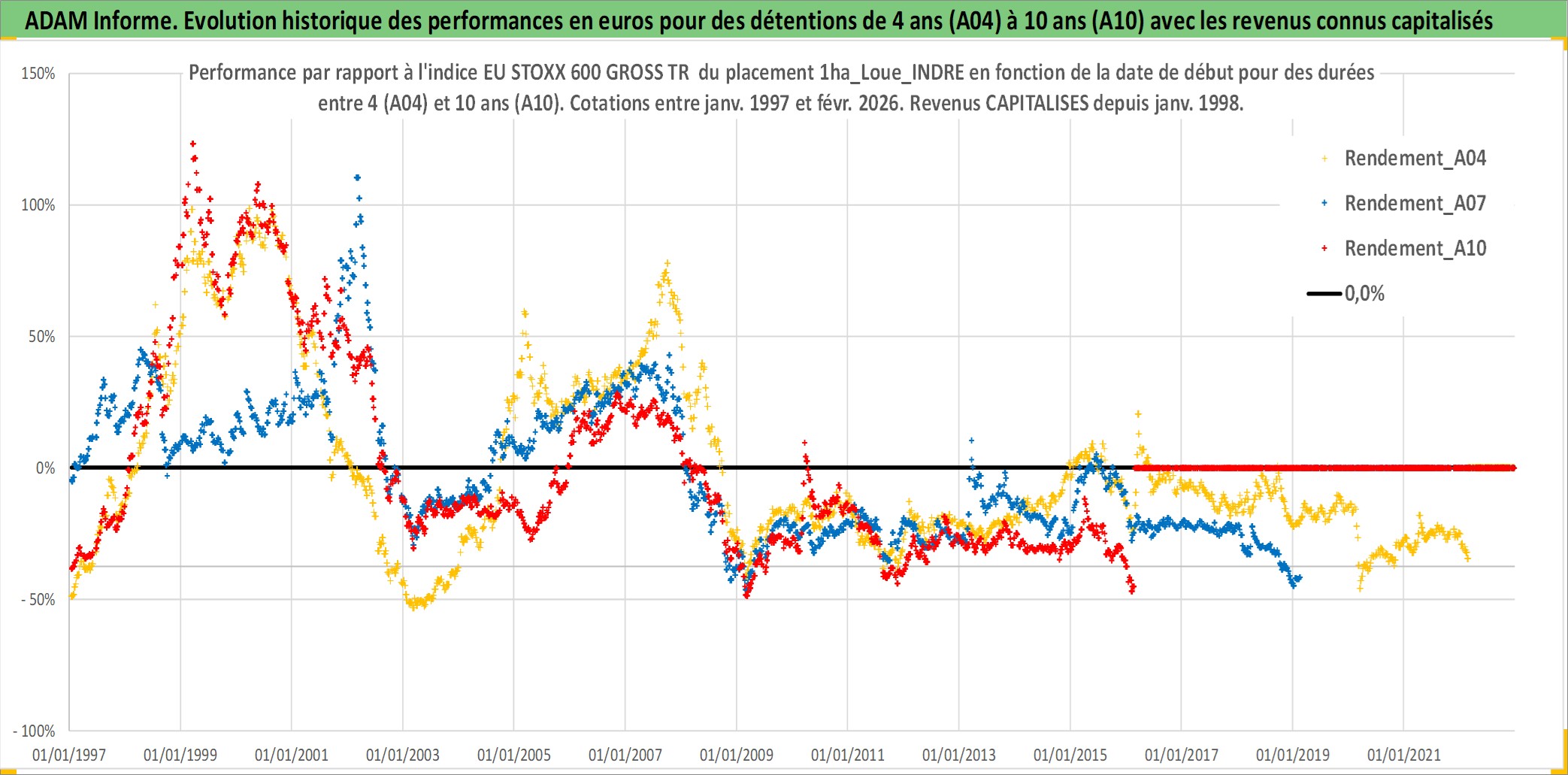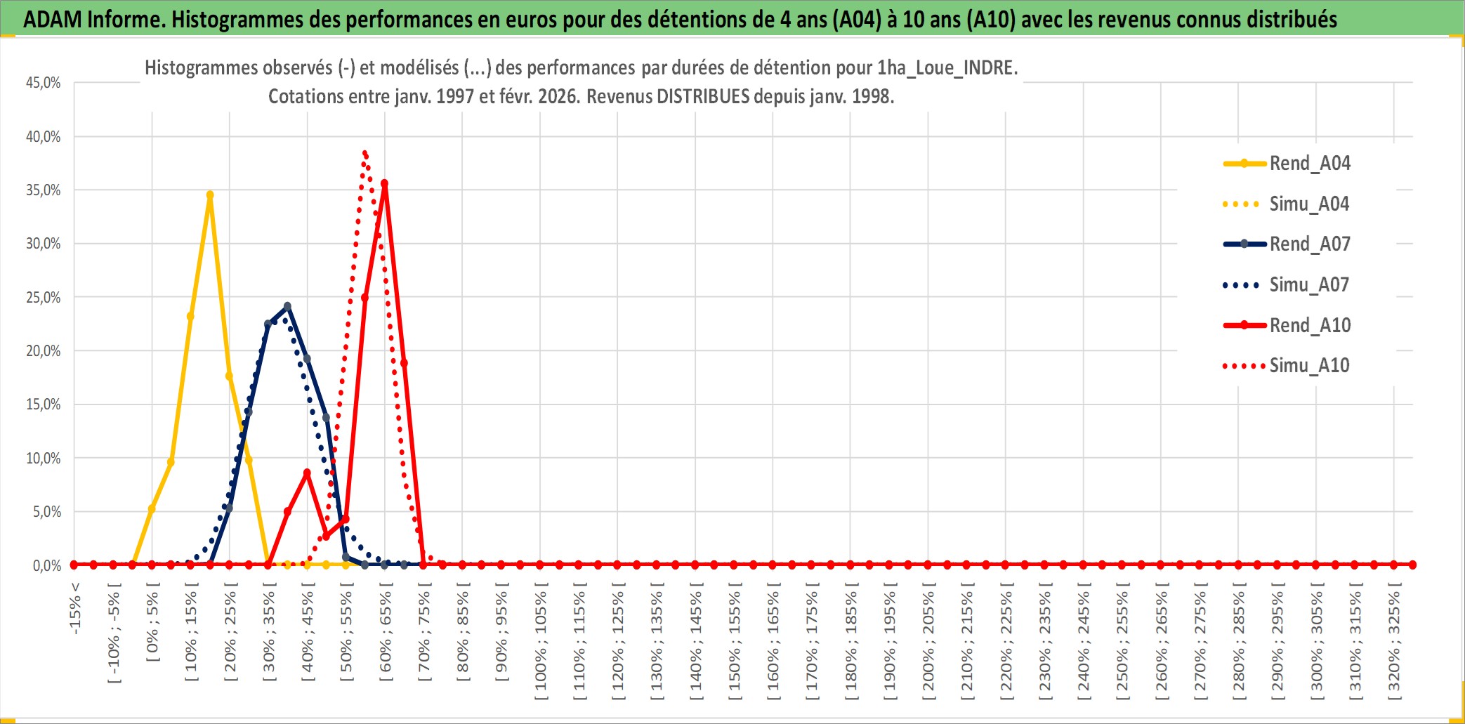 Site dédié aux investisseursPage dédiée sur site financeAnalyse des valorisations hebdomadaires de l'actif 1ha_Loue_INDRE. Cet actif est cote en EUR. Les valorisations couvrent les semaines 1997W01 a 2026W09. Les fermages de ce bien foncier sont pris egaux a 2,5% annuels de la valeur venale du bien.