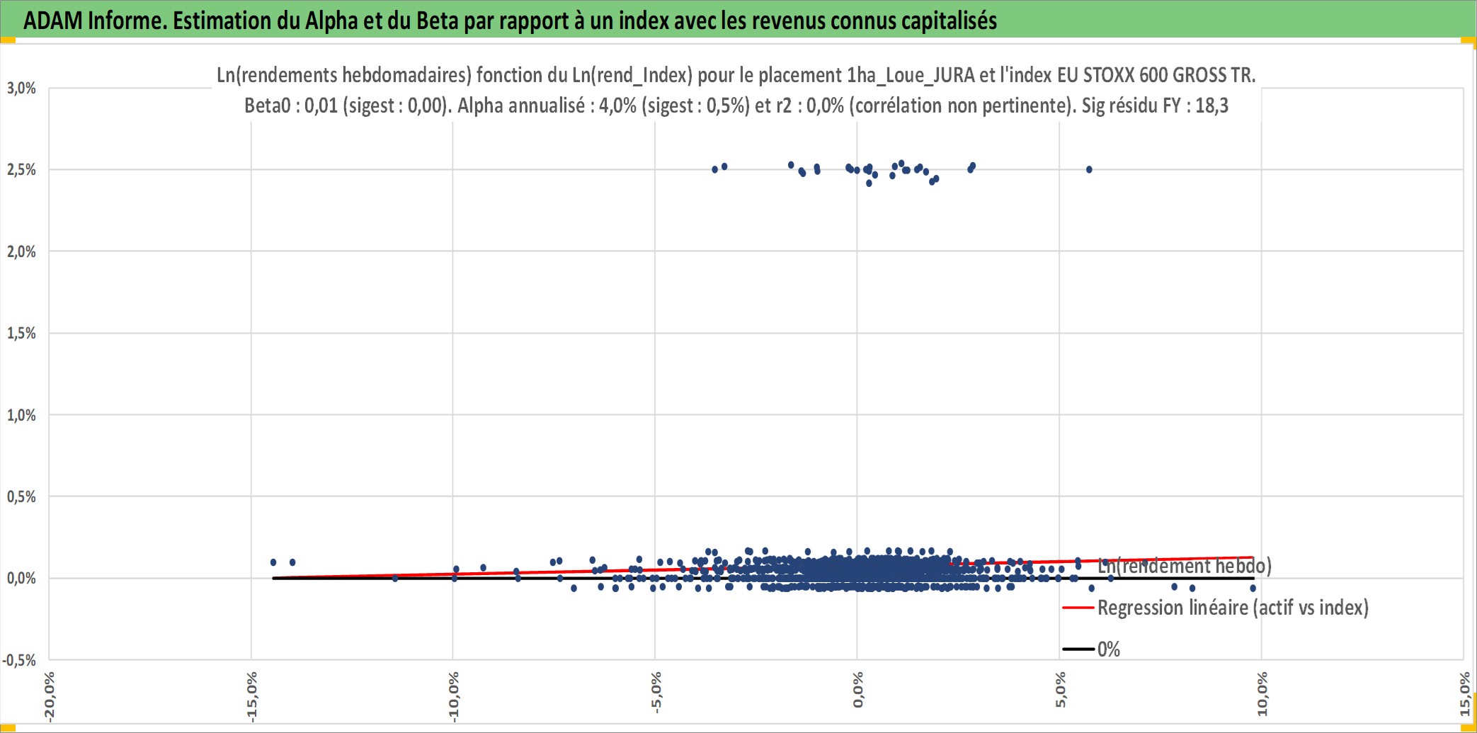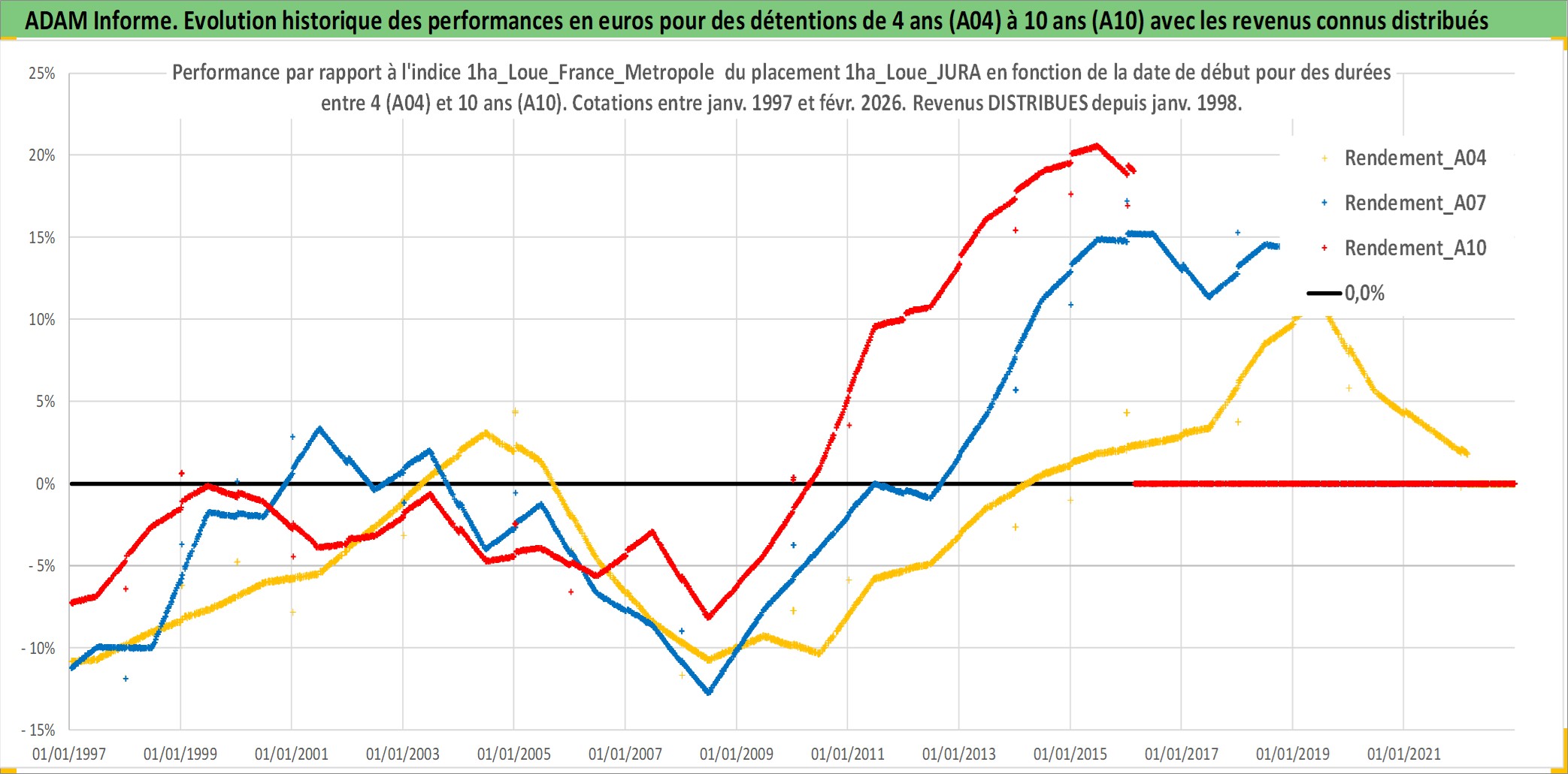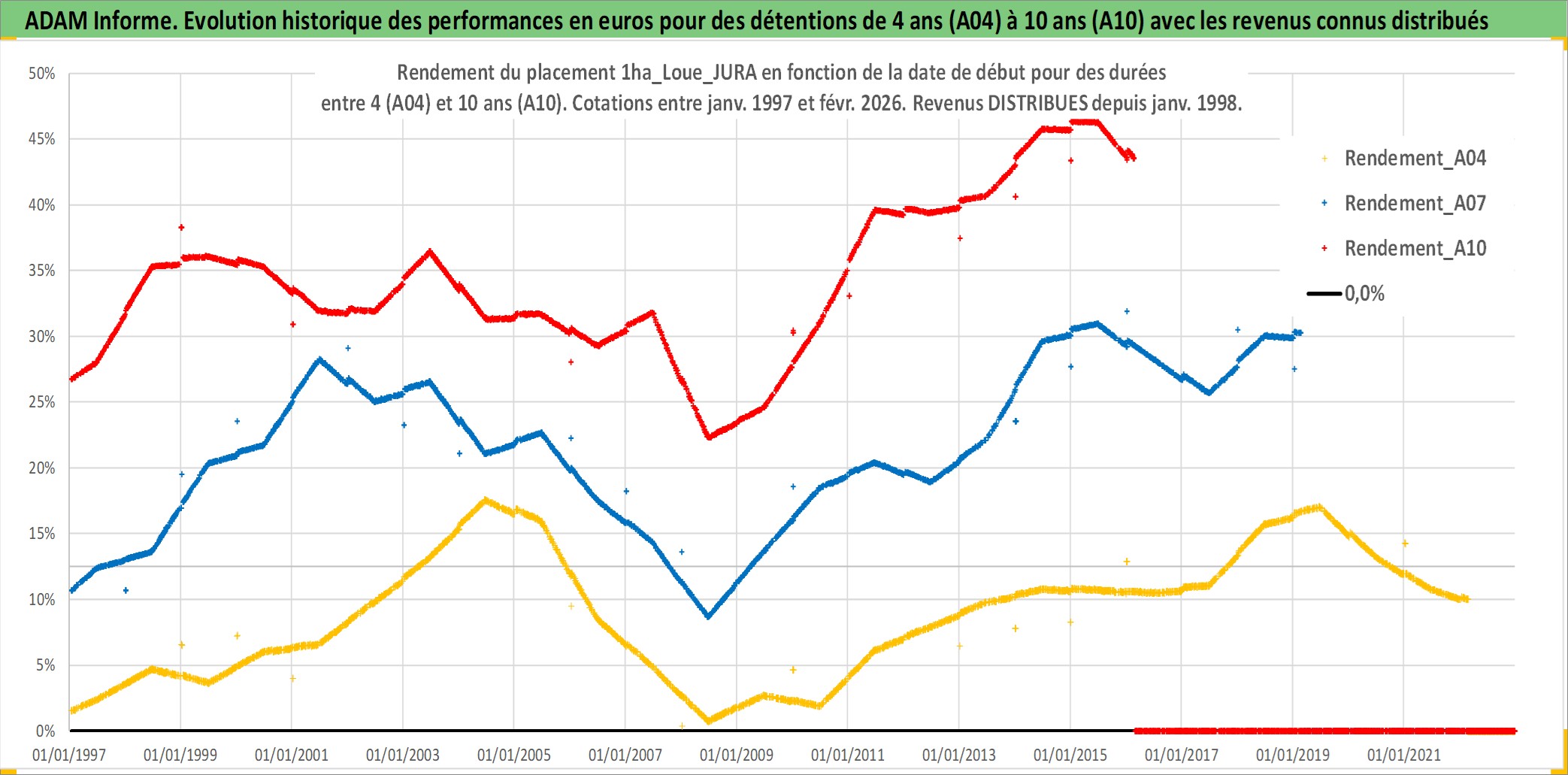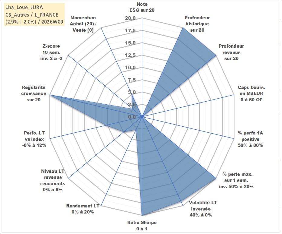 Site dédié aux investisseursPage dédiée sur site financeAnalyse des valorisations hebdomadaires de l'actif 1ha_Loue_JURA. Cet actif est cote en EUR. Les valorisations couvrent les semaines 1997W01 a 2026W09. Les fermages de ce bien foncier sont pris egaux a 2,5% annuels de la valeur venale du bien.