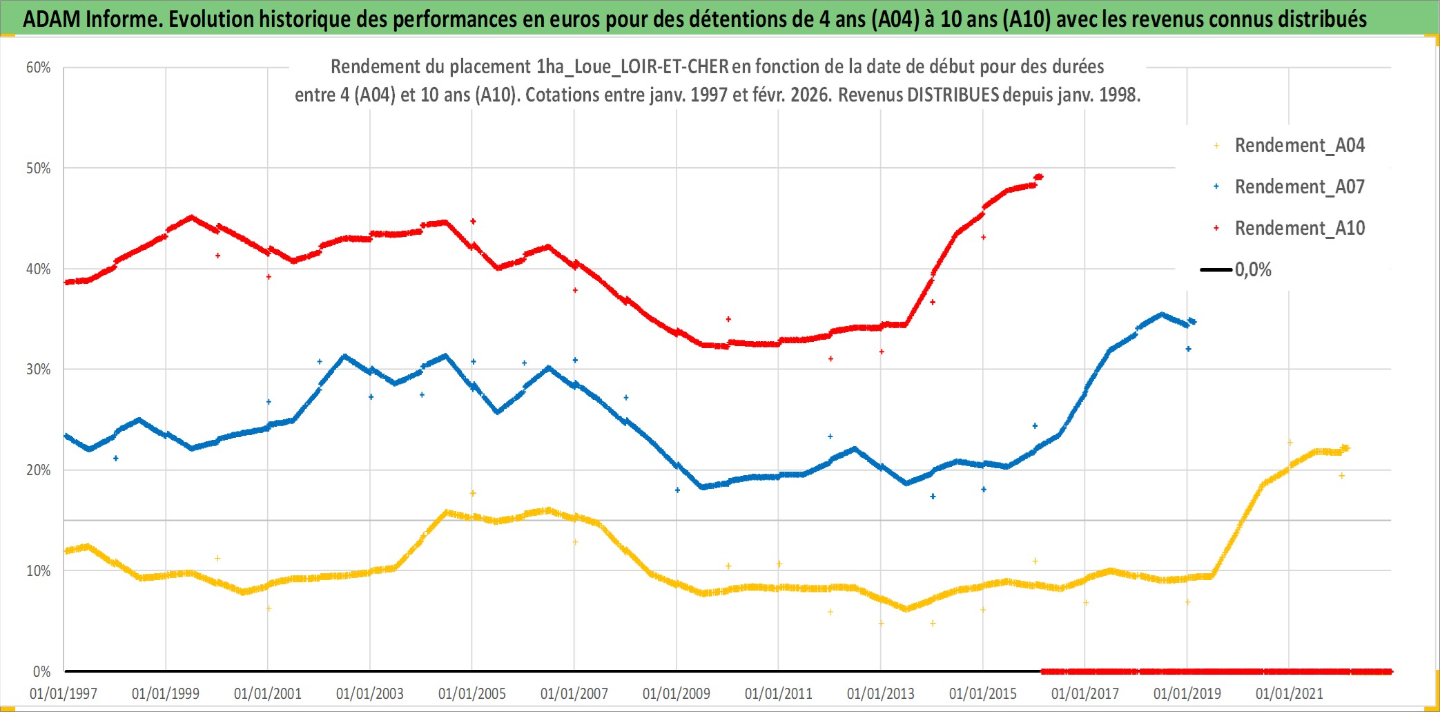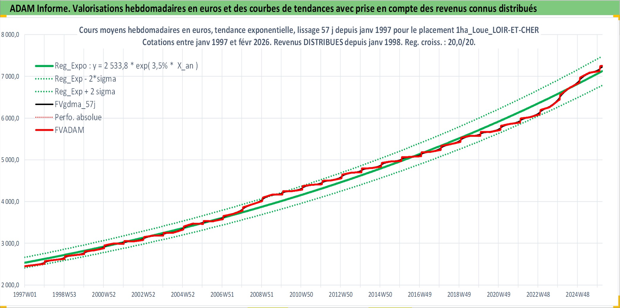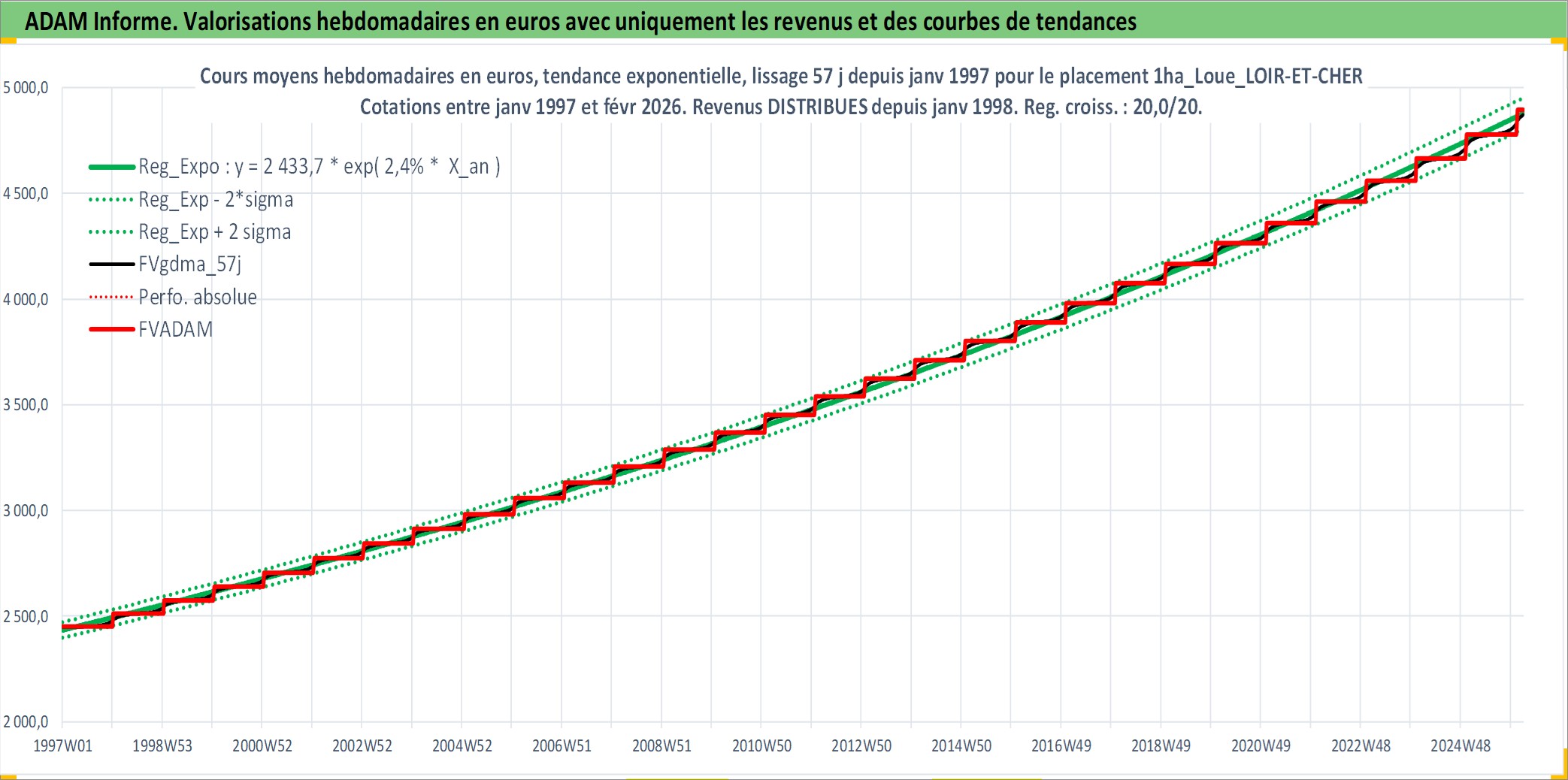 Site dédié aux investisseursPage dédiée sur site financeAnalyse des valorisations hebdomadaires de l'actif 1ha_Loue_LOIR-ET-CHER. Cet actif est cote en EUR. Les valorisations couvrent les semaines 1997W01 a 2026W09. Les fermages de ce bien foncier sont pris egaux a 2,5% annuels de la valeur venale du bien.