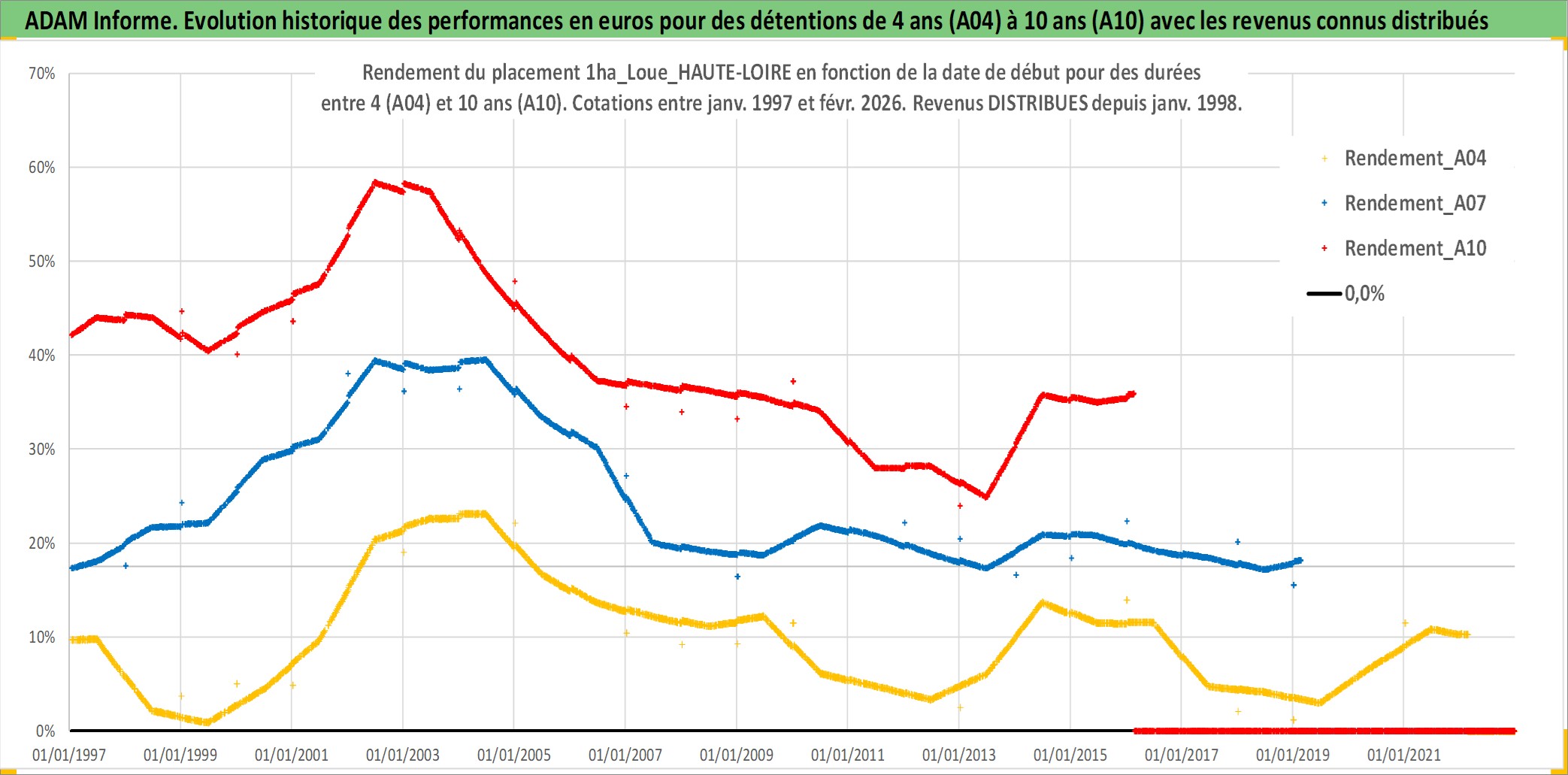 Site dédié aux investisseursPage dédiée sur site financeAnalyse des valorisations hebdomadaires de l'actif 1ha_Loue_HAUTE-LOIRE. Cet actif est cote en EUR. Les valorisations couvrent les semaines 1997W01 a 2026W09. Les fermages de ce bien foncier sont pris egaux a 2,5% annuels de la valeur venale du bien.