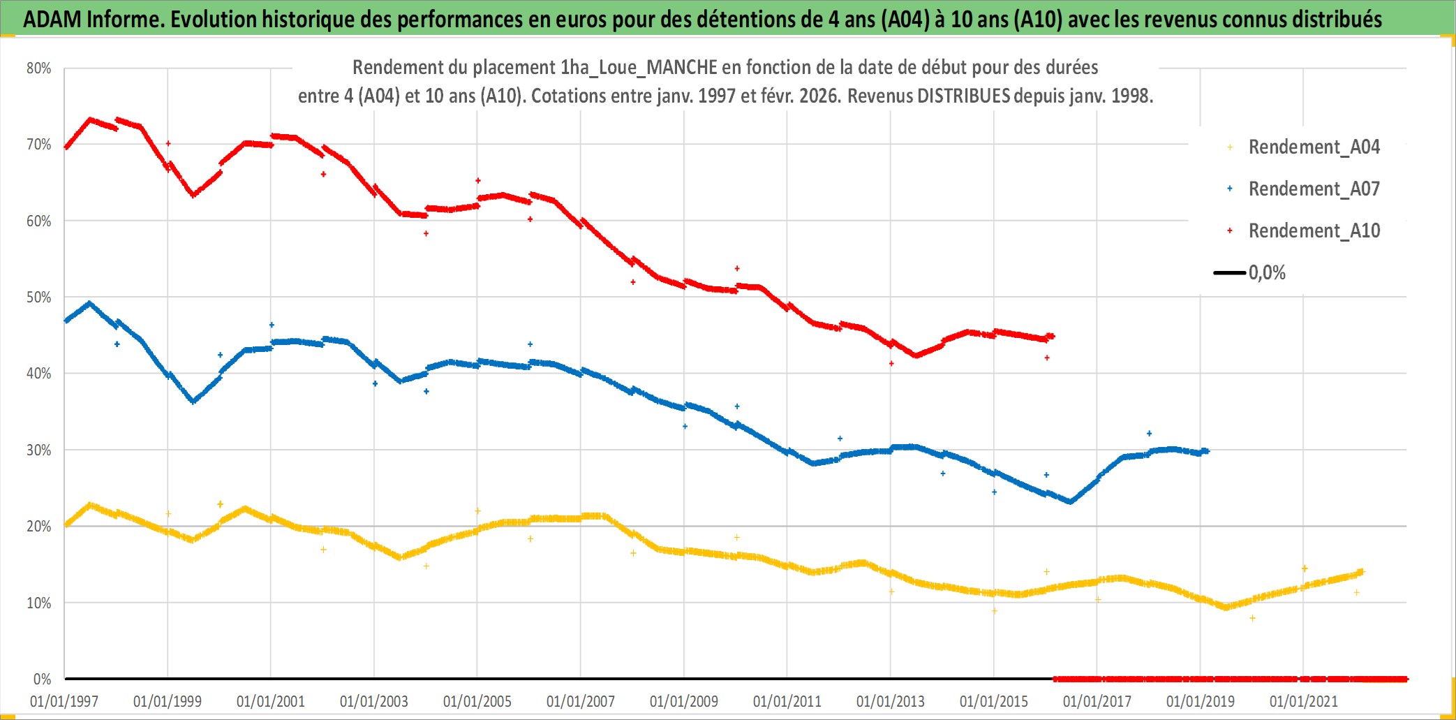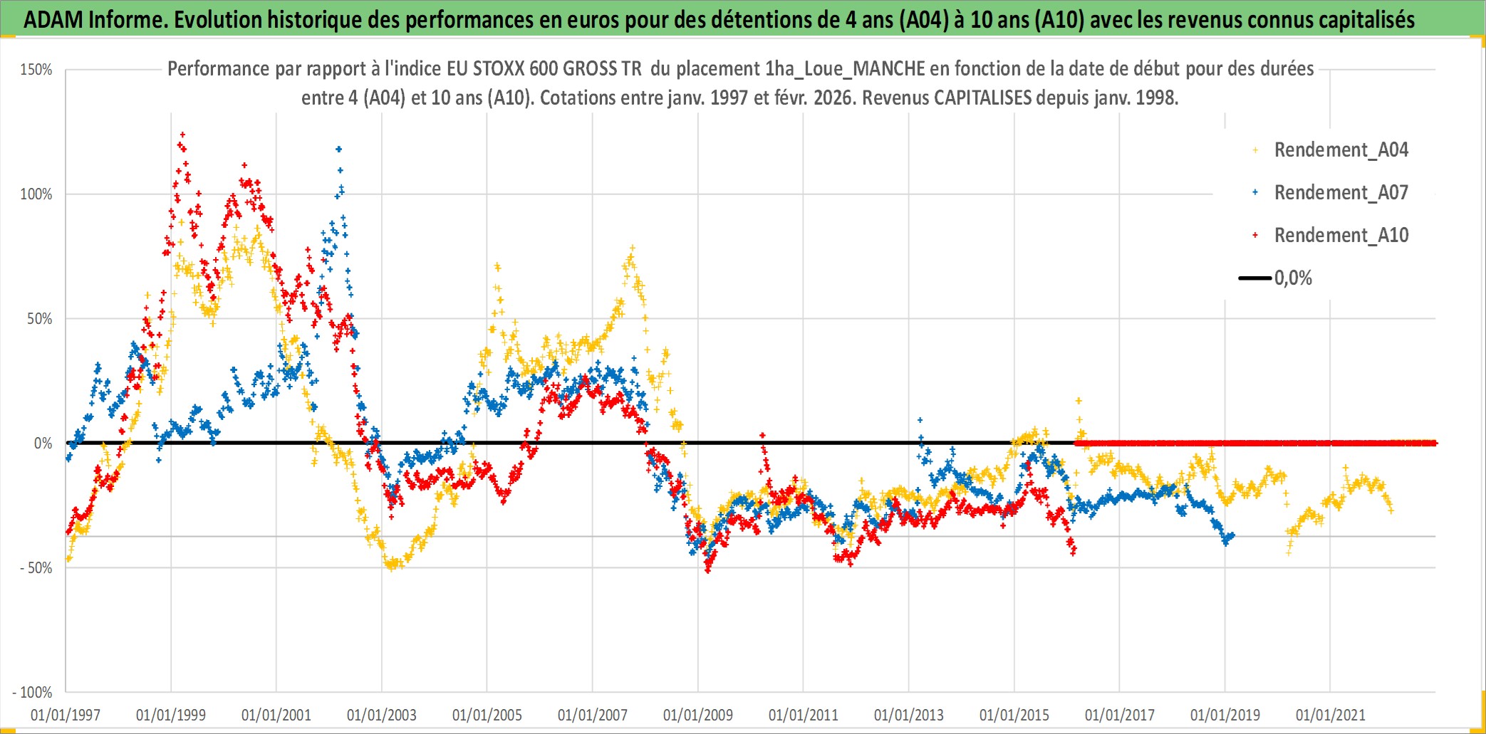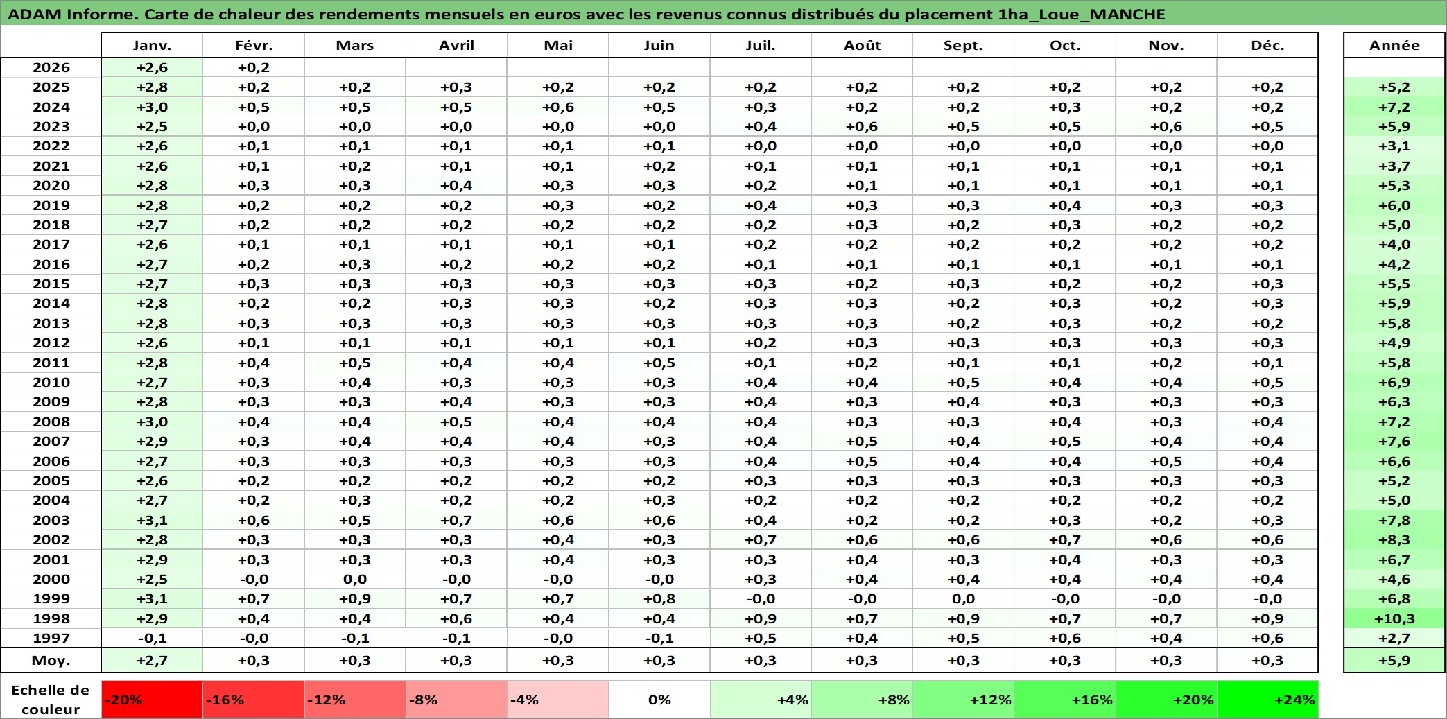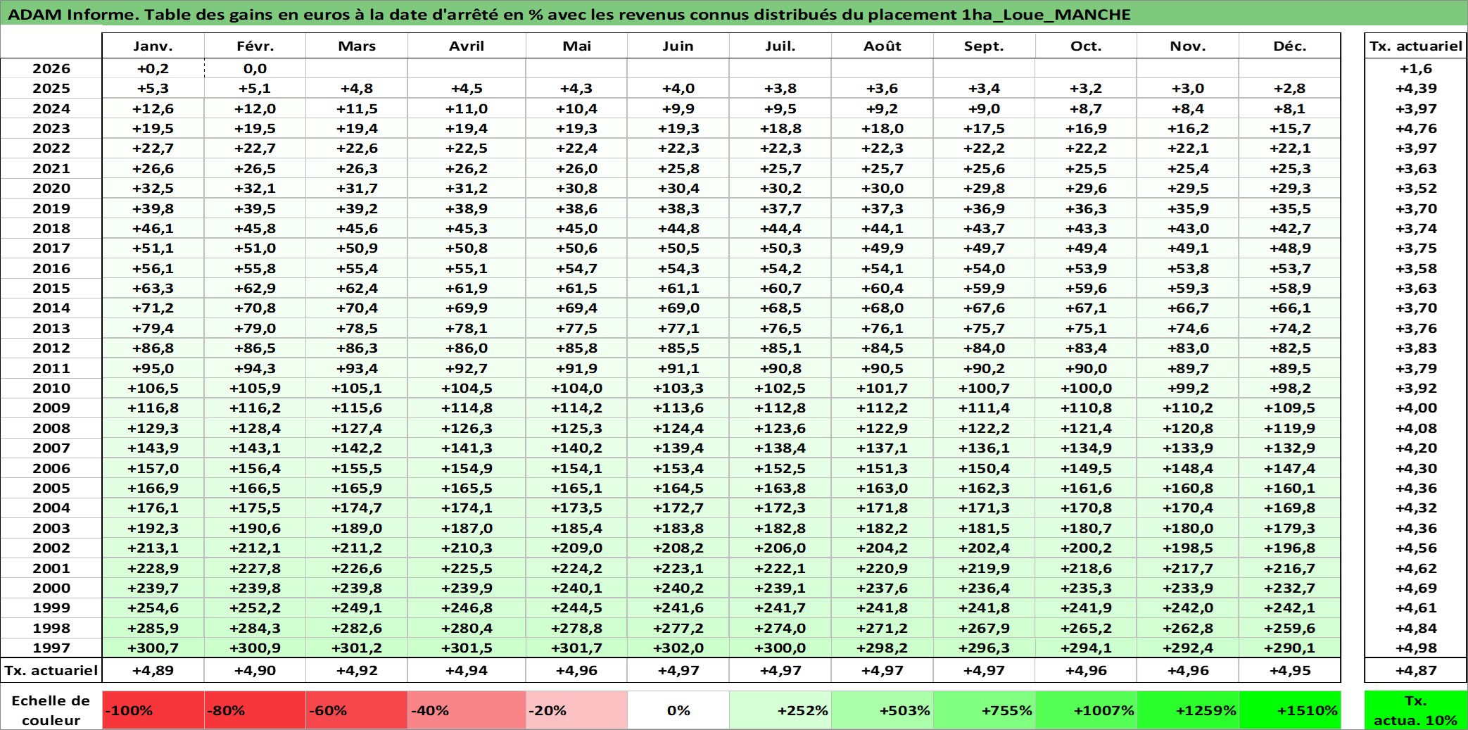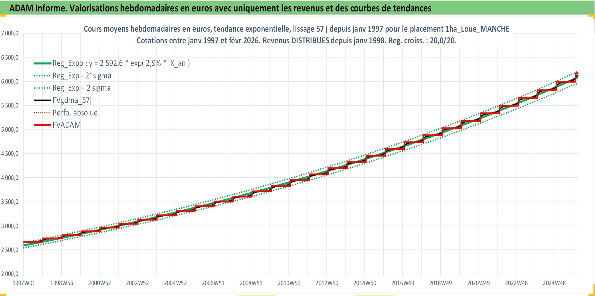 Site dédié aux investisseursPage dédiée sur site financeAnalyse des valorisations hebdomadaires de l'actif 1ha_Loue_MANCHE. Cet actif est cote en EUR. Les valorisations couvrent les semaines 1997W01 a 2026W09. Les fermages de ce bien foncier sont pris egaux a 2,5% annuels de la valeur venale du bien.