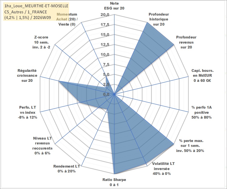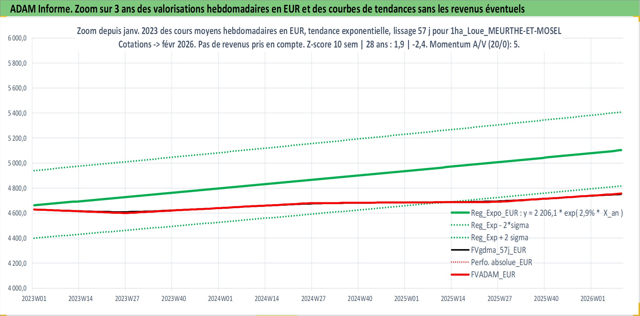 Site dédié aux investisseursPage dédiée sur site financeAnalyse des valorisations hebdomadaires de l'actif 1ha_Loue_MEURTHE-ET-MOSELLE. Cet actif est cote en EUR. Les valorisations couvrent les semaines 1997W01 a 2026W09. Les fermages de ce bien foncier sont pris egaux a 2,5% annuels de la valeur venale du bien.