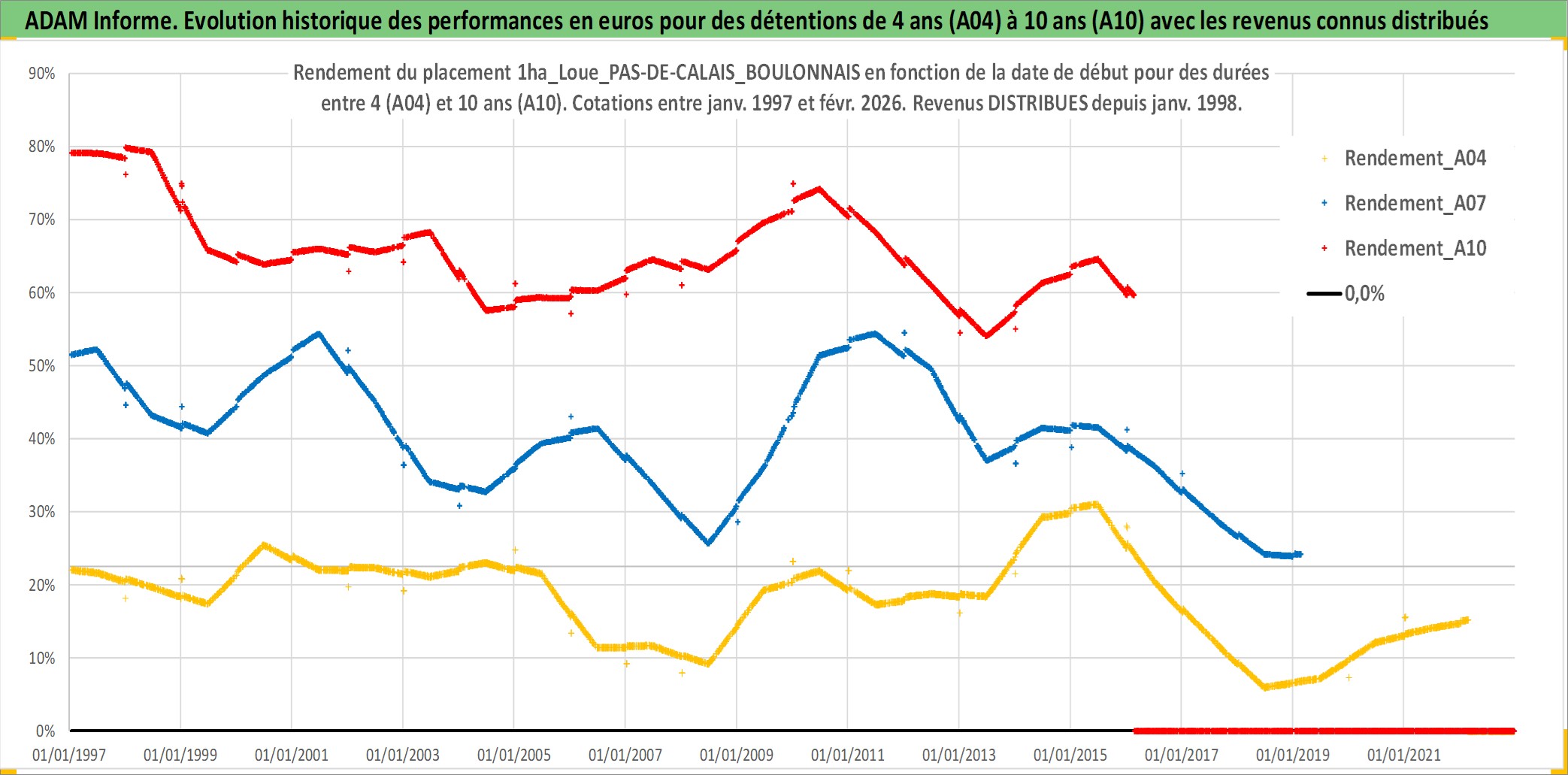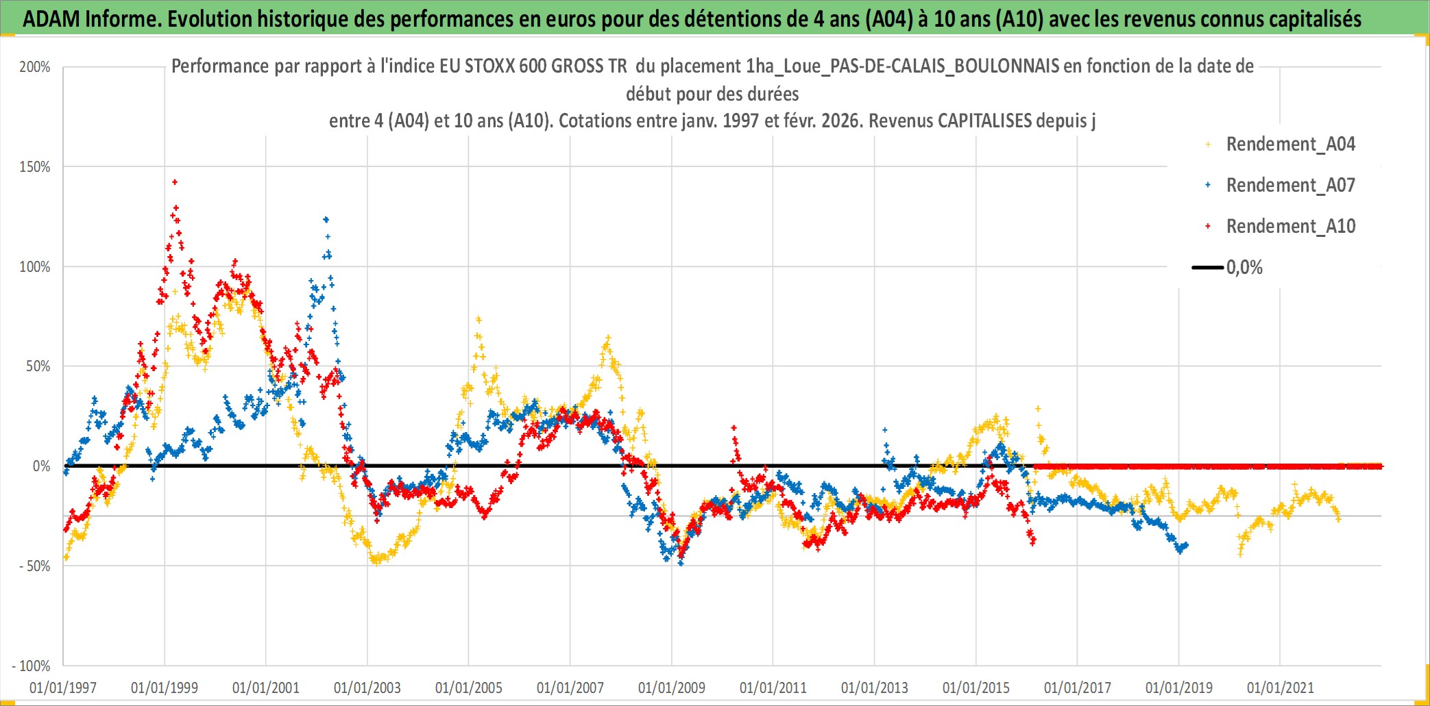 Site dédié aux investisseursPage dédiée sur site financeAnalyse des valorisations hebdomadaires de l'actif 1ha_Loue_PAS-DE-CALAIS_BOULONNAIS. Cet actif est cote en EUR. Les valorisations couvrent les semaines 1997W01 a 2026W09. Les fermages de ce bien foncier sont pris egaux a 2,5% annuels de la valeur venale du bien.
