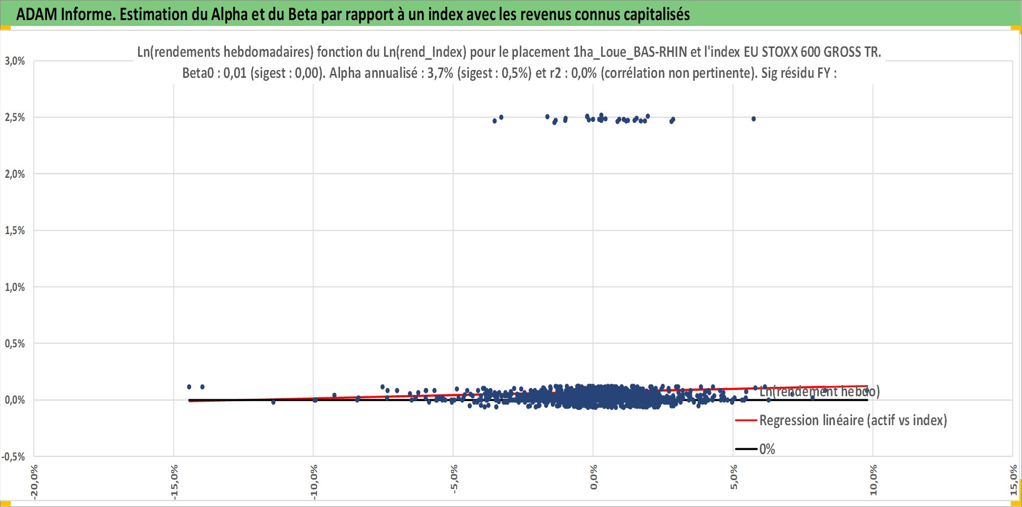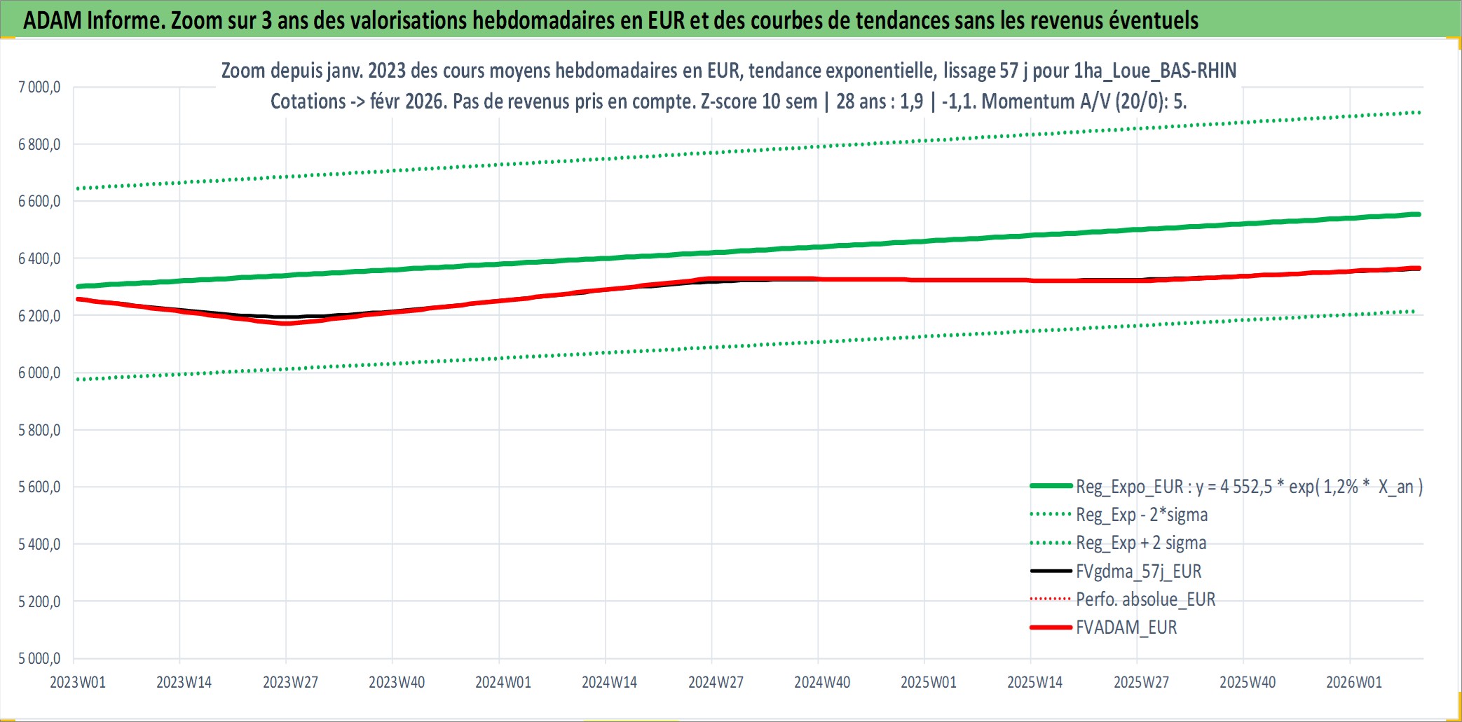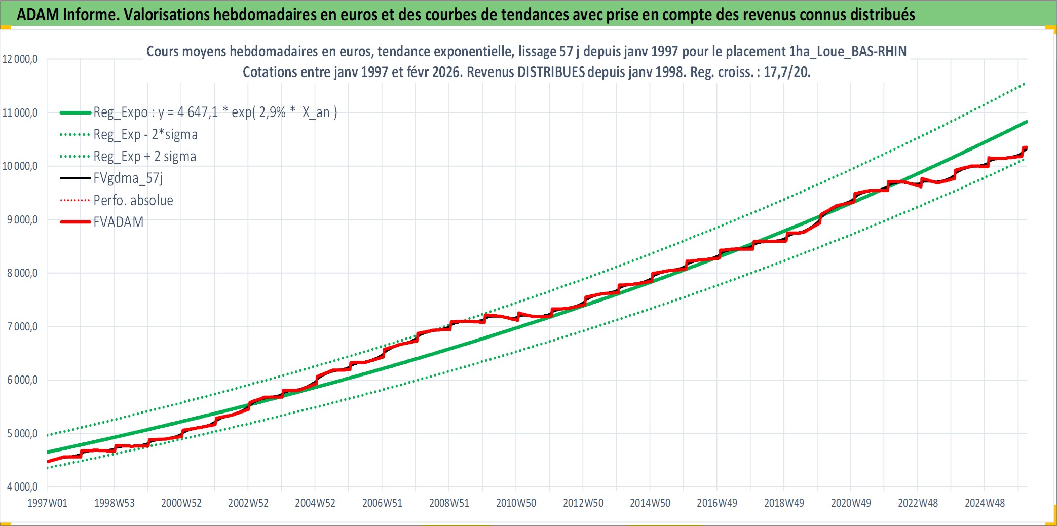 Site dédié aux investisseursPage dédiée sur site financeAnalyse des valorisations hebdomadaires de l'actif 1ha_Loue_BAS-RHIN. Cet actif est cote en EUR. Les valorisations couvrent les semaines 1997W01 a 2026W09. Les fermages de ce bien foncier sont pris egaux a 2,5% annuels de la valeur venale du bien.