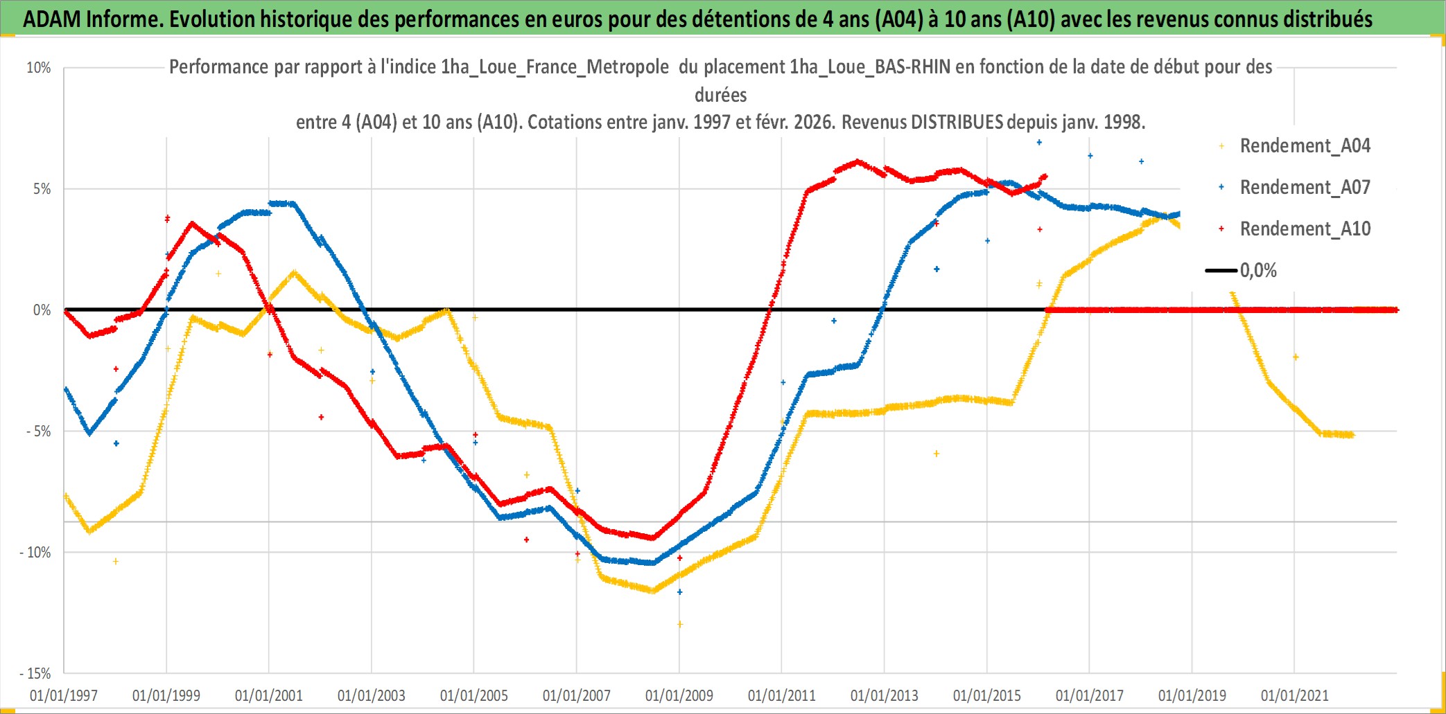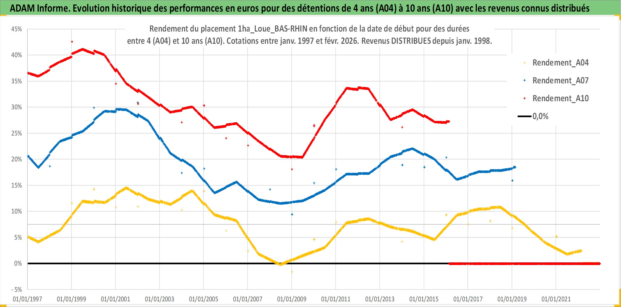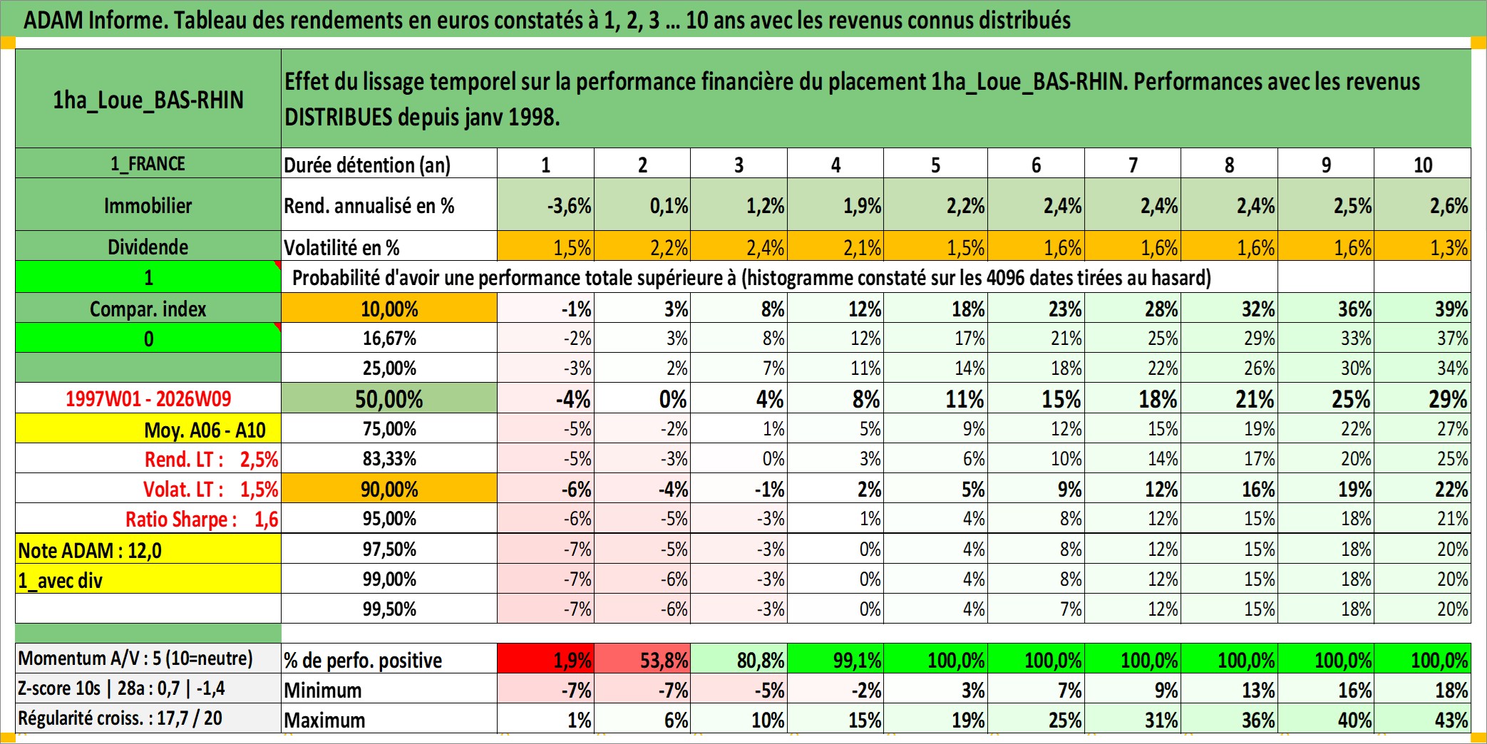 Site dédié aux investisseursPage dédiée sur site financeAnalyse des valorisations hebdomadaires de l'actif 1ha_Loue_BAS-RHIN. Cet actif est cote en EUR. Les valorisations couvrent les semaines 1997W01 a 2026W09. Les fermages de ce bien foncier sont pris egaux a 2,5% annuels de la valeur venale du bien.
