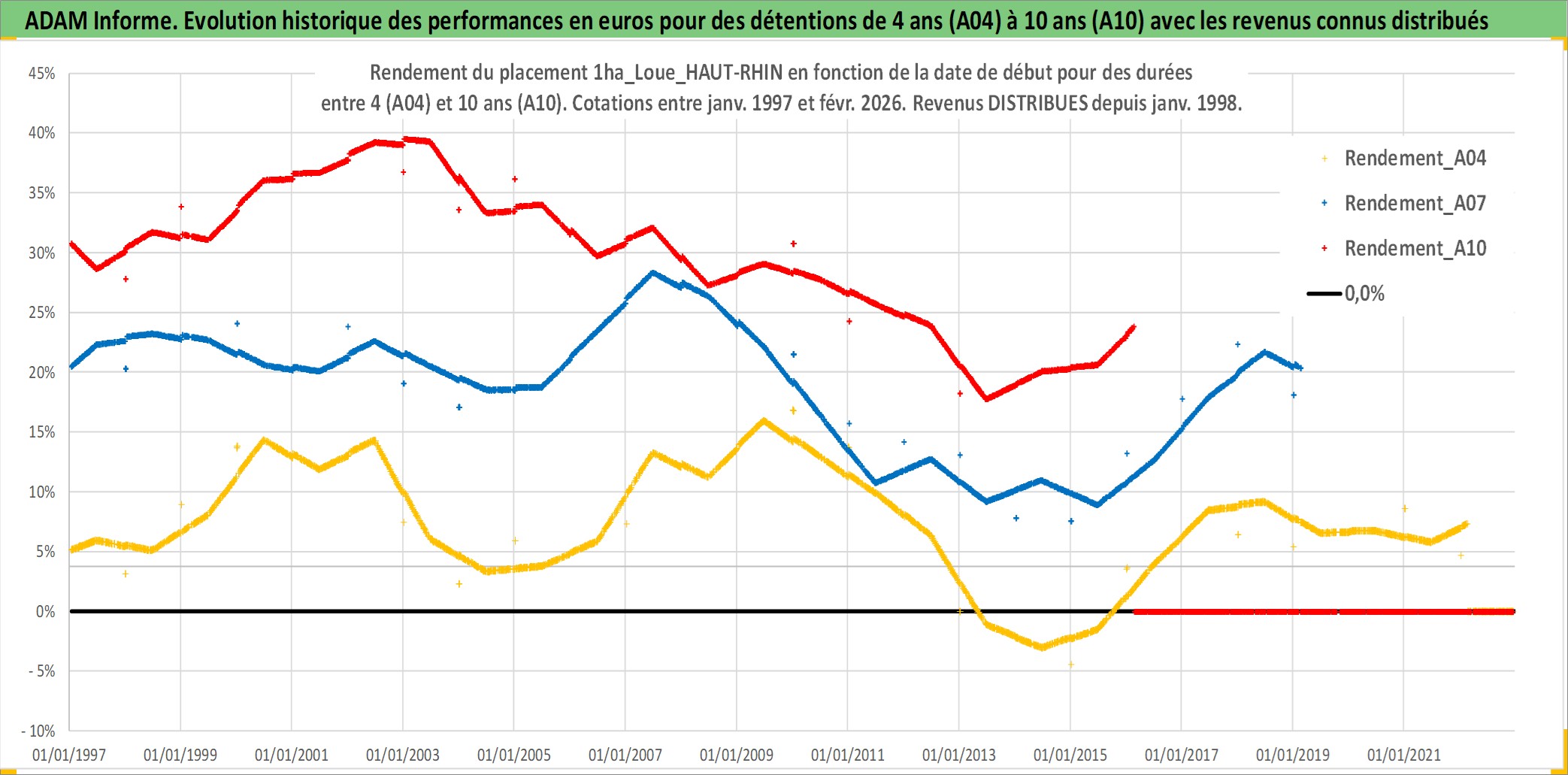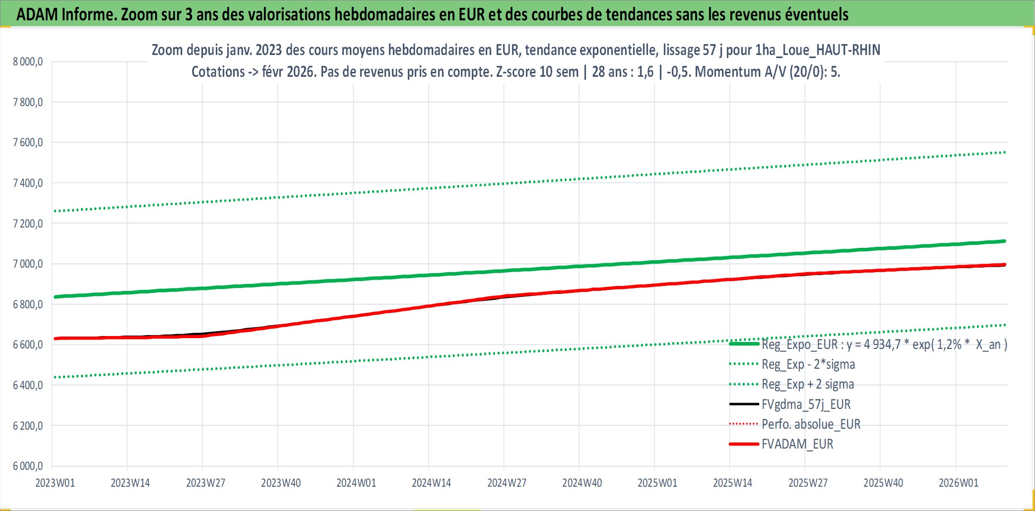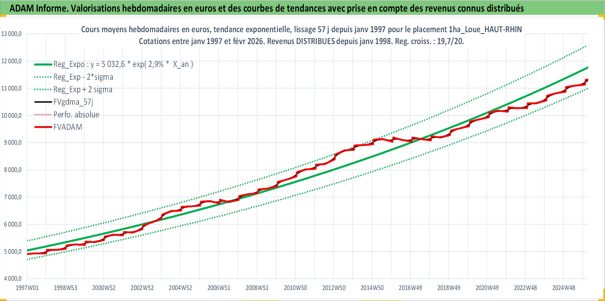 Site dédié aux investisseursPage dédiée sur site financeAnalyse des valorisations hebdomadaires de l'actif 1ha_Loue_HAUT-RHIN. Cet actif est cote en EUR. Les valorisations couvrent les semaines 1997W01 a 2026W09. Les fermages de ce bien foncier sont pris egaux a 2,5% annuels de la valeur venale du bien.