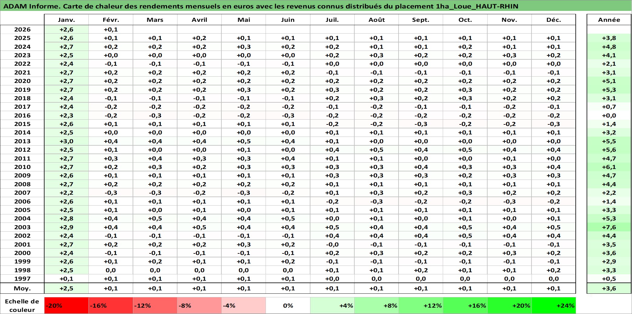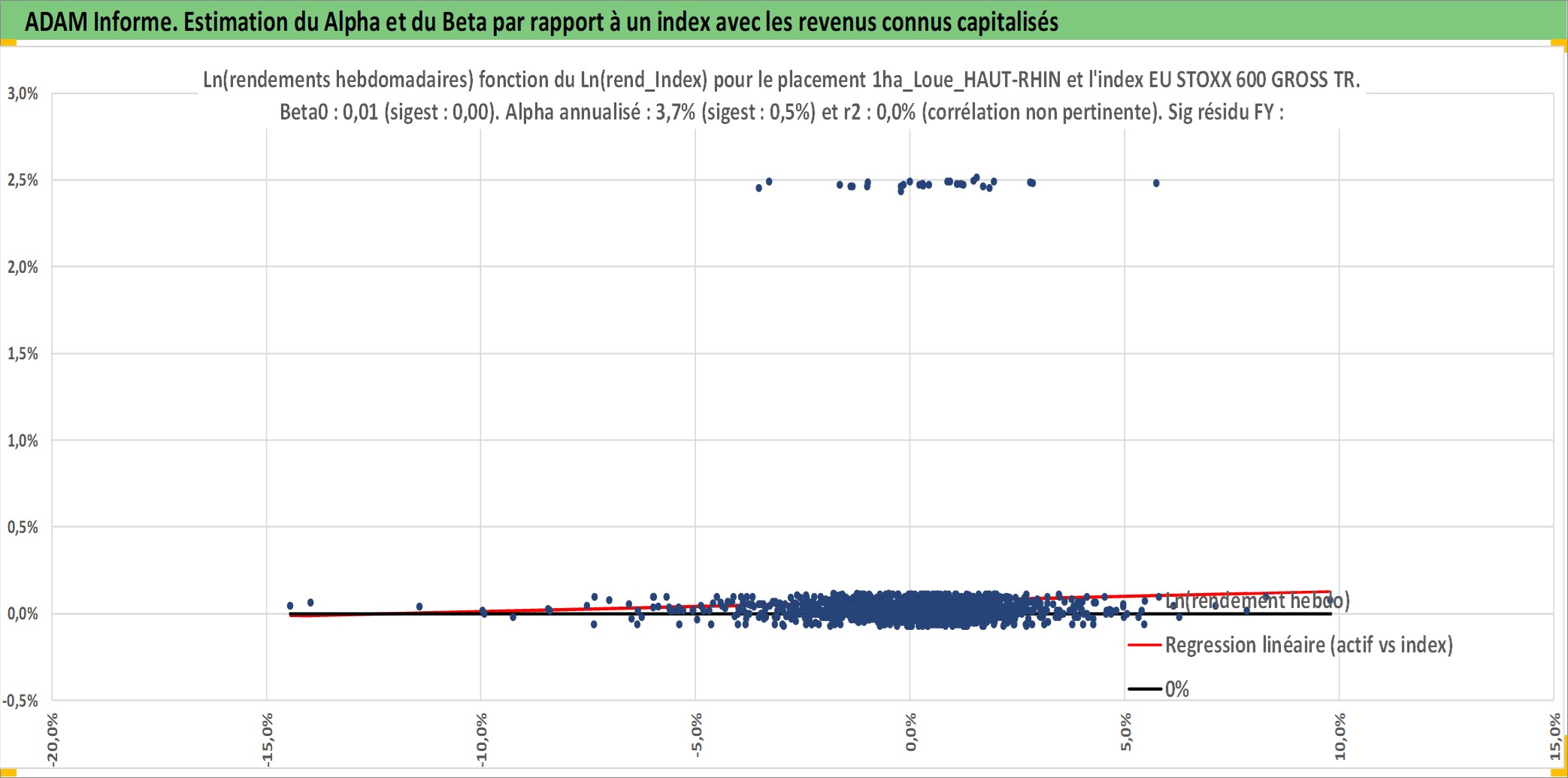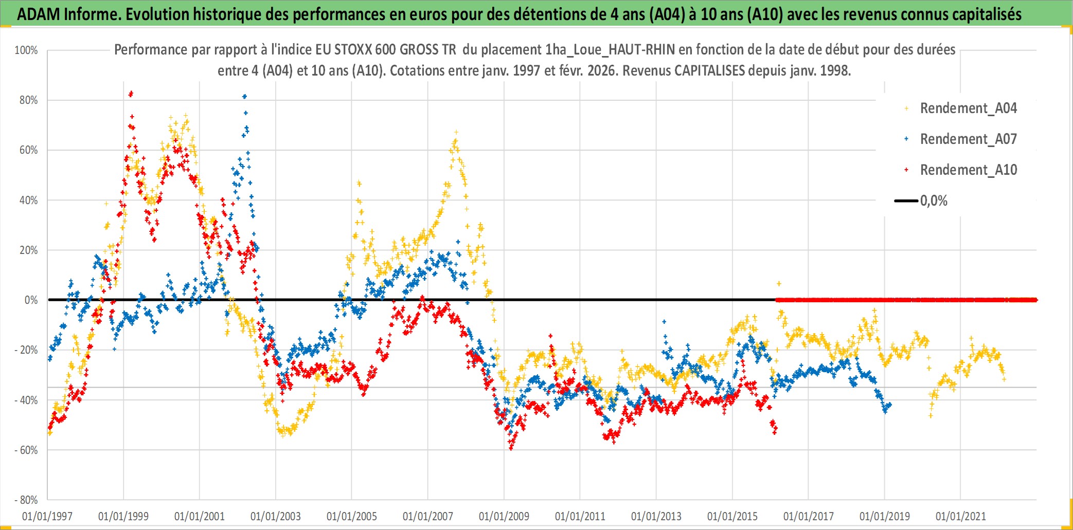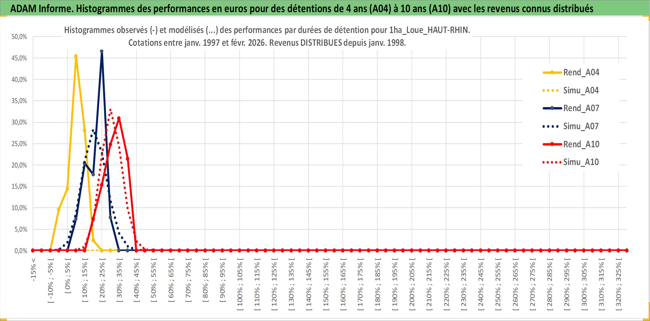 Site dédié aux investisseursPage dédiée sur site financeAnalyse des valorisations hebdomadaires de l'actif 1ha_Loue_HAUT-RHIN. Cet actif est cote en EUR. Les valorisations couvrent les semaines 1997W01 a 2026W09. Les fermages de ce bien foncier sont pris egaux a 2,5% annuels de la valeur venale du bien.