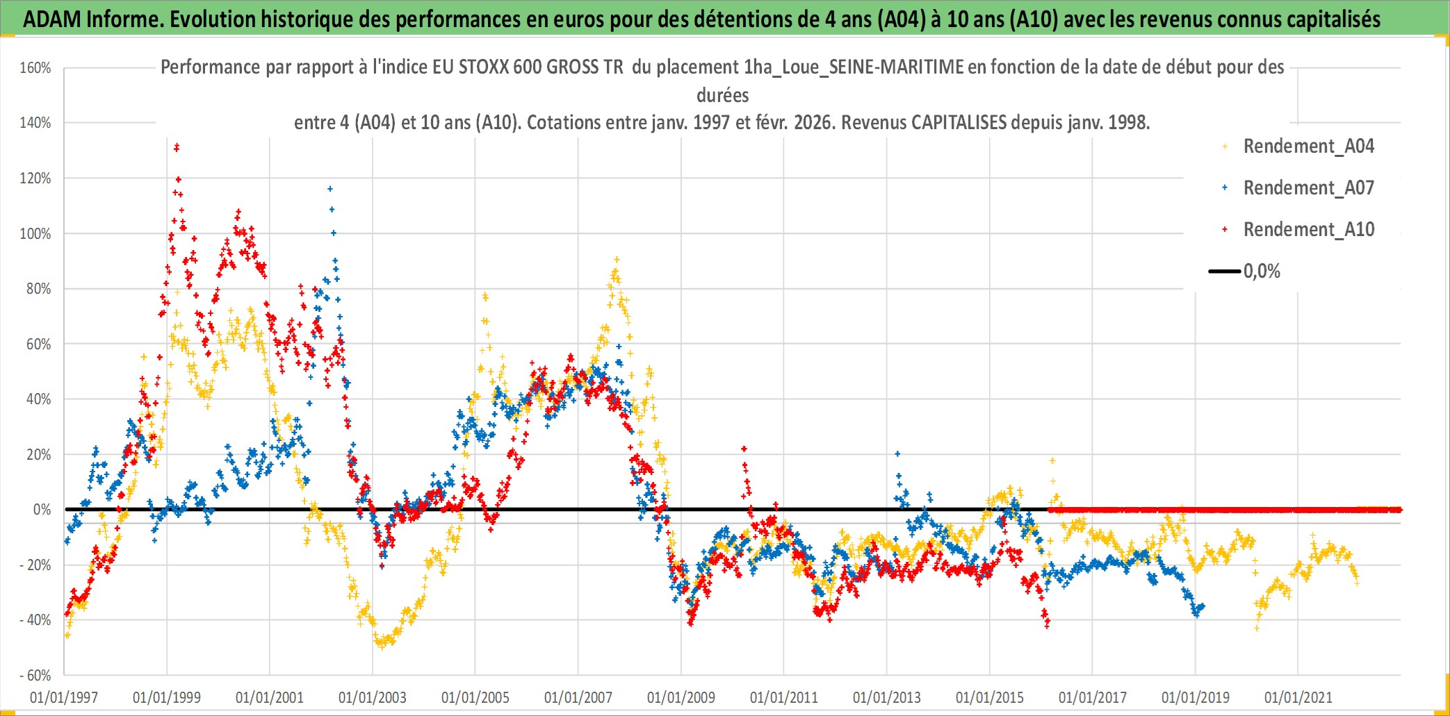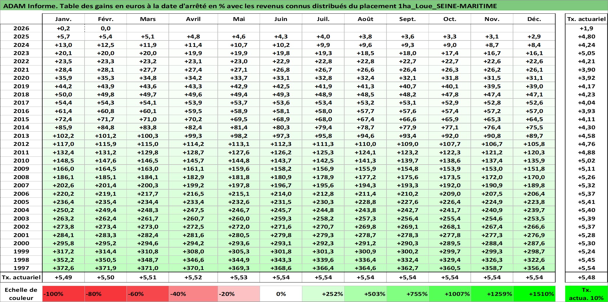 Site dédié aux investisseursPage dédiée sur site financeAnalyse des valorisations hebdomadaires de l'actif 1ha_Loue_SEINE-MARITIME. Cet actif est cote en EUR. Les valorisations couvrent les semaines 1997W01 a 2026W09. Les fermages de ce bien foncier sont pris egaux a 2,5% annuels de la valeur venale du bien.