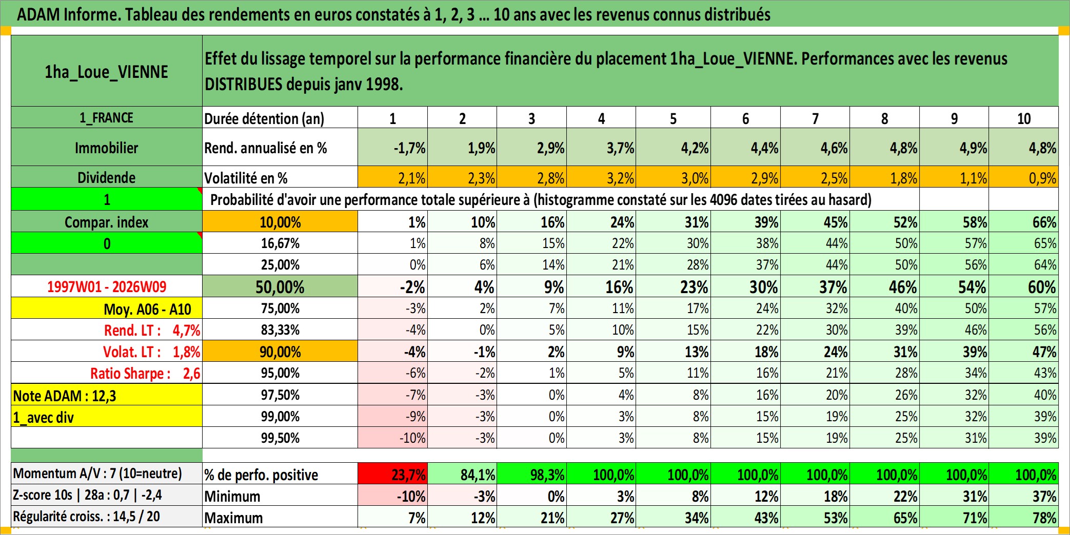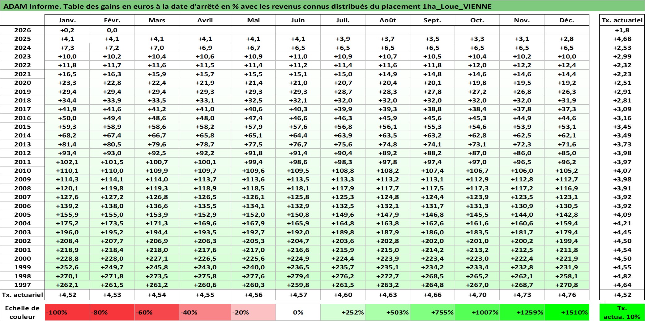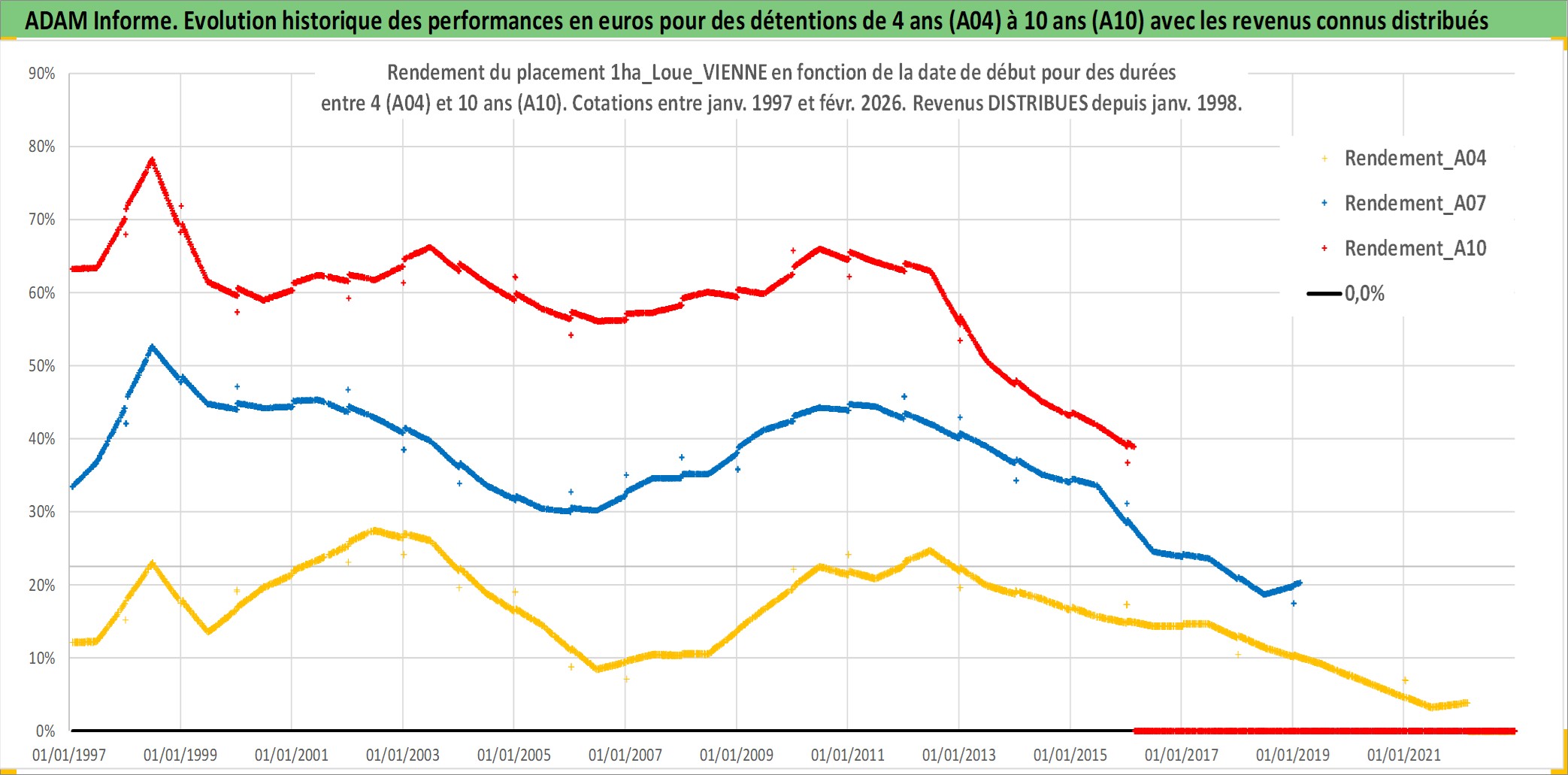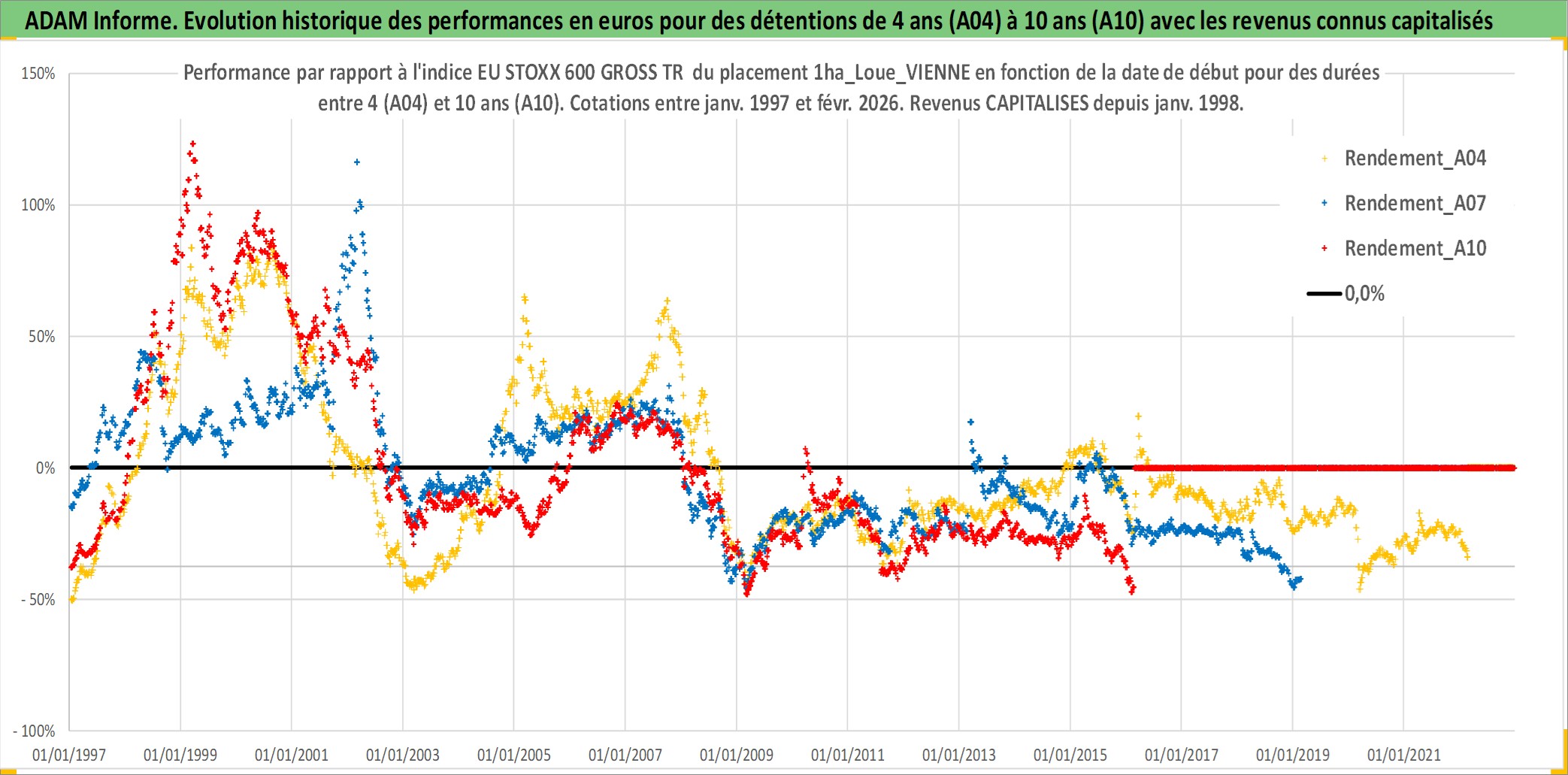 Site dédié aux investisseursPage dédiée sur site financeAnalyse des valorisations hebdomadaires de l'actif 1ha_Loue_VIENNE. Cet actif est cote en EUR. Les valorisations couvrent les semaines 1997W01 a 2026W09. Les fermages de ce bien foncier sont pris egaux a 2,5% annuels de la valeur venale du bien.