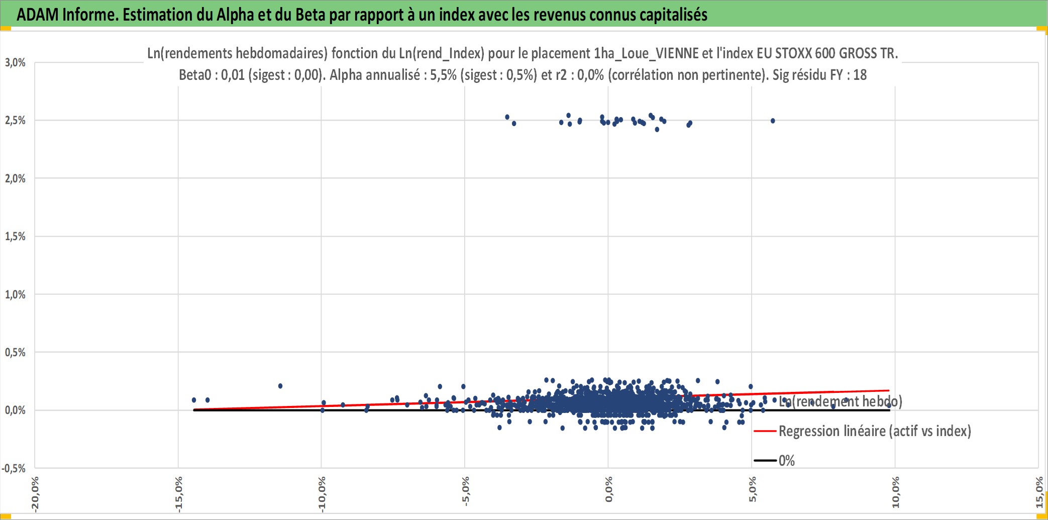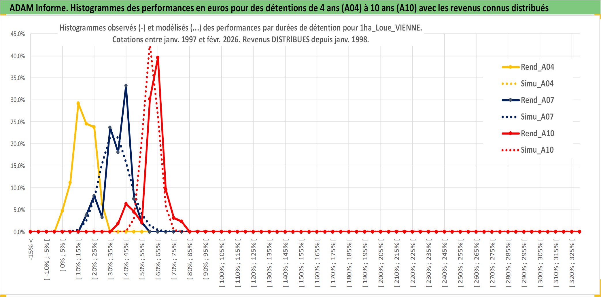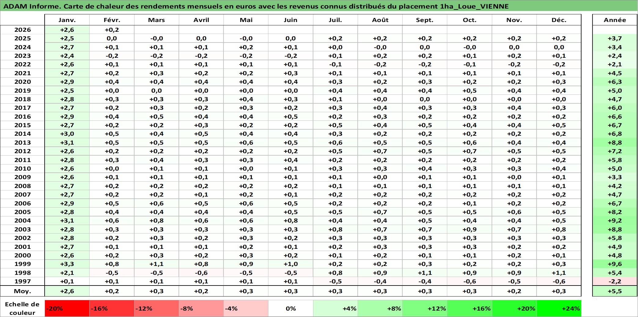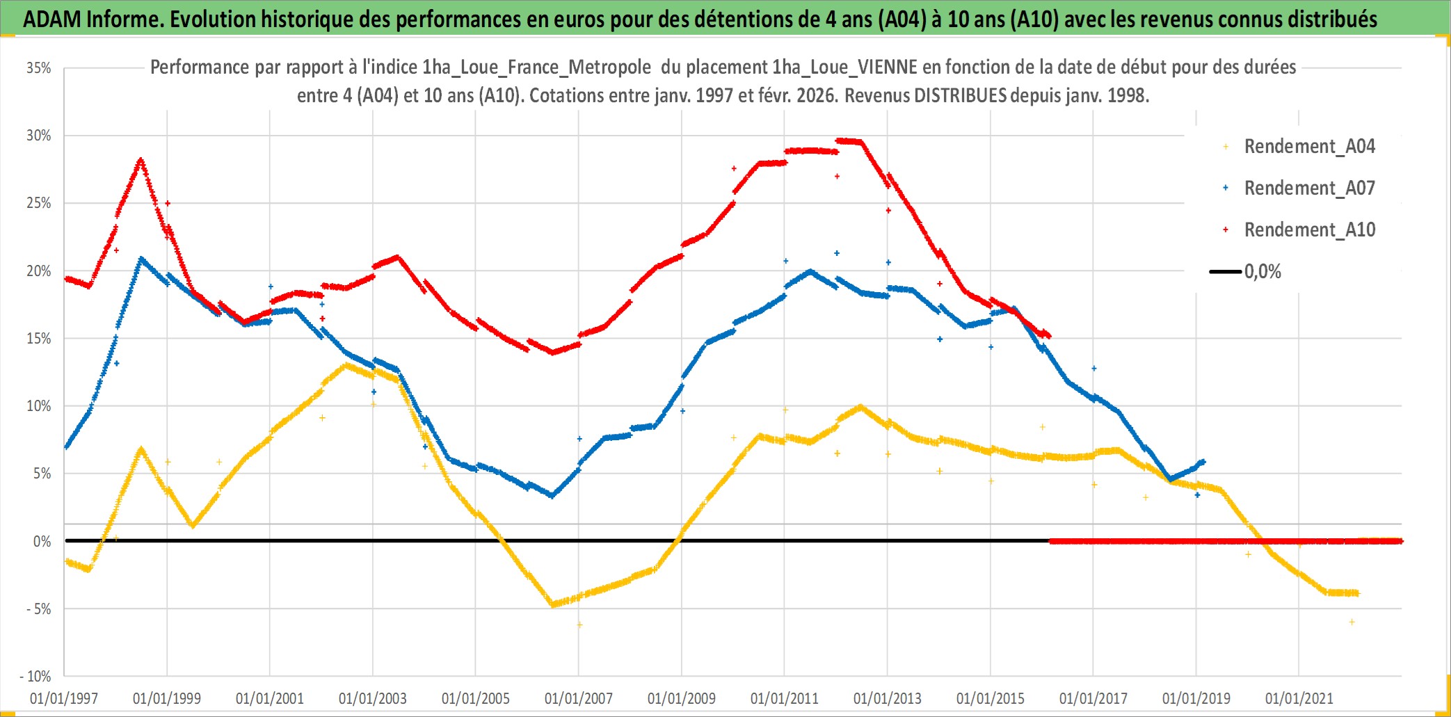 Site dédié aux investisseursPage dédiée sur site financeAnalyse des valorisations hebdomadaires de l'actif 1ha_Loue_VIENNE. Cet actif est cote en EUR. Les valorisations couvrent les semaines 1997W01 a 2026W09. Les fermages de ce bien foncier sont pris egaux a 2,5% annuels de la valeur venale du bien.