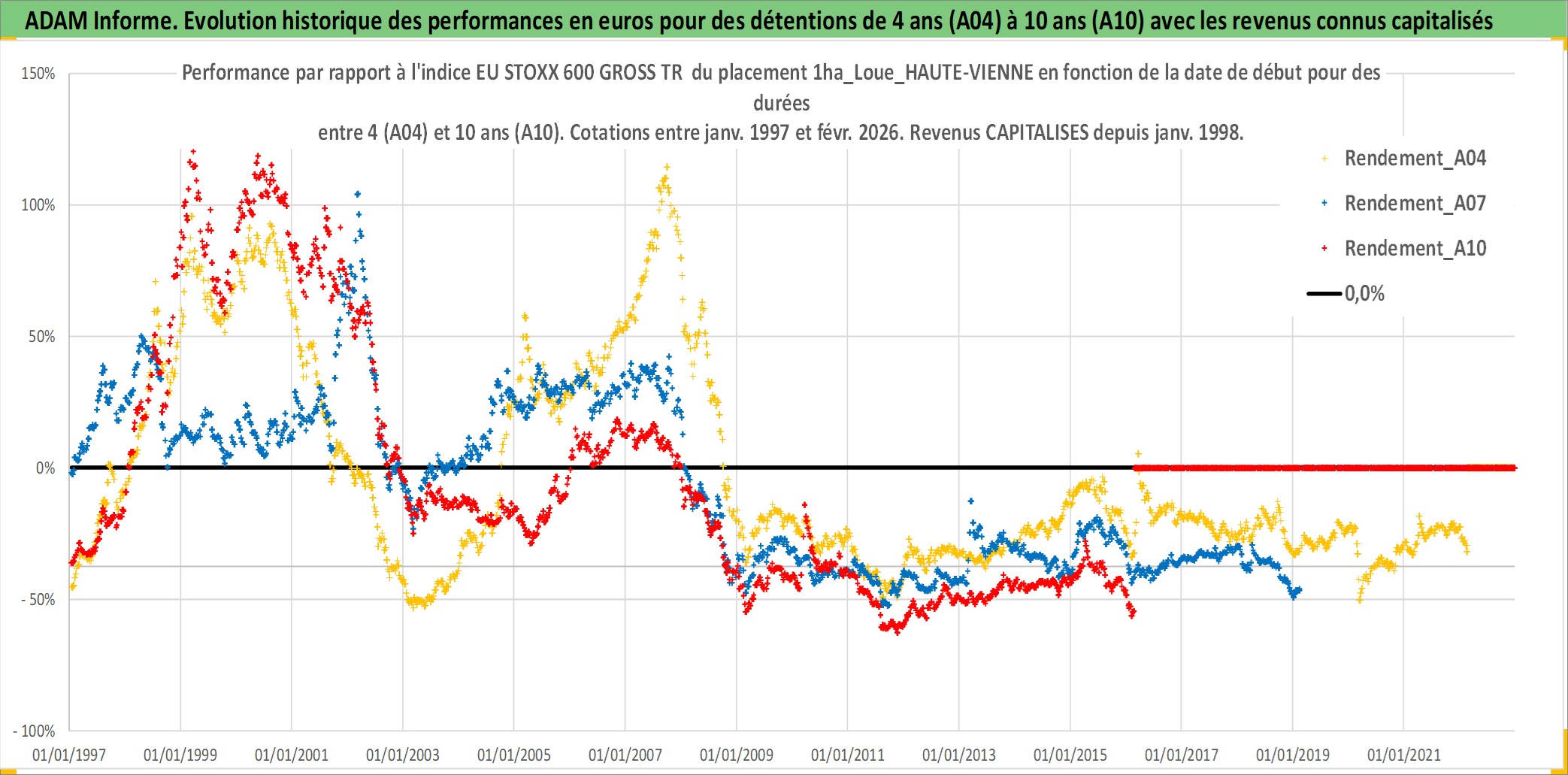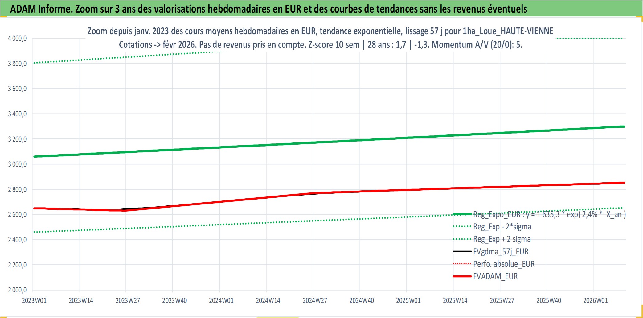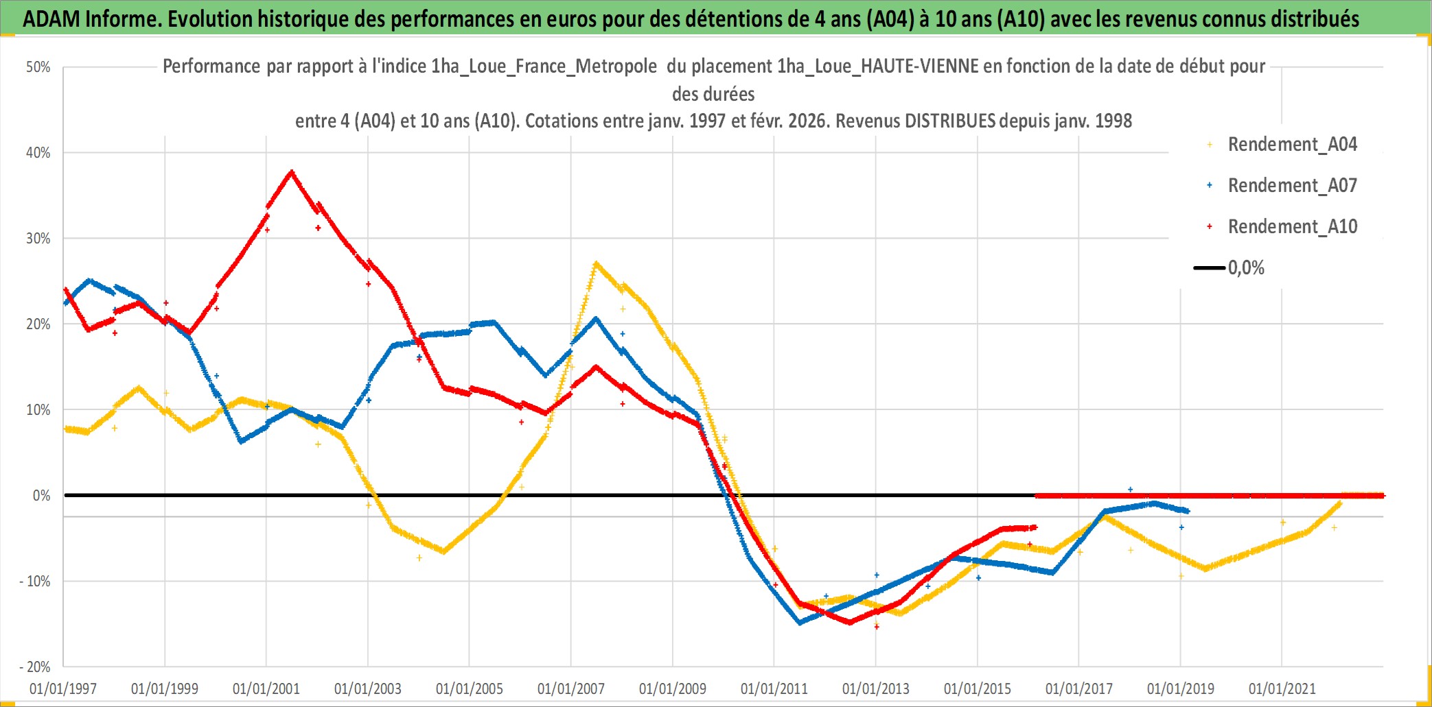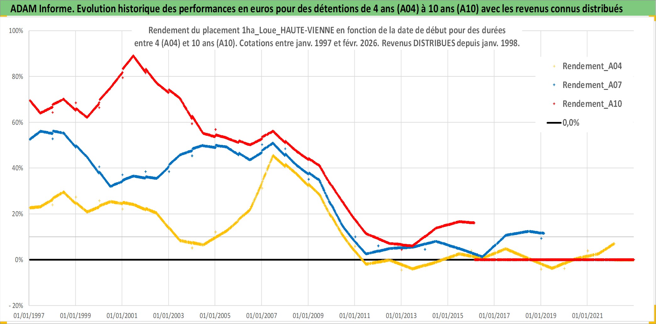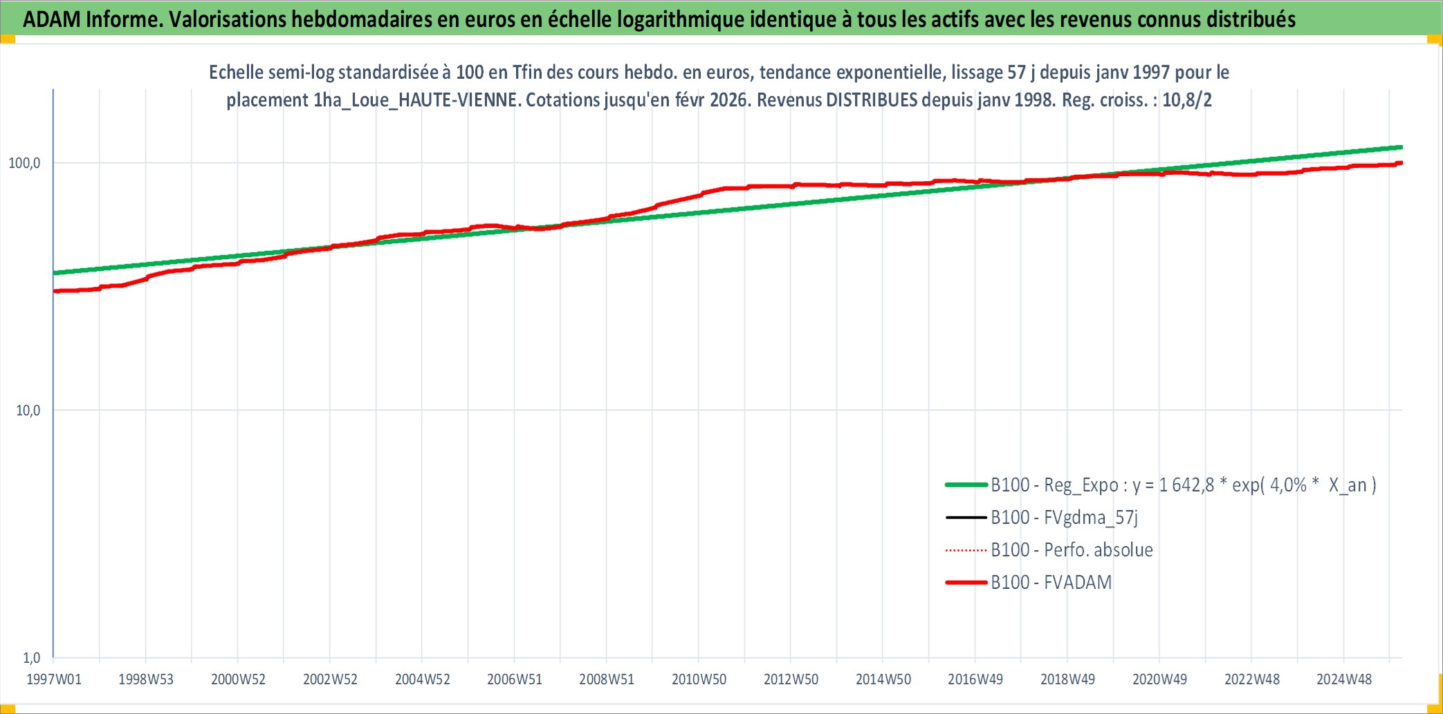 Site dédié aux investisseursPage dédiée sur site financeAnalyse des valorisations hebdomadaires de l'actif 1ha_Loue_HAUTE-VIENNE. Cet actif est cote en EUR. Les valorisations couvrent les semaines 1997W01 a 2026W09. Les fermages de ce bien foncier sont pris egaux a 2,5% annuels de la valeur venale du bien.