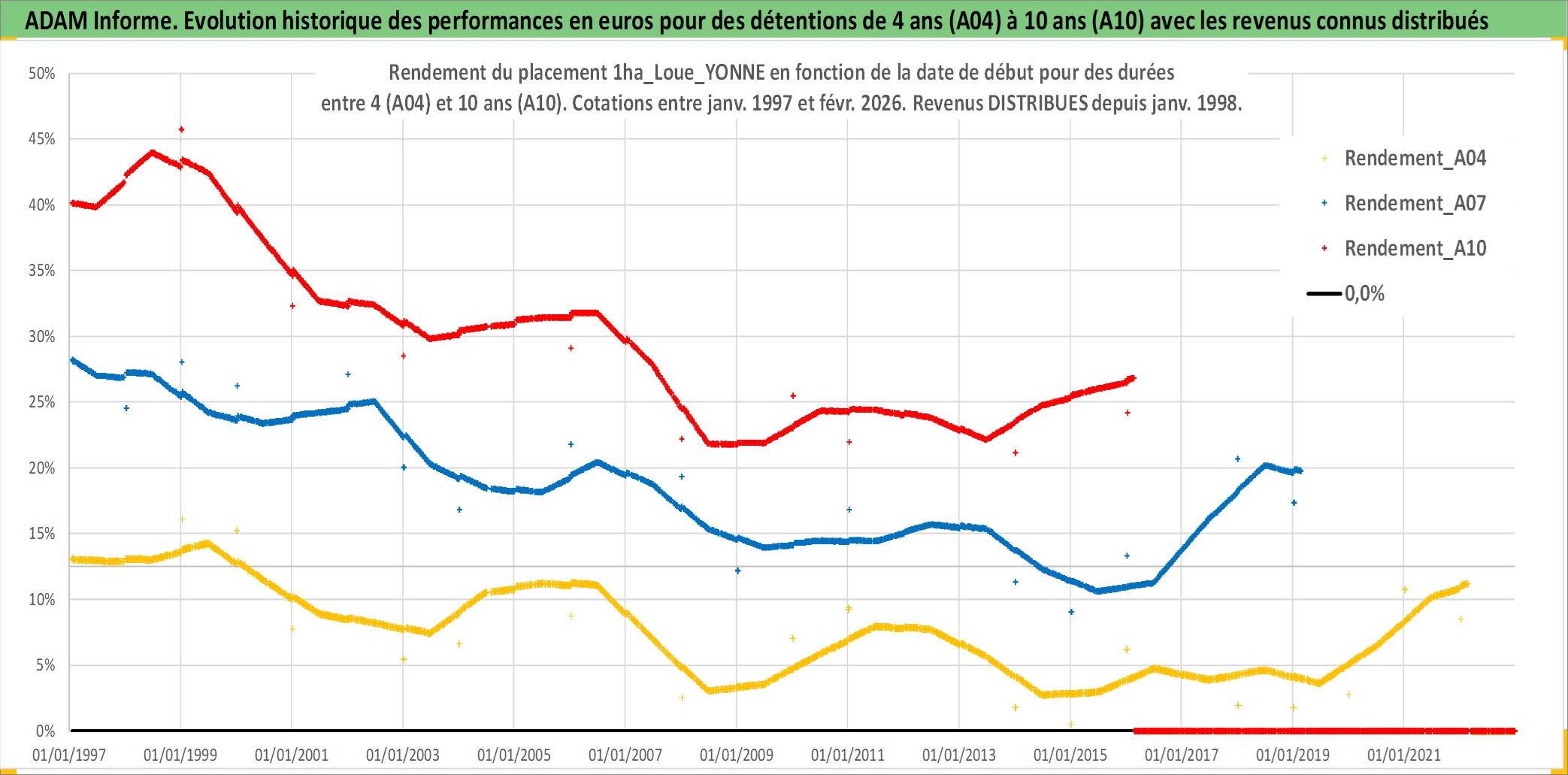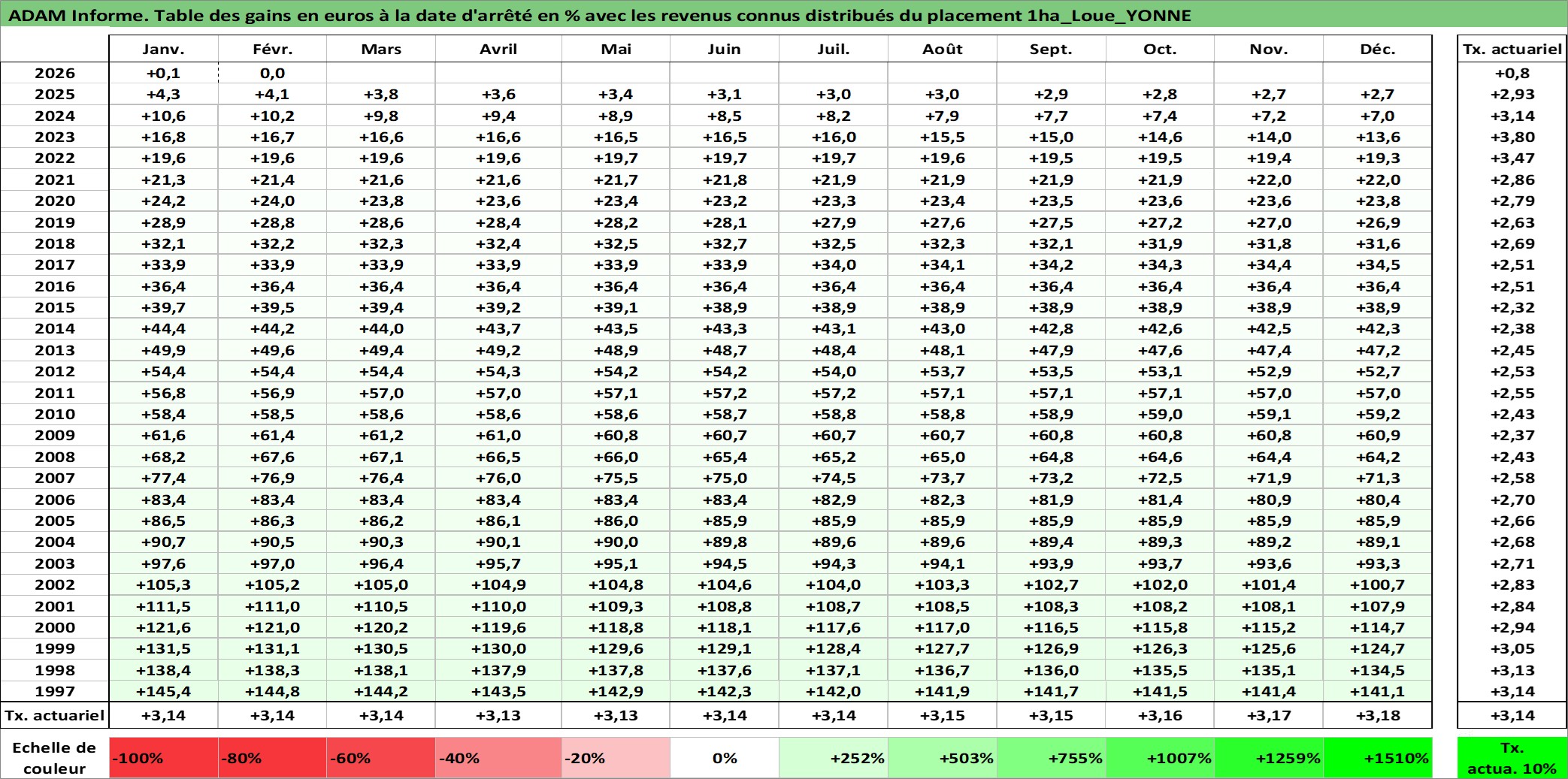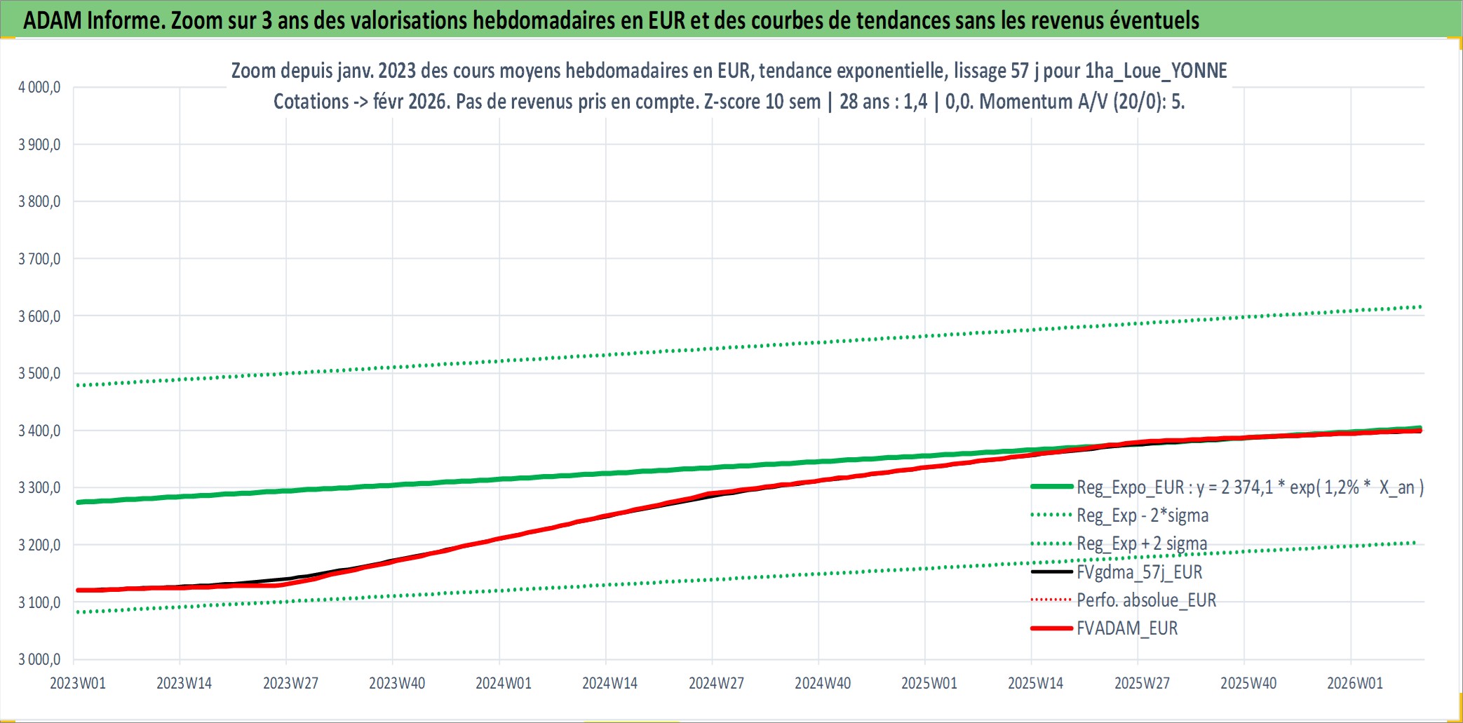 Site dédié aux investisseursPage dédiée sur site financeAnalyse des valorisations hebdomadaires de l'actif 1ha_Loue_YONNE. Cet actif est cote en EUR. Les valorisations couvrent les semaines 1997W01 a 2026W09. Les fermages de ce bien foncier sont pris egaux a 2,5% annuels de la valeur venale du bien.