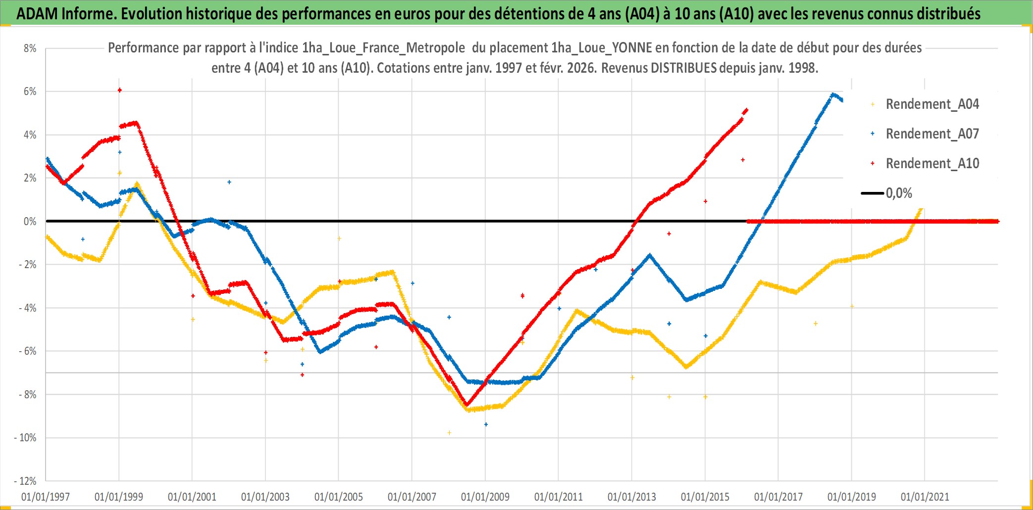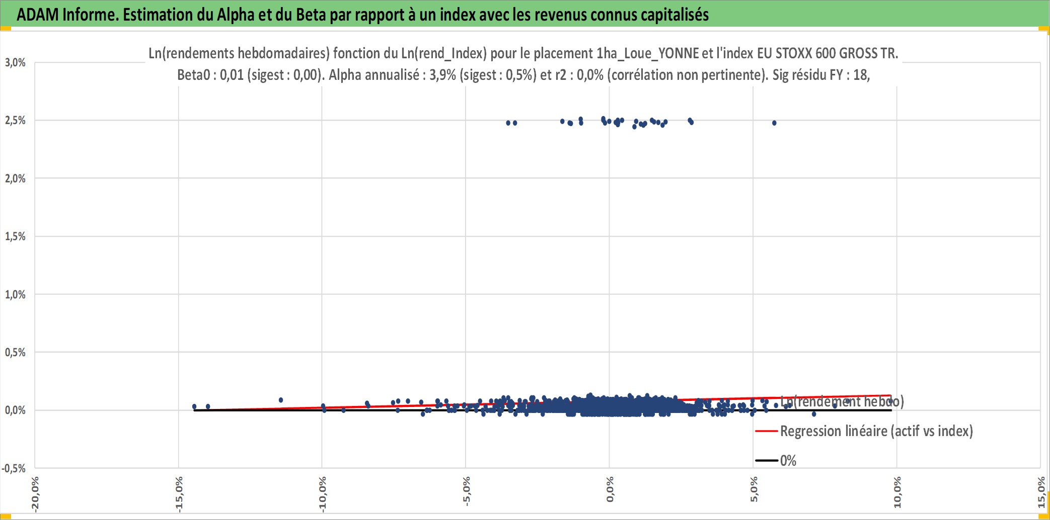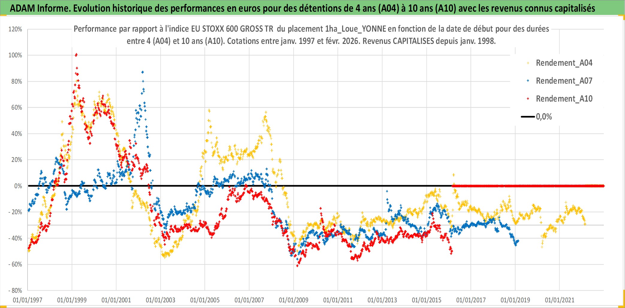 Site dédié aux investisseursPage dédiée sur site financeAnalyse des valorisations hebdomadaires de l'actif 1ha_Loue_YONNE. Cet actif est cote en EUR. Les valorisations couvrent les semaines 1997W01 a 2026W09. Les fermages de ce bien foncier sont pris egaux a 2,5% annuels de la valeur venale du bien.