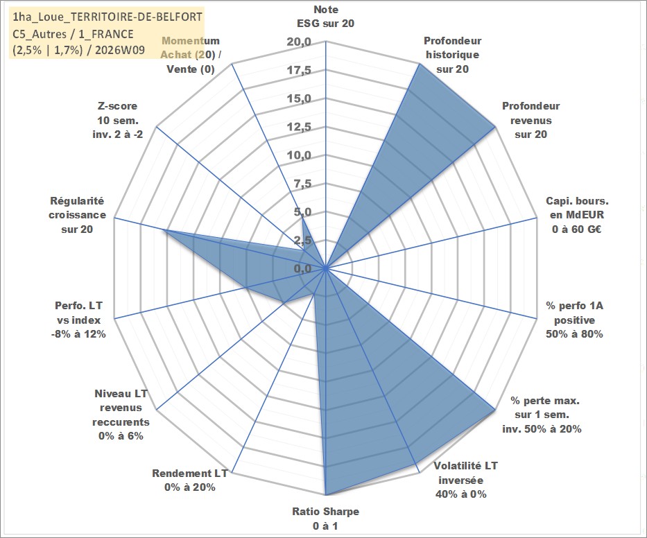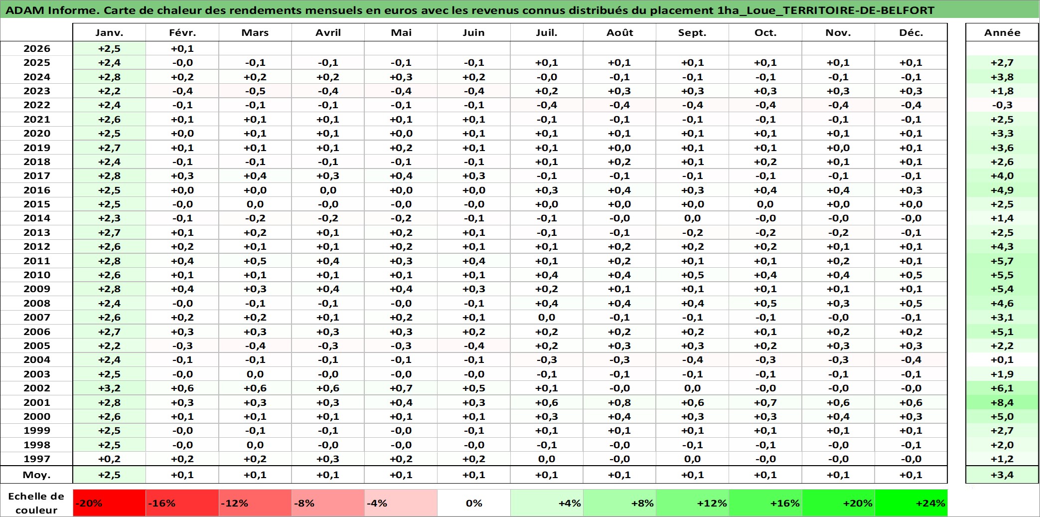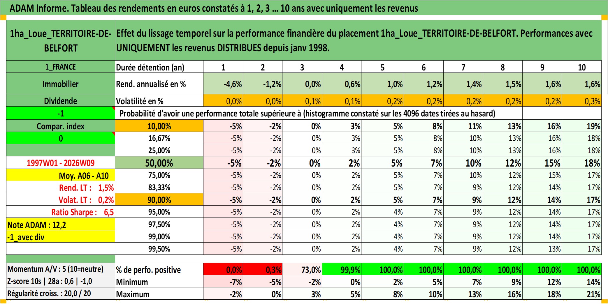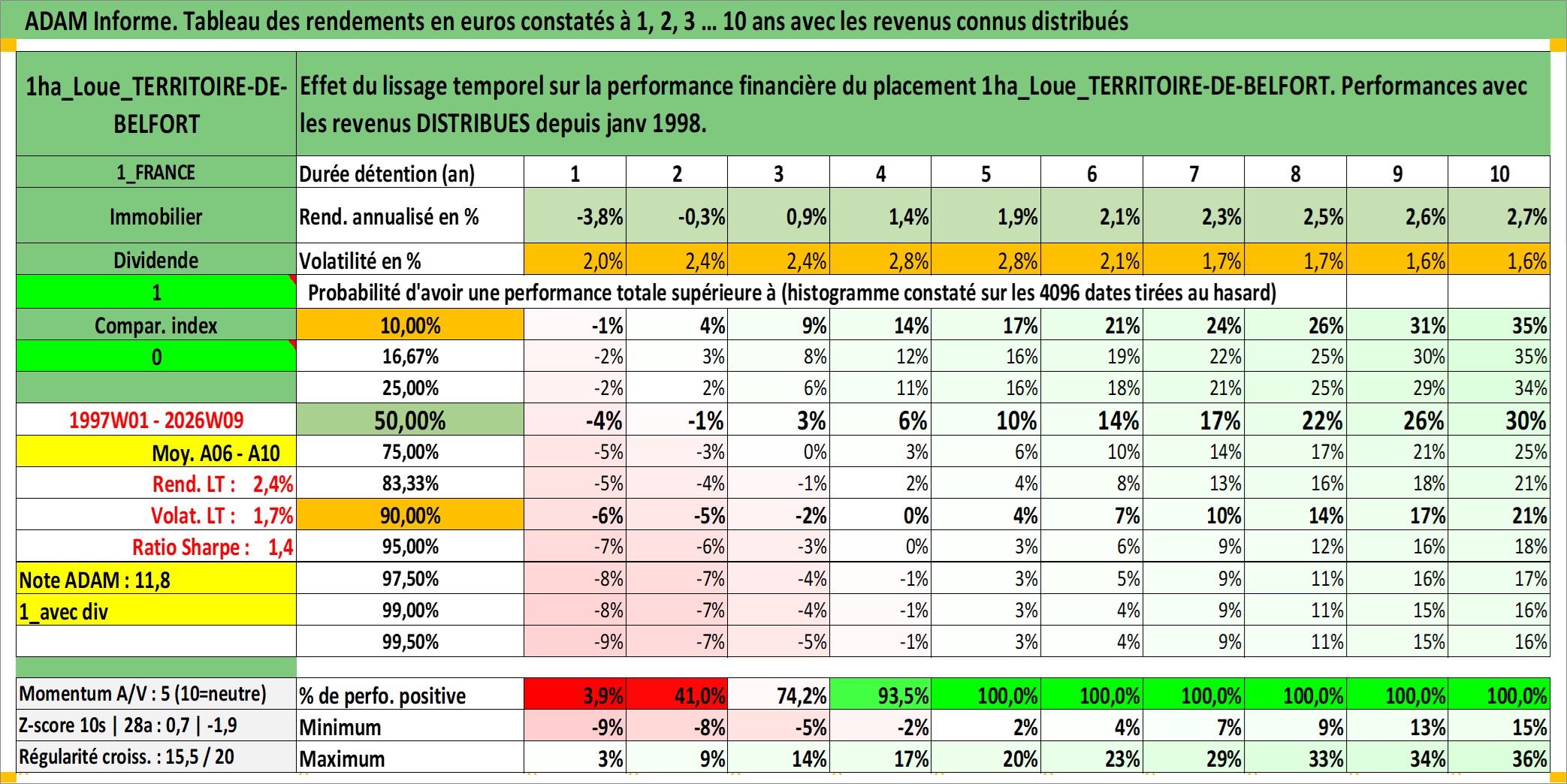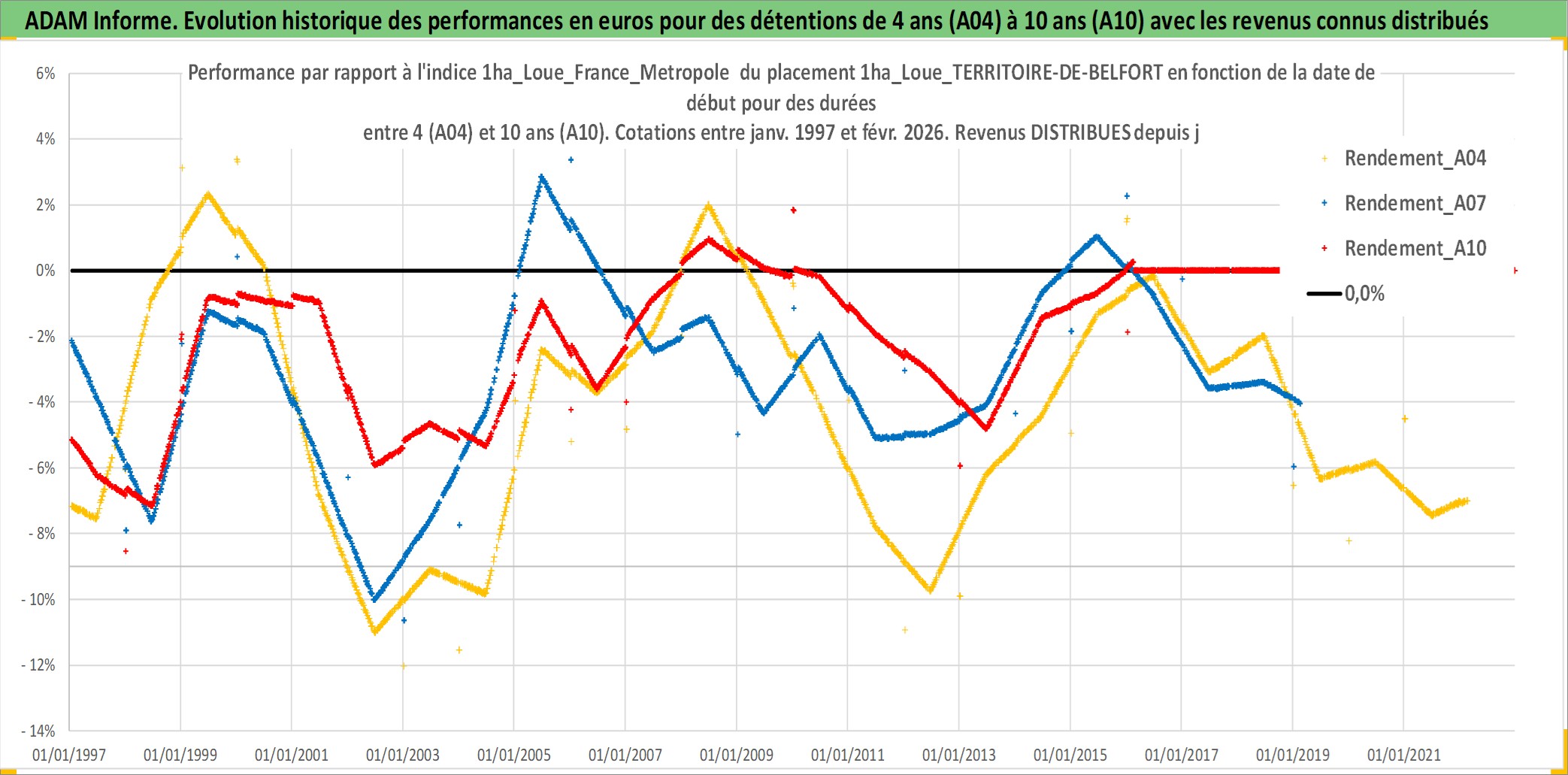 Site dédié aux investisseursPage dédiée sur site financeAnalyse des valorisations hebdomadaires de l'actif 1ha_Loue_TERRITOIRE-DE-BELFORT. Cet actif est cote en EUR. Les valorisations couvrent les semaines 1997W01 a 2026W09. Les fermages de ce bien foncier sont pris egaux a 2,5% annuels de la valeur venale du bien.