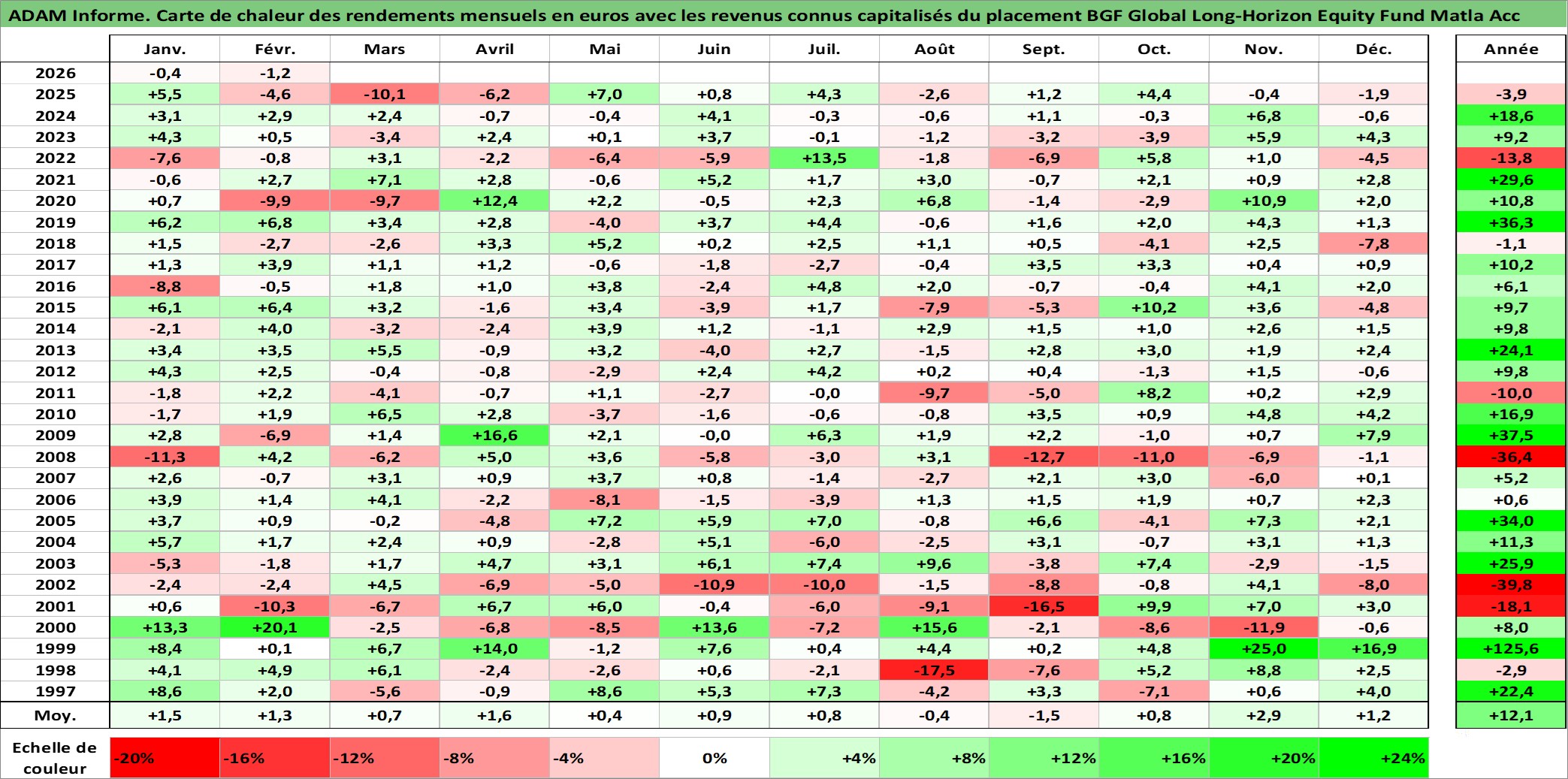Site dédié aux investisseursPage dédiée sur site financeAnalyse des valorisations hebdomadaires du fonds BGF Global Long-Horizon Equity Fund Matla Acc. Cet actif est cote en USD. Les valorisations sont en contrevaleur EURO et couvrent les semaines 1997W01 a 2026W09. Les revenus de cet actif financier sont pris en compte depuis la semaine 1997W01. La note globale ESG de cet actif est estimee a 7.3 (apres rebasage entre 0 et 20).