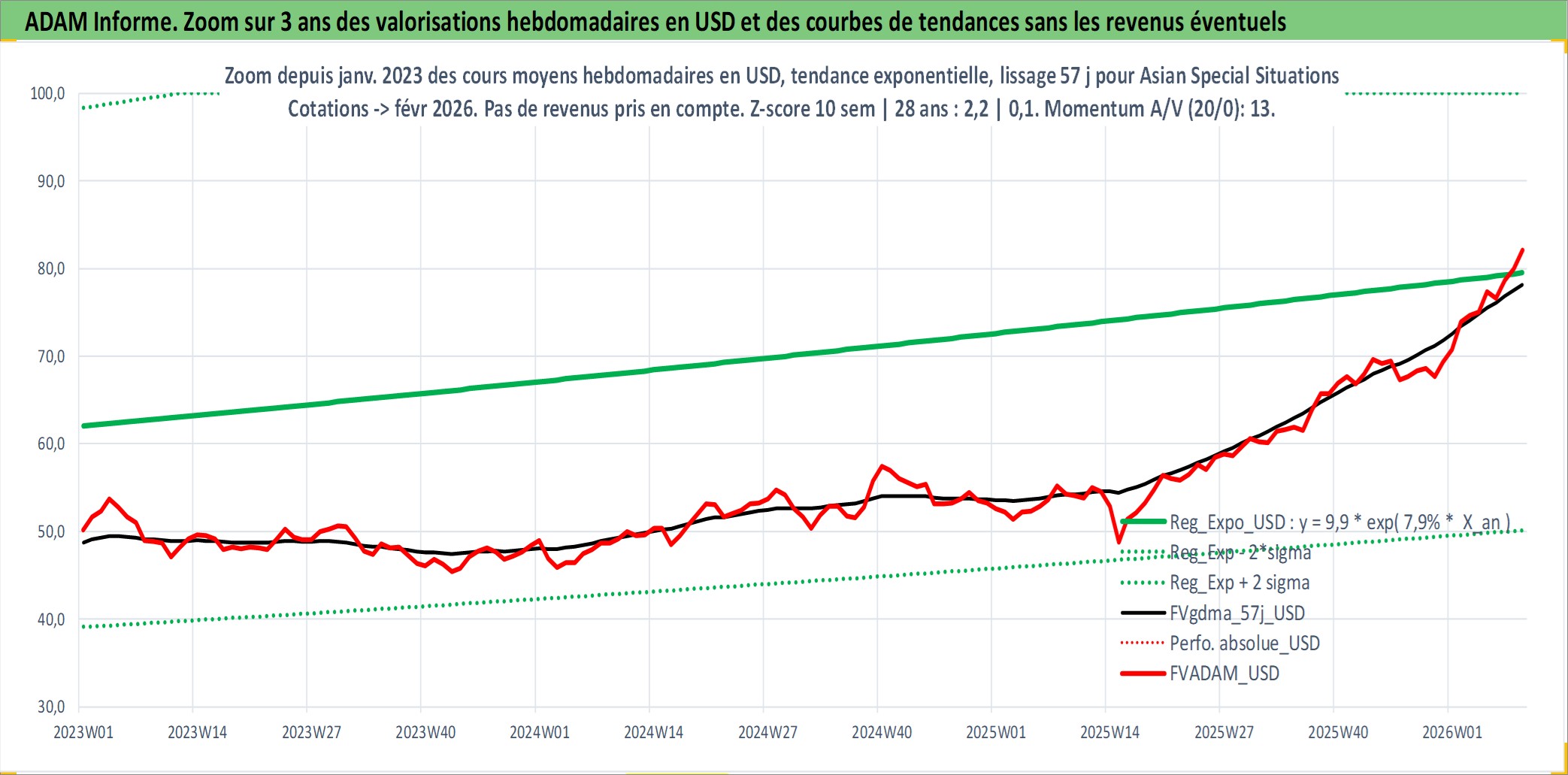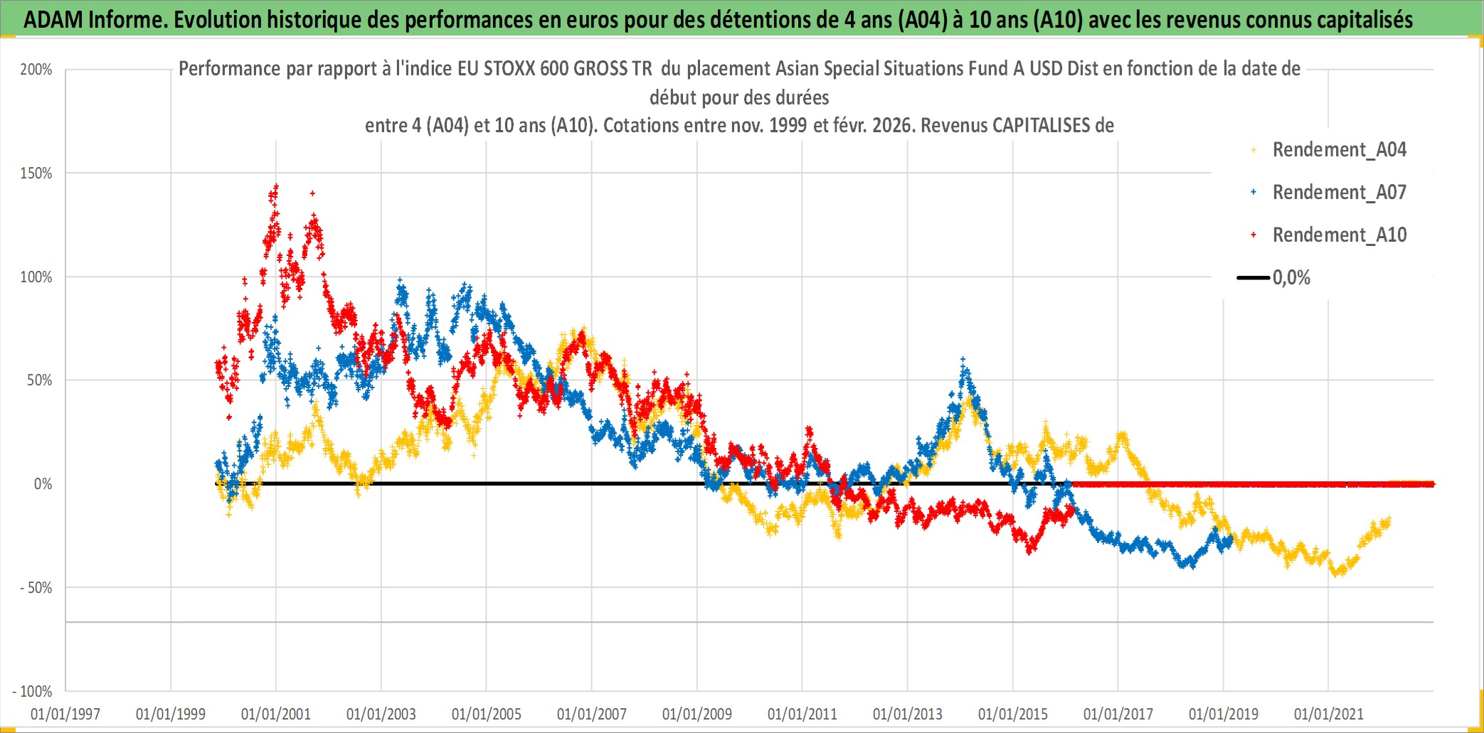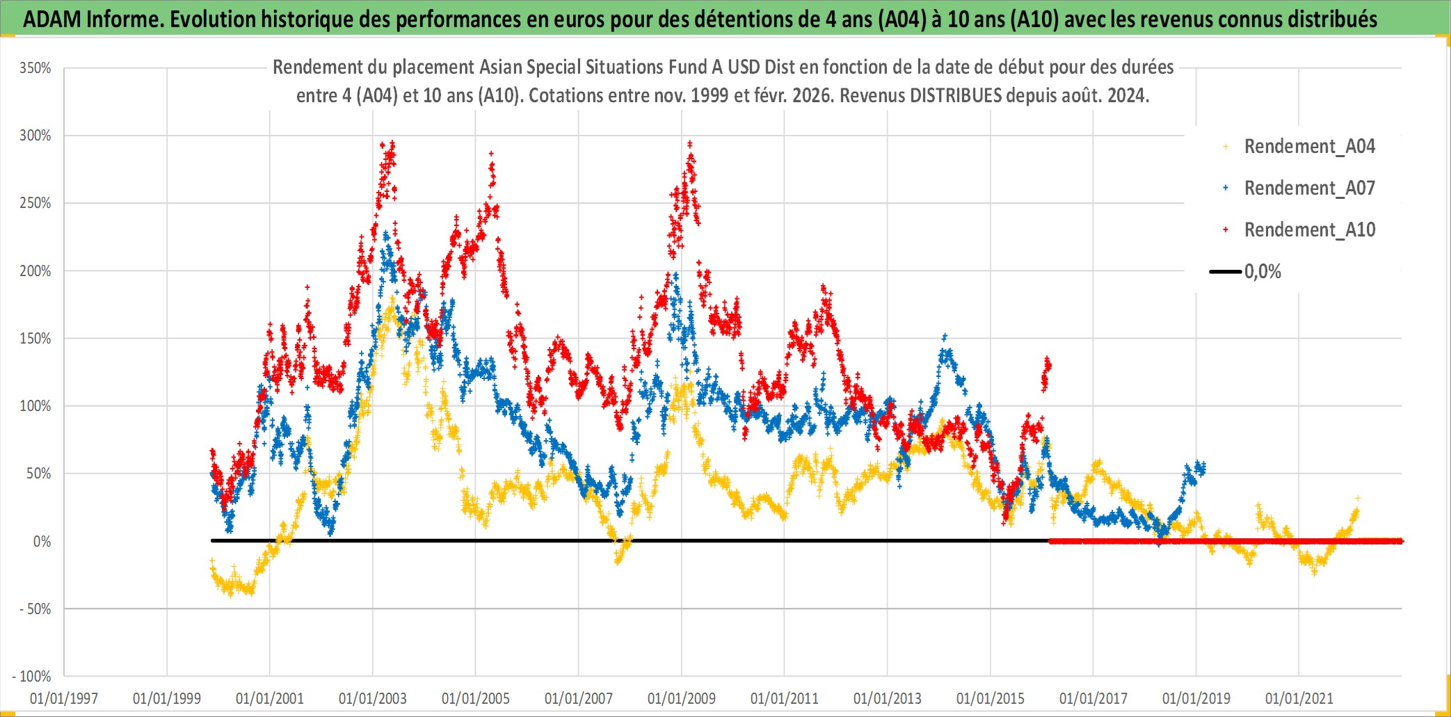 Site dédié aux investisseursPage dédiée sur site financeAnalyse des valorisations hebdomadaires du fonds Asian Special Situations Fund A USD Dist. Cet actif est cote en USD. Les valorisations sont en contrevaleur EURO et couvrent les semaines 1999W44 a 2026W09. Les revenus de cet actif financier sont pris en compte depuis la semaine 2024W31. La note globale ESG de cet actif est estimee a 3.0 (apres rebasage entre 0 et 20).