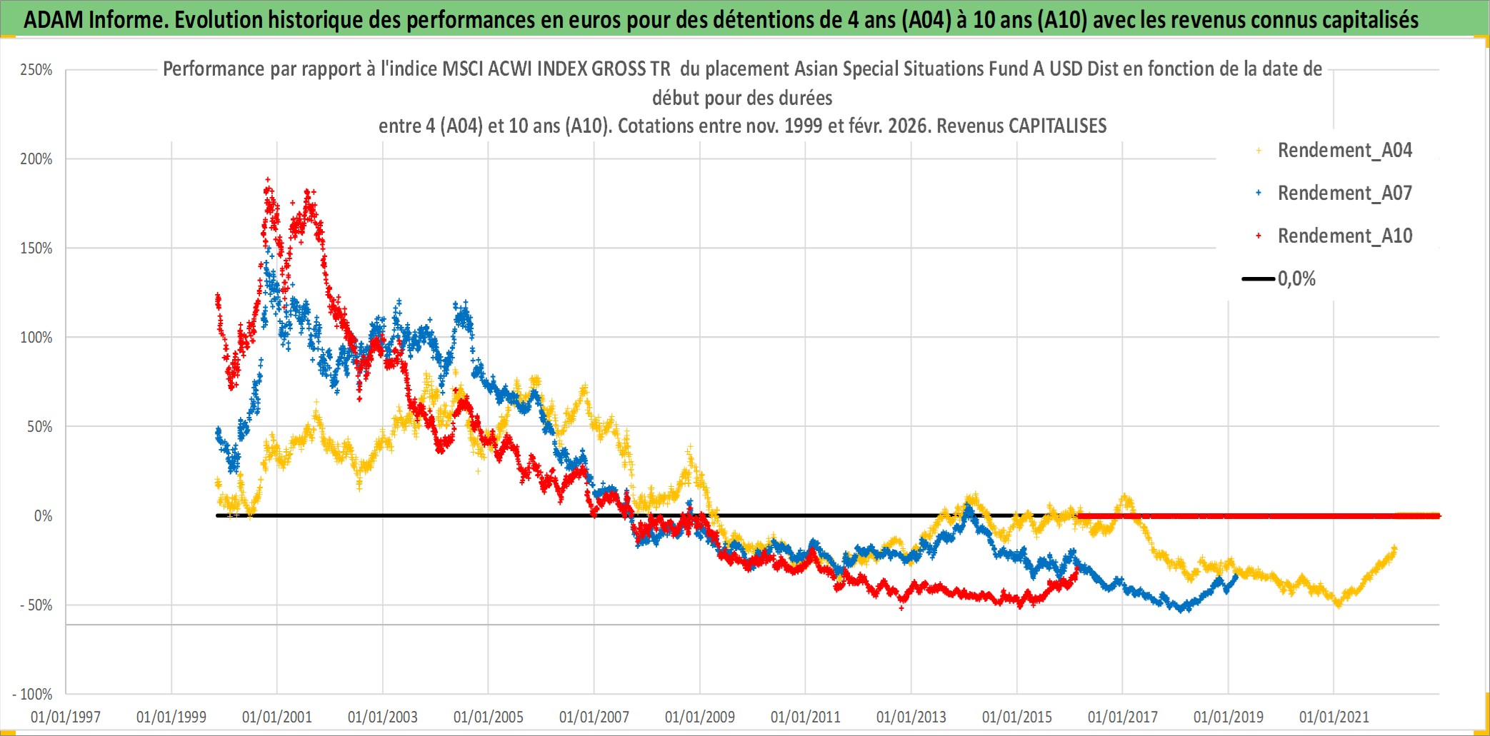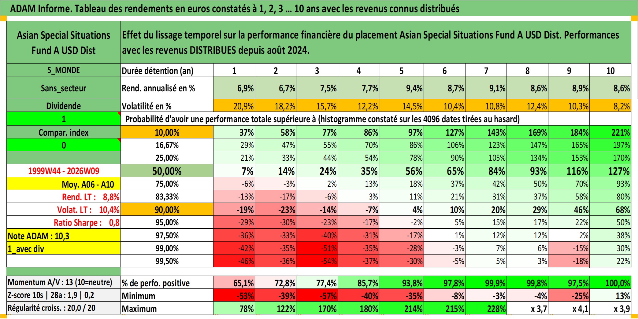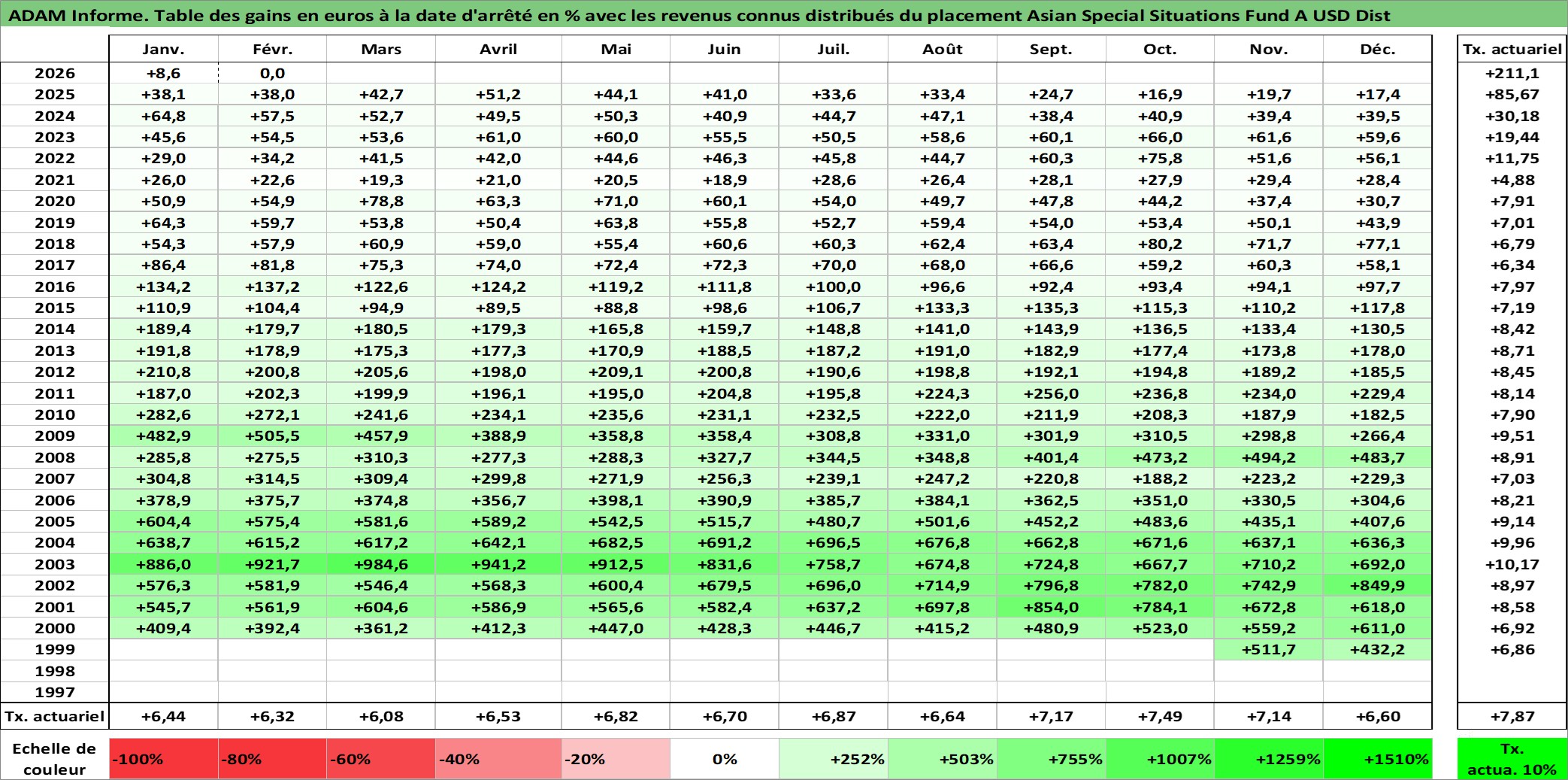 Site dédié aux investisseursPage dédiée sur site financeAnalyse des valorisations hebdomadaires du fonds Asian Special Situations Fund A USD Dist. Cet actif est cote en USD. Les valorisations sont en contrevaleur EURO et couvrent les semaines 1999W44 a 2026W09. Les revenus de cet actif financier sont pris en compte depuis la semaine 2024W31. La note globale ESG de cet actif est estimee a 3.0 (apres rebasage entre 0 et 20).